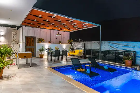 Muhafazakar Villa Kiralik Villa Neon Kalkan Islamlar mevkiinde yer almata olup 4 kisiye kadar konaklama imkani saglamaktadir. Özel havuzlu muhafazakar villamizda keyifli vakit geçirebilmeniz Langirt bulunmkatadir. Doga içerisinde yer almakta olup doga manzarasina hakimdir. Konforlu mobilyalarla dizayn edilmis korunakli villamiz siz degerli misafirlerini beklemektedir