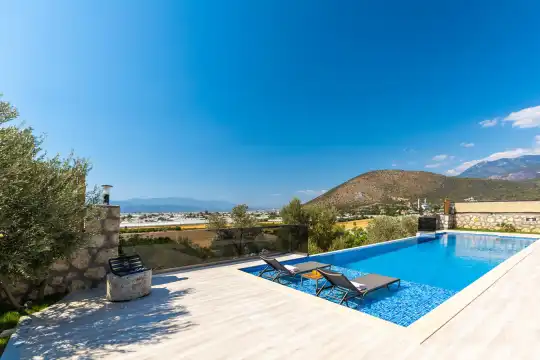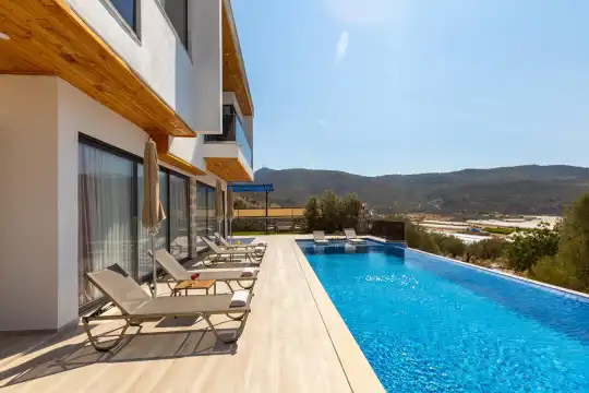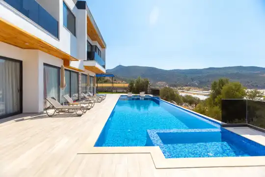 Muhafazakar Villa Kiralik Villa Sandeep Kalkan Yesilköy mevkiinde konumlanan 7 kisi kapasiteli muhafazakar balayi villasidir. Tam donanimli Amerikan mutfagi ve konforlu salonu hizmetinizdedir. Ebeveyn yatak odasinda çift kisilik büyük bir jakuzi yer almaktadir. Havuz bahçe kati korunakli olan villamizda çocuk oyun alani , masa tenisi bulunmaktadir. Doga manzarali villamiz muhafazakar aileler için ideal bir seçenektir. Villamizda kapali isitmali havuz mevcut olup kis aylari için tercih edilebilir bir seçenektir.
