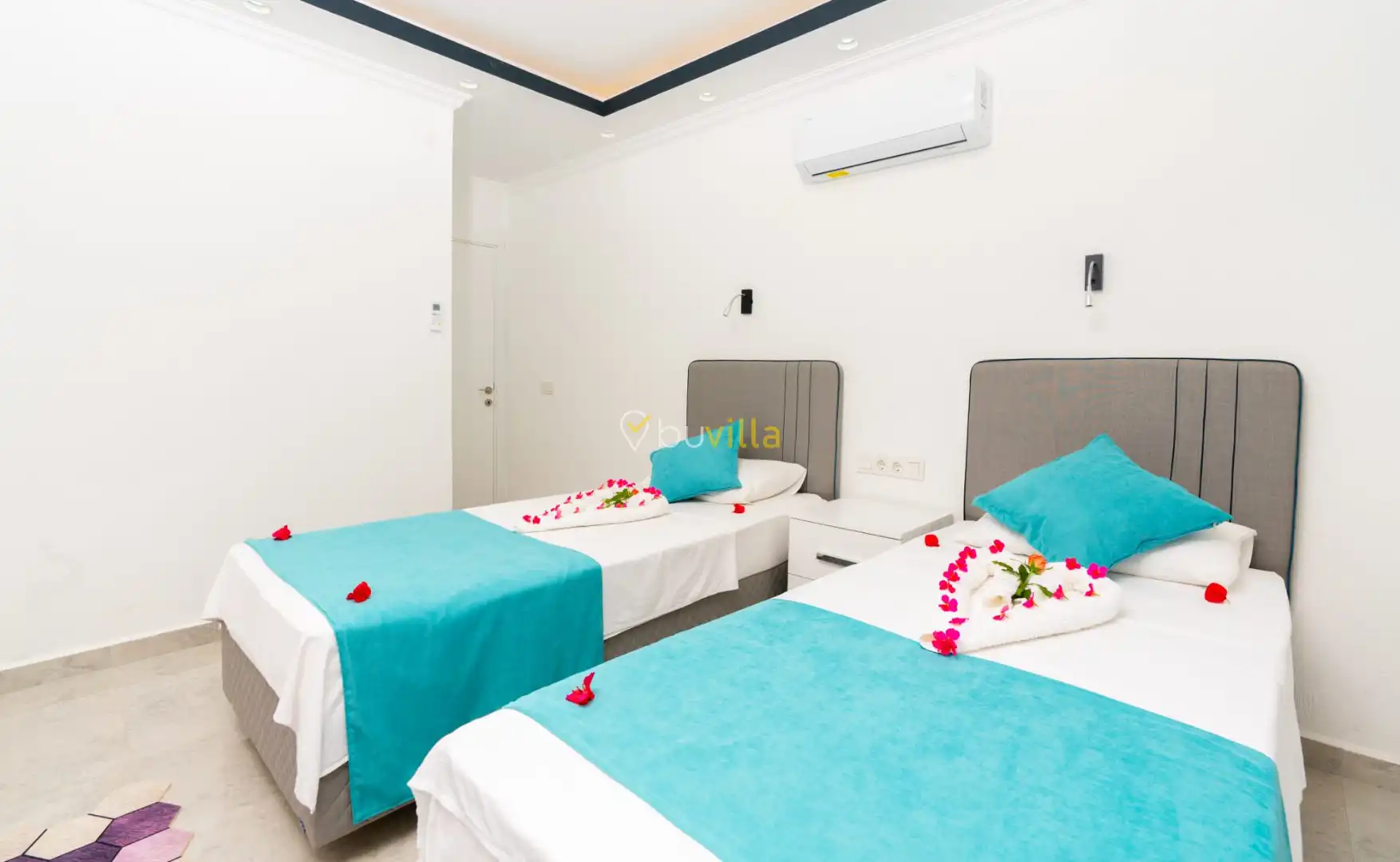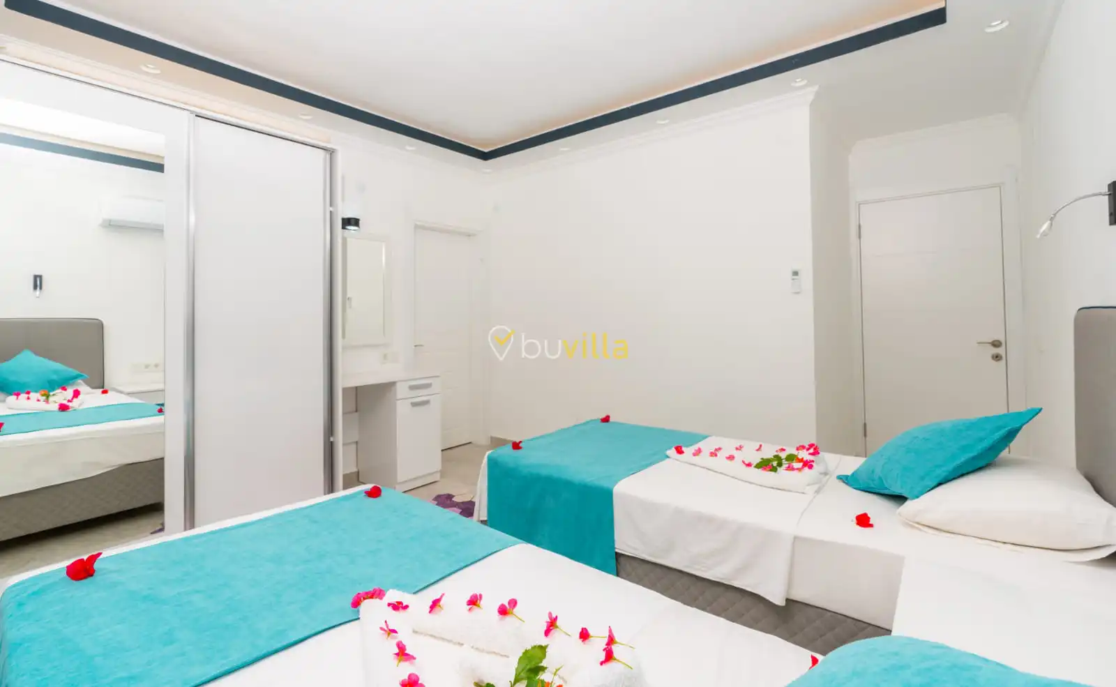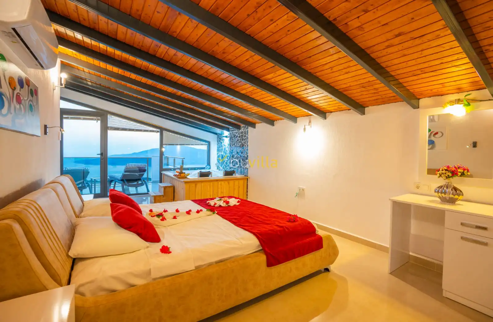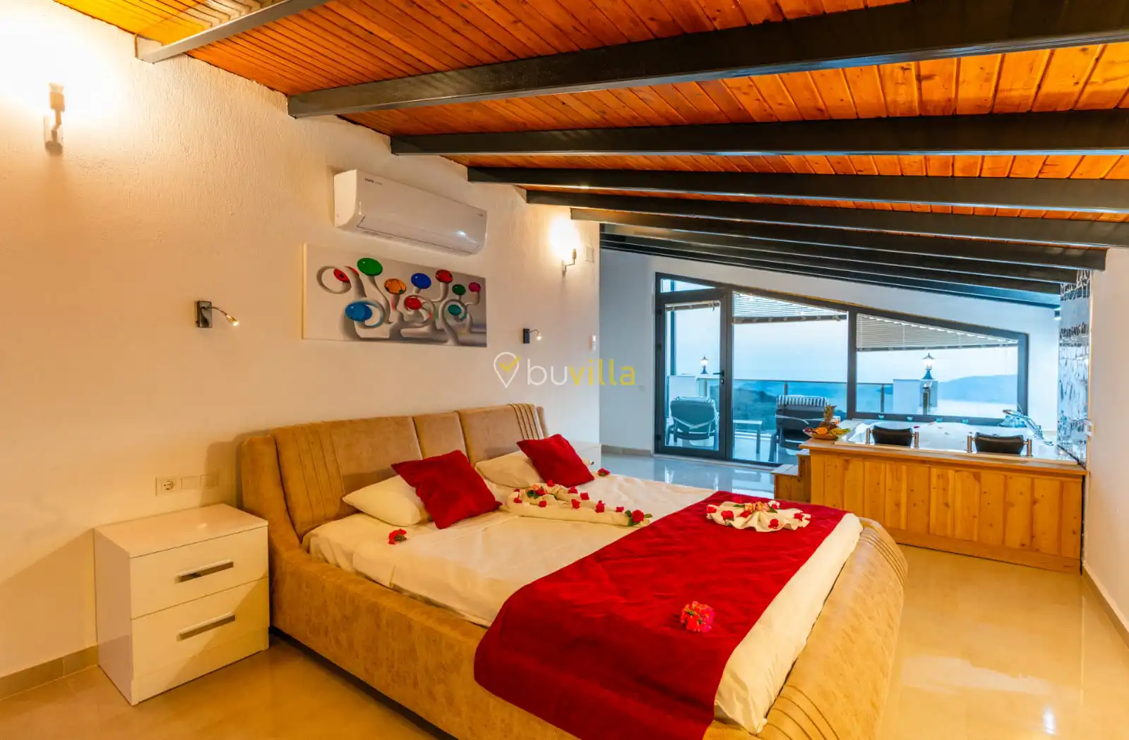 Villamızın yatak odaları, misafir konforu ön planda tutularak tasarlanmıştır. Toplam üç yatak odasının tamamında ebeveyn banyosu bulunmakta olup; odalarda konforlu yataklar, klima ve geniş depolama alanları yer almaktadır. Deniz manzarasına açılan odalar, huzurlu ve dinlendirici bir konaklama deneyimi sunarak tatilinizin kalitesini artırır.
