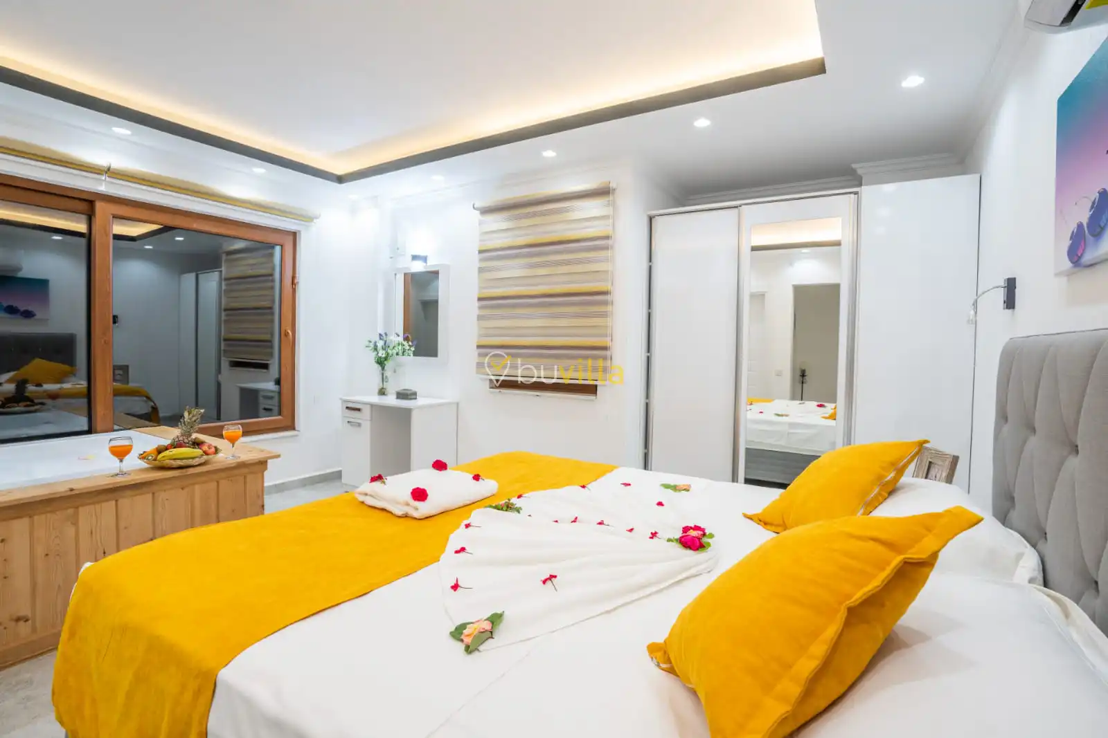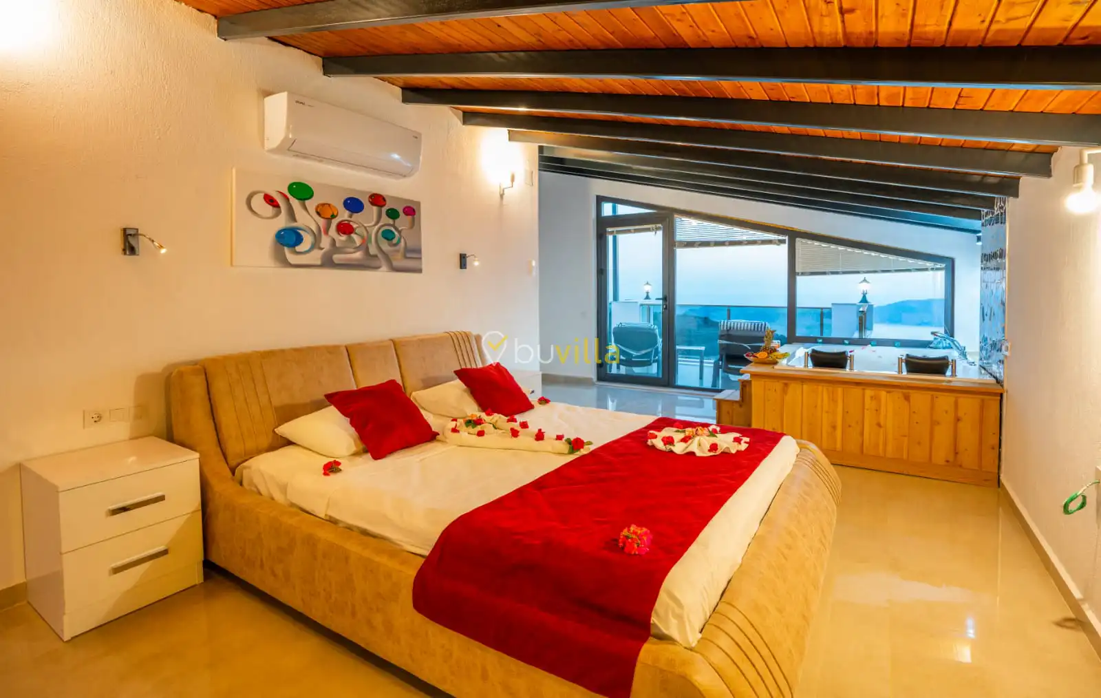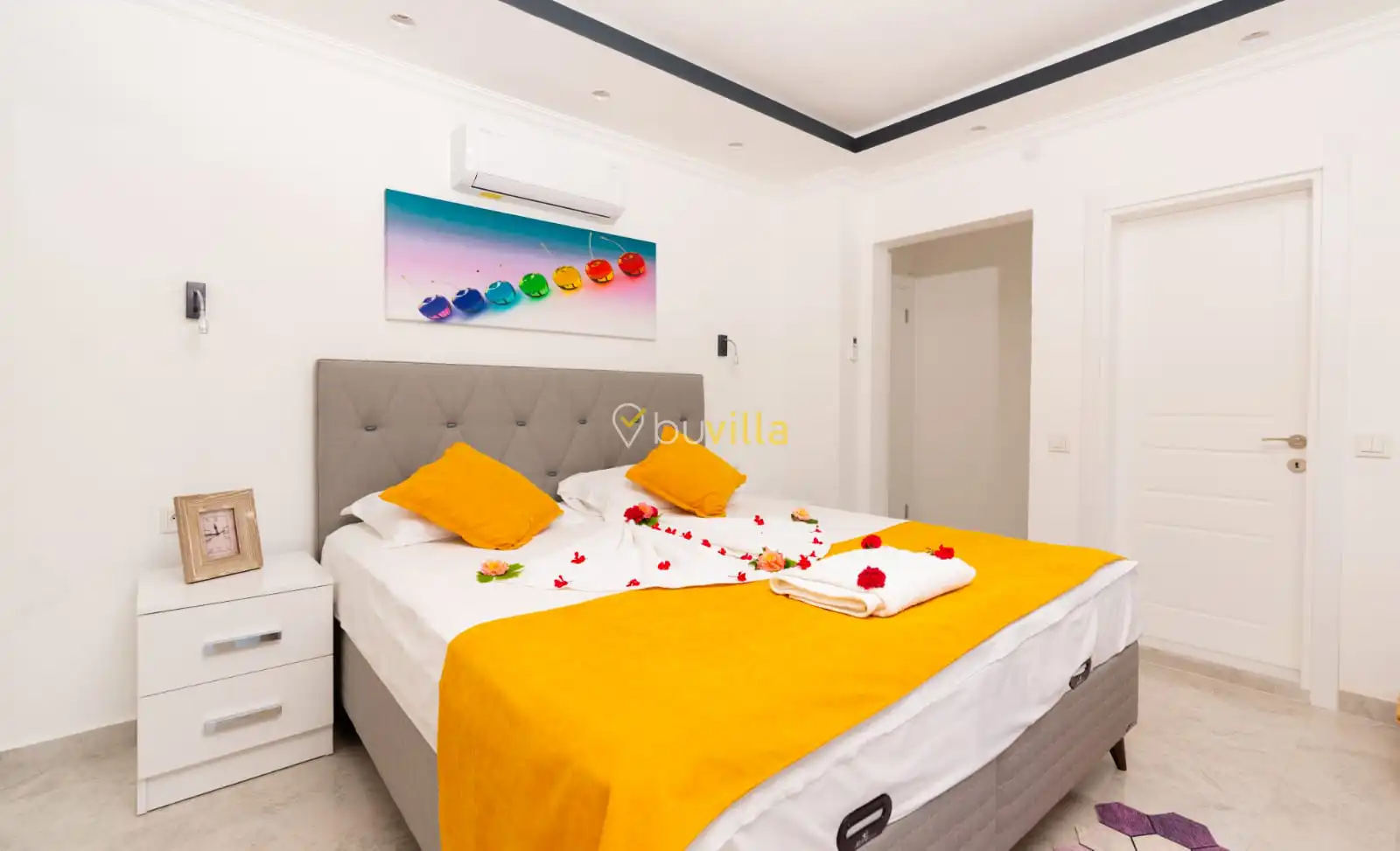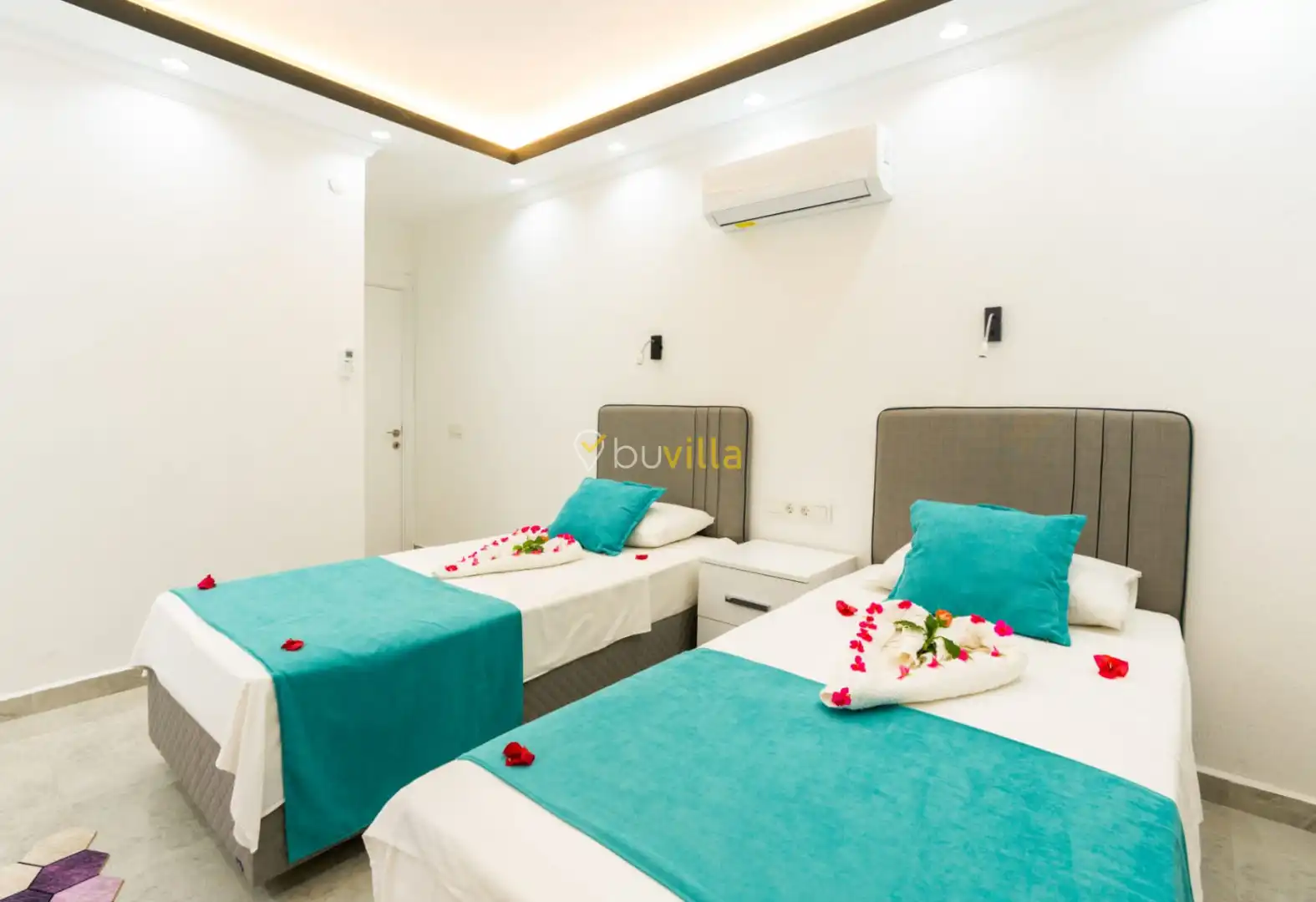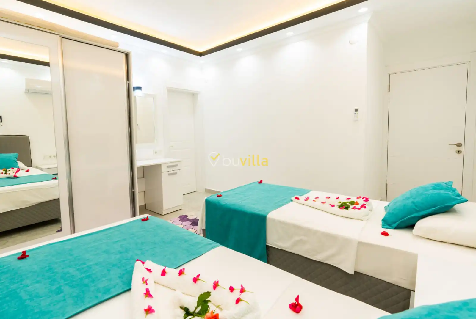 Villamızın yatak odaları, misafir konforu ön planda tutularak tasarlanmıştır. Toplam üç yatak odasının tamamında ebeveyn banyosu bulunmakta olup; odalarda konforlu yataklar, klima ve geniş depolama alanları yer almaktadır. Deniz manzarasına açılan odalar, huzurlu ve dinlendirici bir konaklama deneyimi sunarak tatilinizin kalitesini artırır.