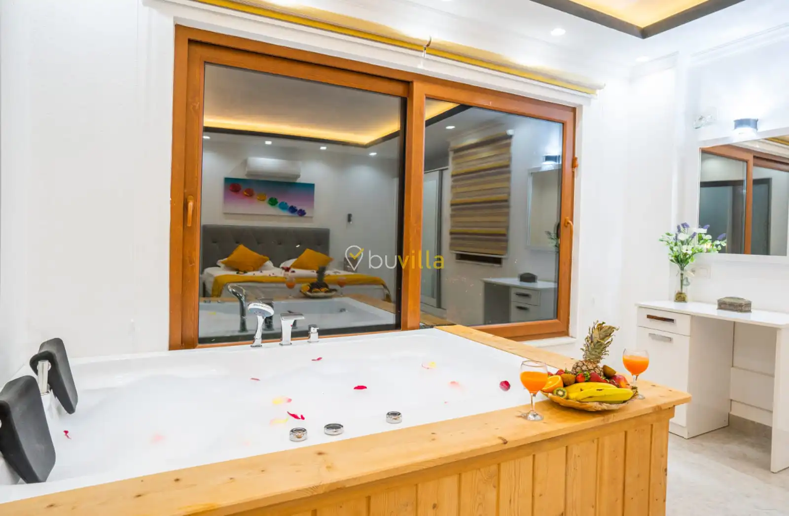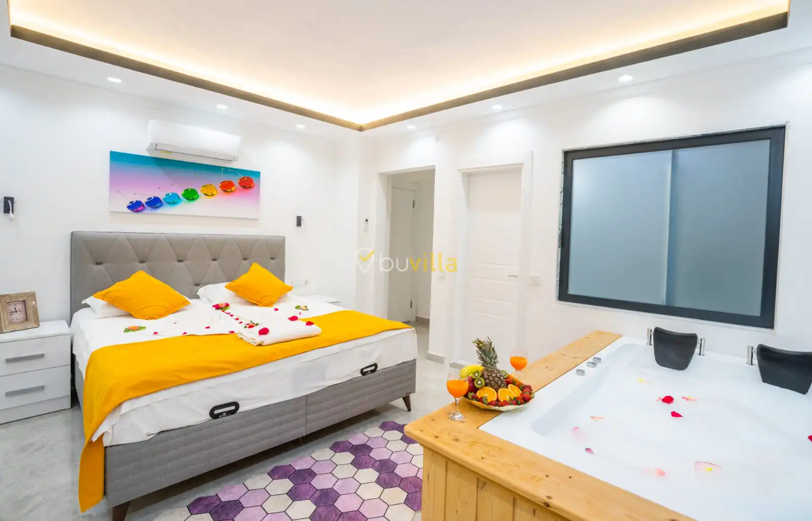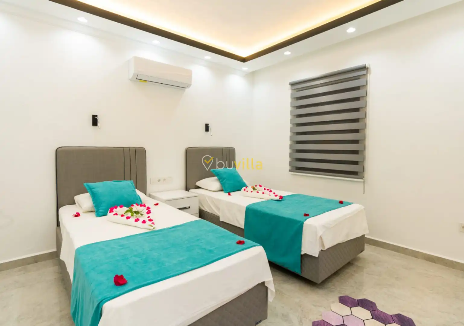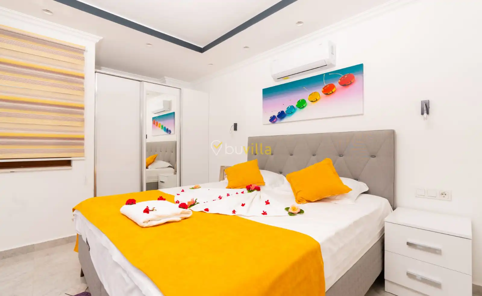 Villamızın yatak odaları, misafir konforu ön planda tutularak tasarlanmıştır. Toplam üç yatak odasının tamamında ebeveyn banyosu bulunmakta olup; odalarda konforlu yataklar, klima ve geniş depolama alanları yer almaktadır. Deniz manzarasına açılan odalar, huzurlu ve dinlendirici bir konaklama deneyimi sunarak tatilinizin kalitesini artırır.