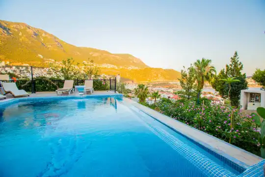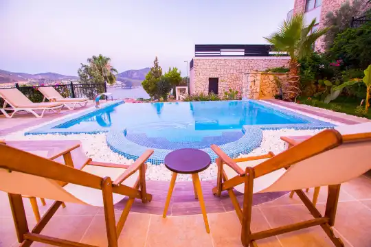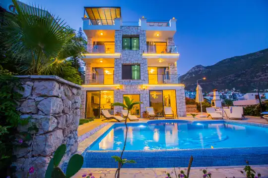 Kalkan Ortaalan mevkiinde yer almakta olup 4 yatak odali 8 kisi kapasitesine sahiptir. Kiralik villamiz modern mimarili ve lüks dizayni ile sizlere muhtesem bir tatil imkani sunmaktadir. Denize oldukça yakin konumda olan villamizin teras katinda jakuzi yer almaktadir. Amerikan mutfaginda ihtiyaç duyabileceginiz tüm ekipmanlar yer almakta olup konforlu mobilyalarla dizayn edilmis salonu hizmetinizdedir.