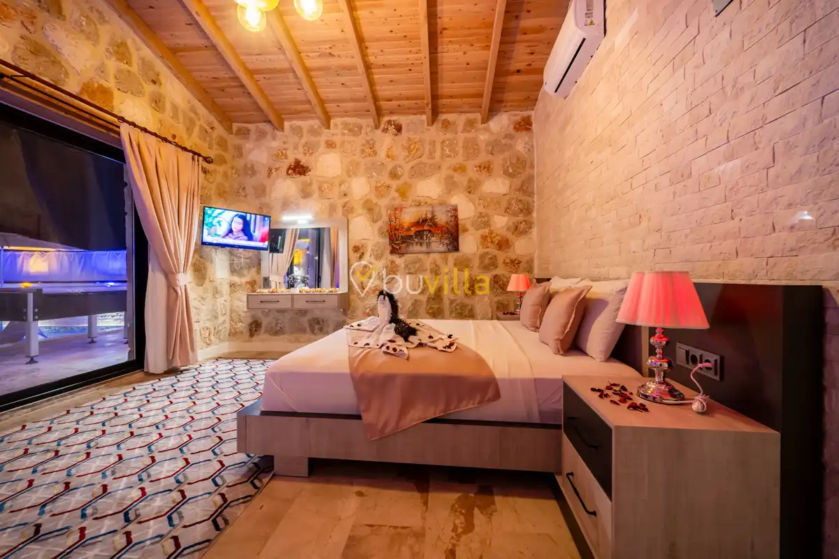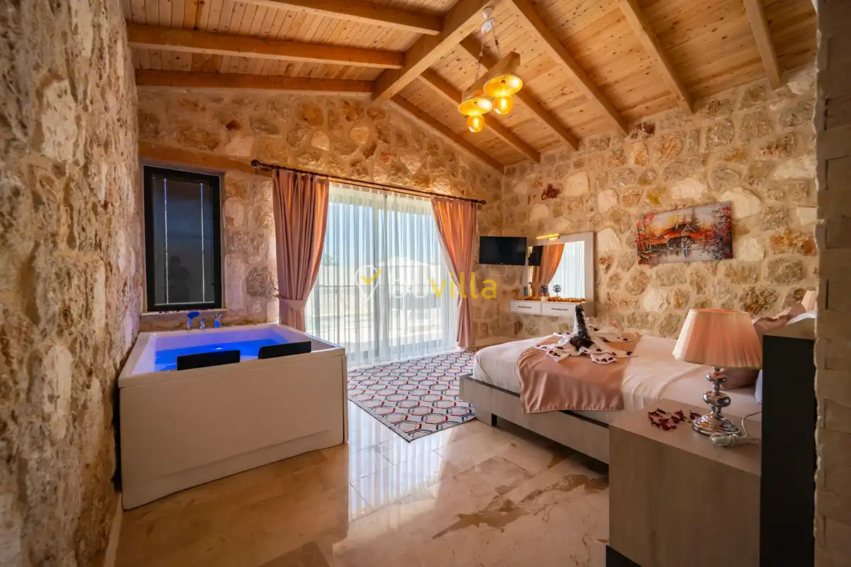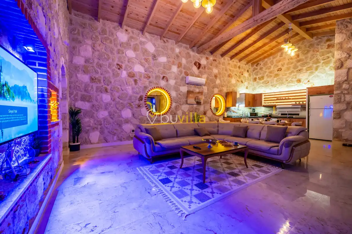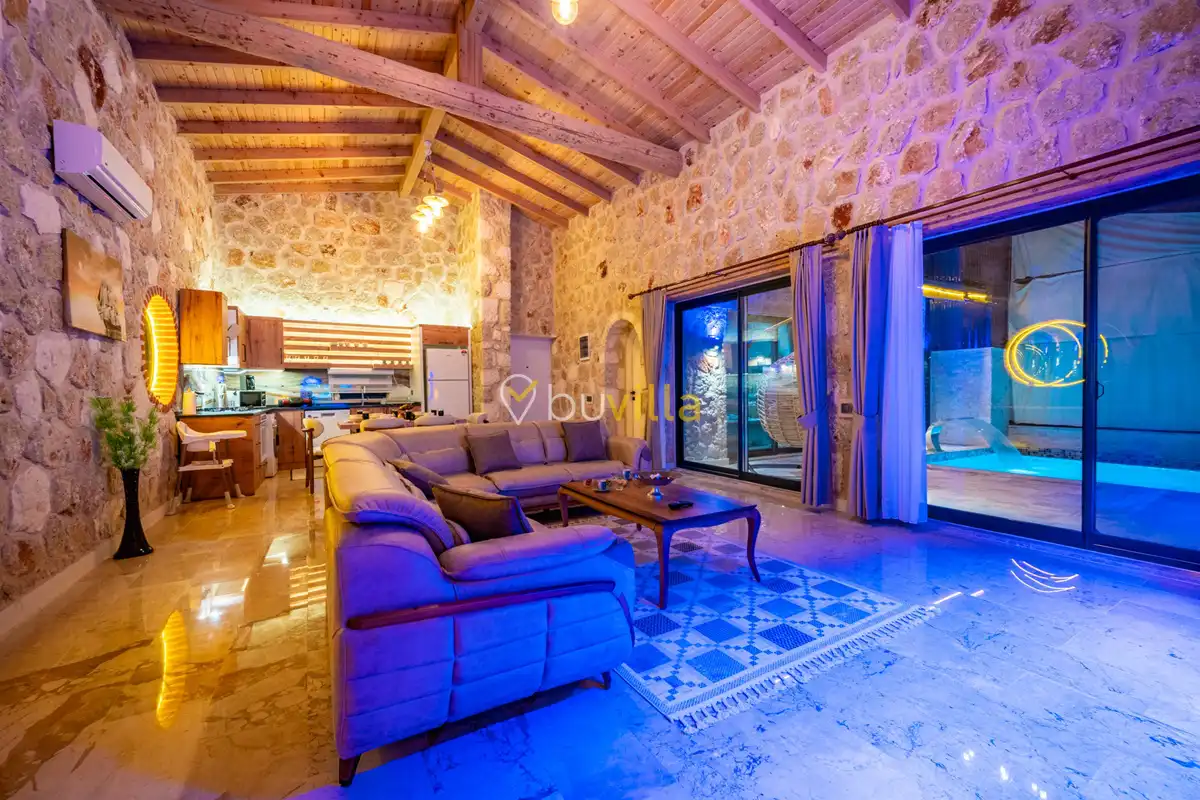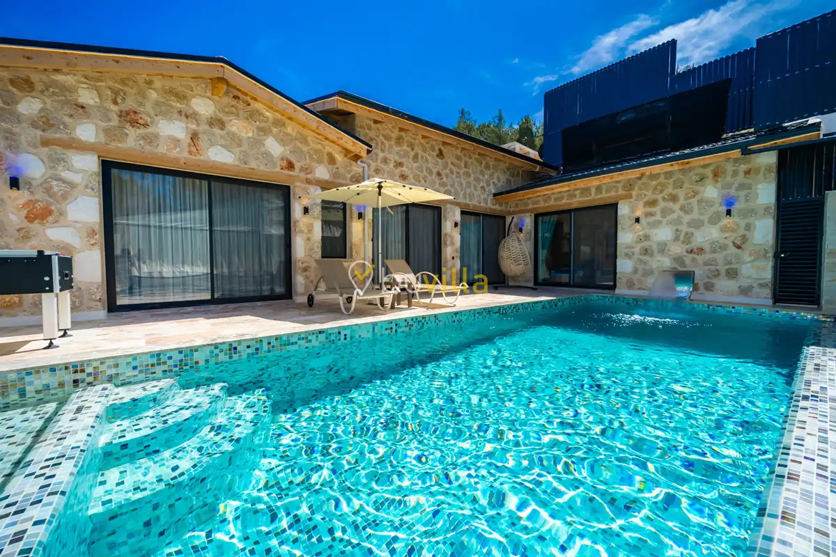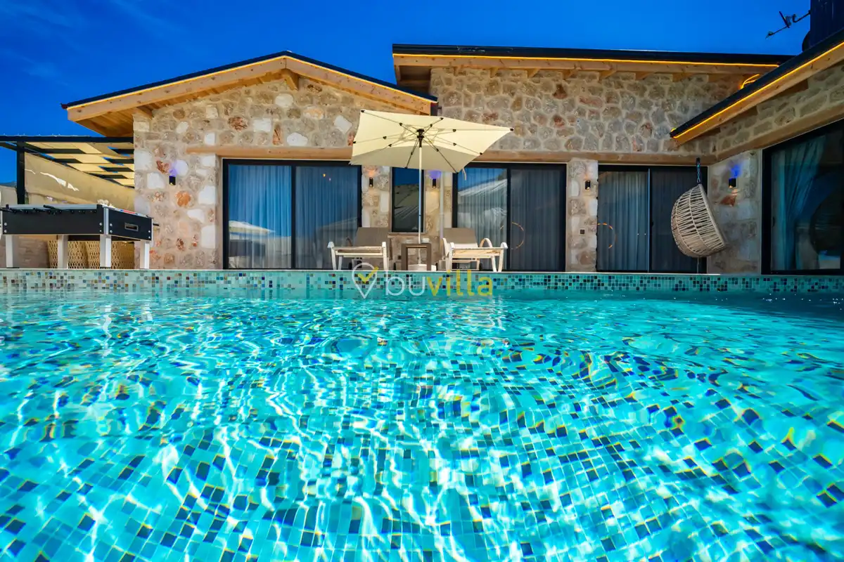 Villa Anemon 1, Kalkan’ın Akbel mevkiinde konumlanan, 2 yatak odalı ve 4 kişilik konaklama kapasitesine sahip özel bir kiralık villadır. Doğa ile uyumlu taş ve ahşap mimarisi sayesinde sıcak ve huzurlu bir atmosfer sunan villamız, sakin bir tatil arayan misafirler için ideal bir seçenektir. Villanın özel havuz terası, misafirlerin rahat ve keyifli vakit geçirebileceği şekilde tasarlanmış olup mahremiyet ön planda tutulmuştur. Ebeveyn yatak odasında yer alan çift kişilik jakuzi, tatilinize konfor ve ayrıcalık katarken dinlenmenizi üst seviyeye taşır.