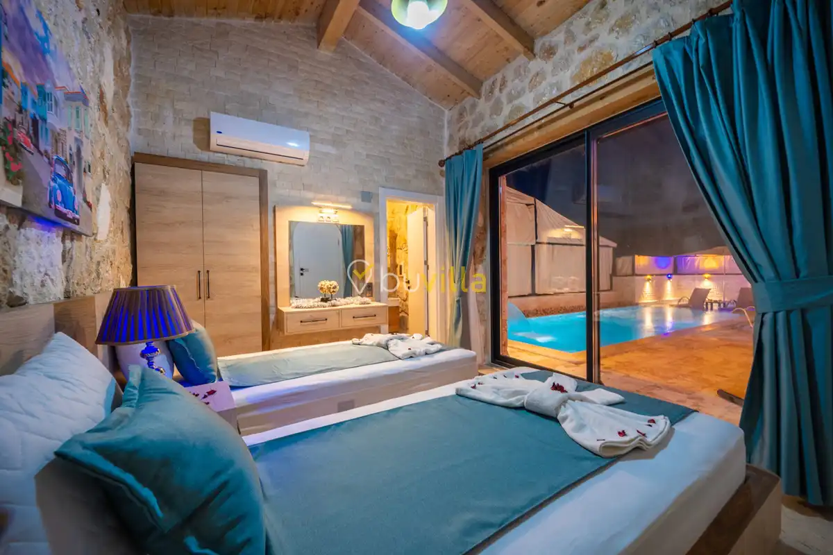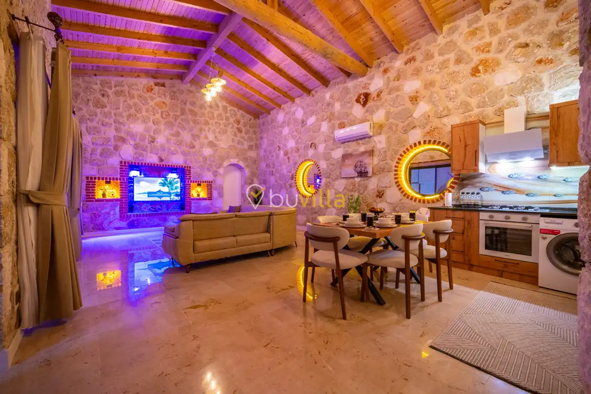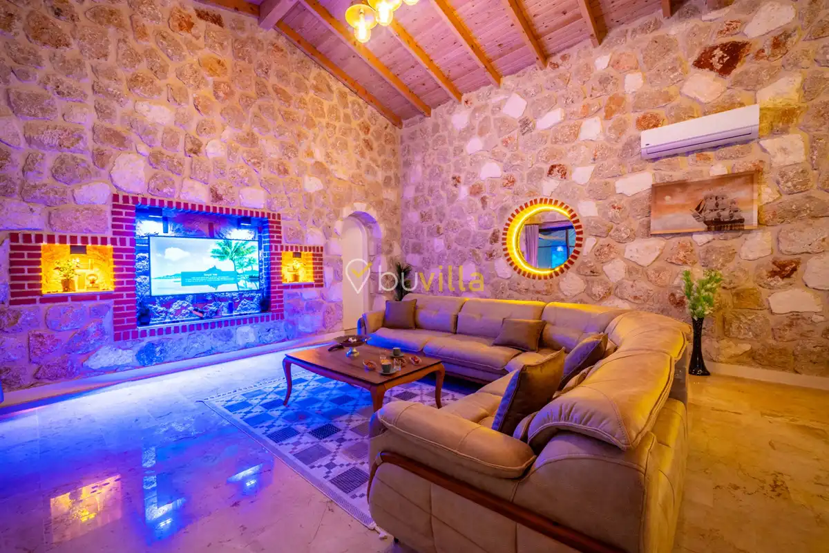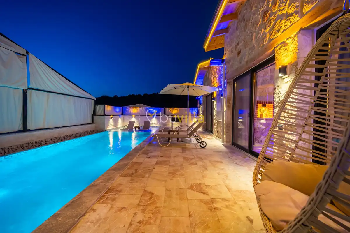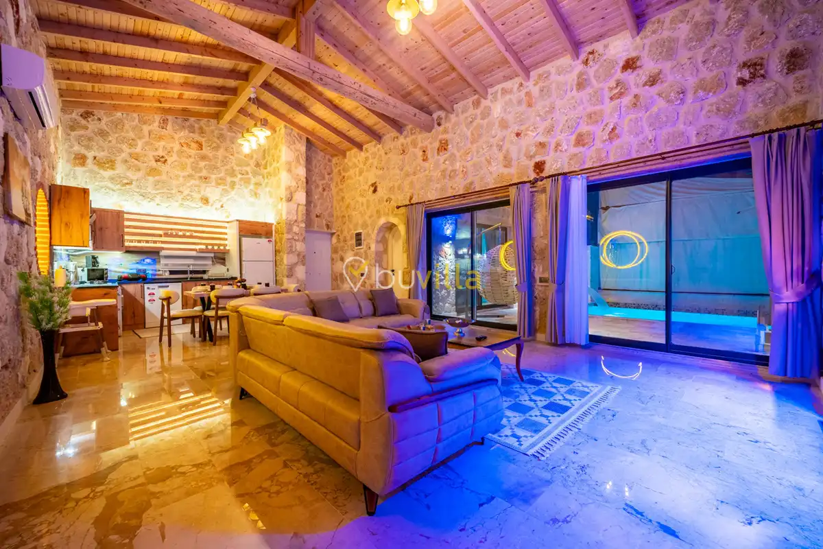 Villa Anemon 1, Kalkan’ın Akbel mevkiinde konumlanan, 2 yatak odalı ve 4 kişilik konaklama kapasitesine sahip özel bir kiralık villadır. Doğa ile uyumlu taş ve ahşap mimarisi sayesinde sıcak ve huzurlu bir atmosfer sunan villamız, sakin bir tatil arayan misafirler için ideal bir seçenektir. Villanın özel havuz terası, misafirlerin rahat ve keyifli vakit geçirebileceği şekilde tasarlanmış olup mahremiyet ön planda tutulmuştur. Ebeveyn yatak odasında yer alan çift kişilik jakuzi, tatilinize konfor ve ayrıcalık katarken dinlenmenizi üst seviyeye taşır.