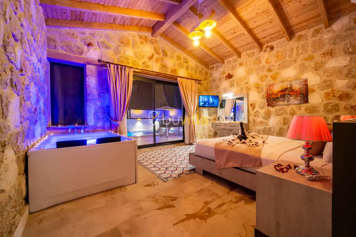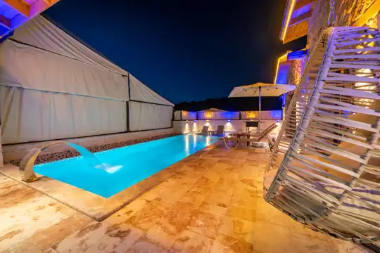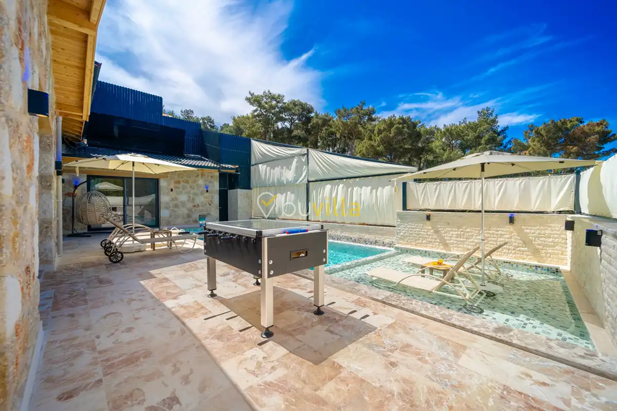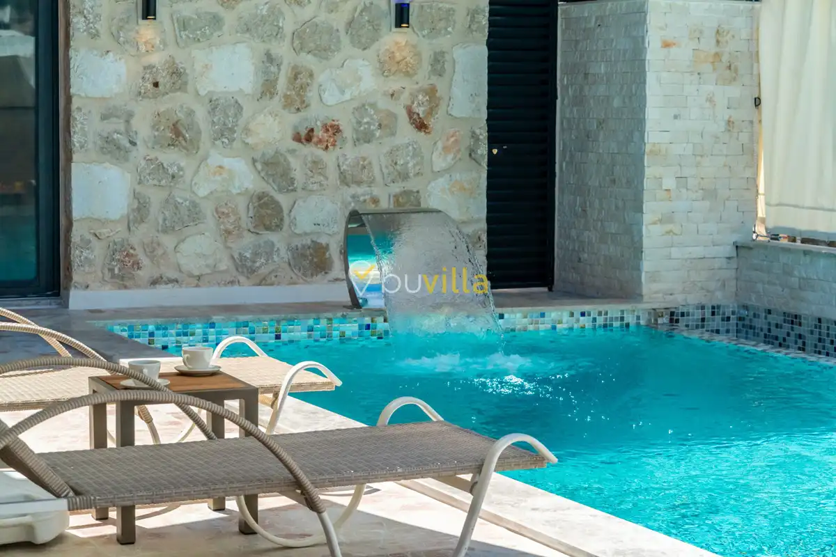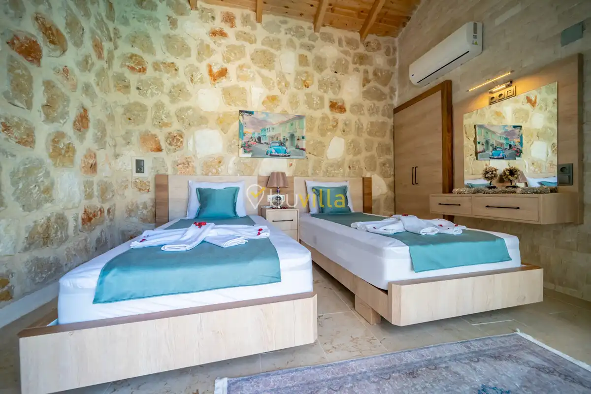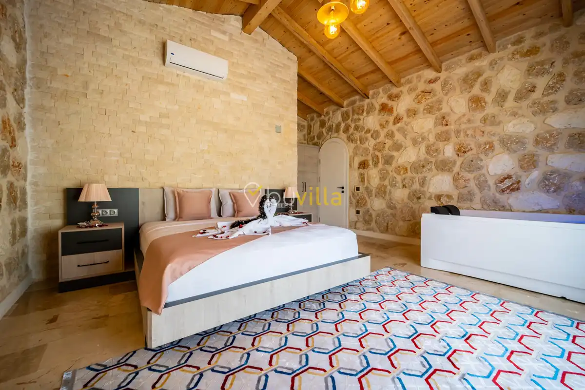 Villa Anemon 1, Kalkan’ın Akbel mevkiinde konumlanan, 2 yatak odalı ve 4 kişilik konaklama kapasitesine sahip özel bir kiralık villadır. Doğa ile uyumlu taş ve ahşap mimarisi sayesinde sıcak ve huzurlu bir atmosfer sunan villamız, sakin bir tatil arayan misafirler için ideal bir seçenektir. Villanın özel havuz terası, misafirlerin rahat ve keyifli vakit geçirebileceği şekilde tasarlanmış olup mahremiyet ön planda tutulmuştur. Ebeveyn yatak odasında yer alan çift kişilik jakuzi, tatilinize konfor ve ayrıcalık katarken dinlenmenizi üst seviyeye taşır.