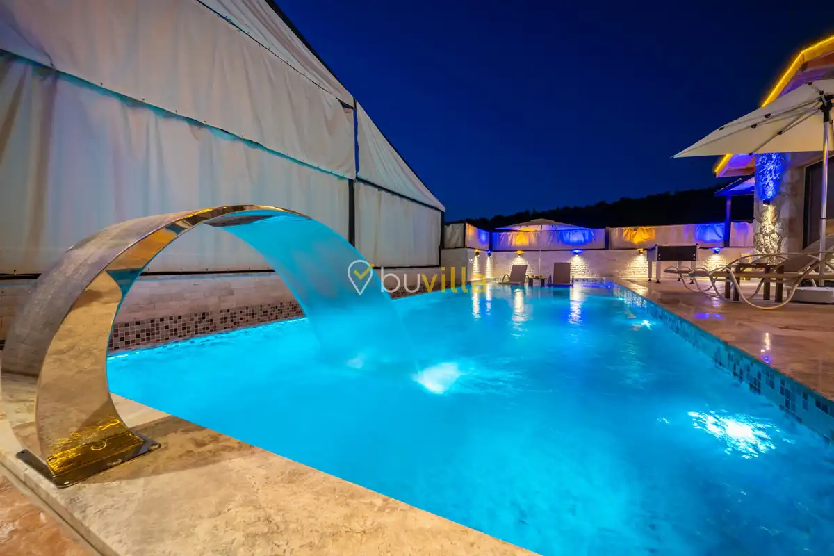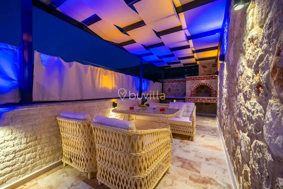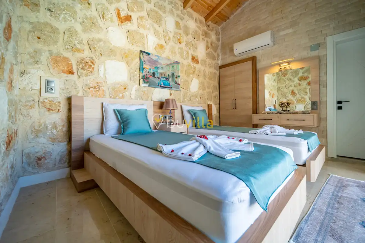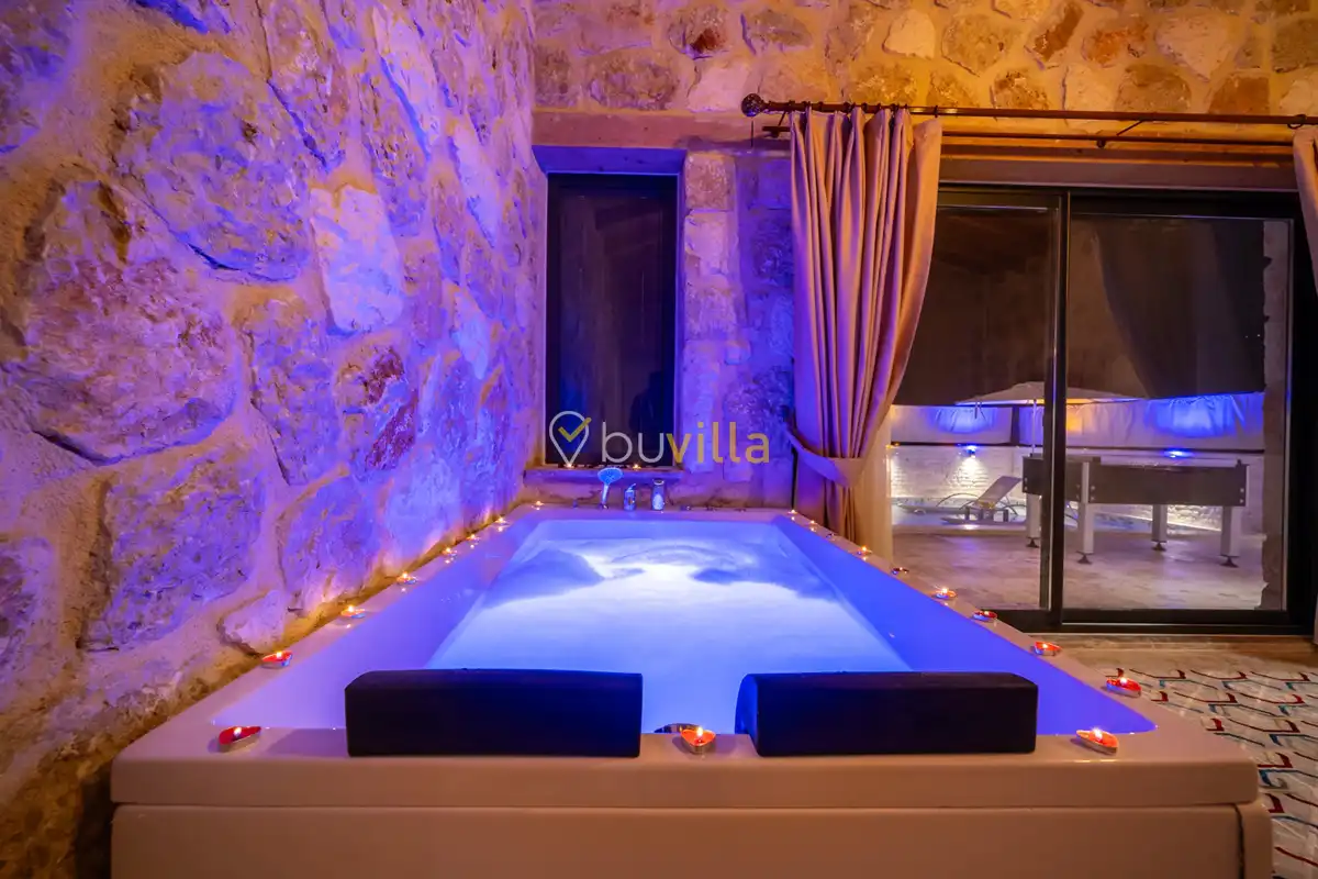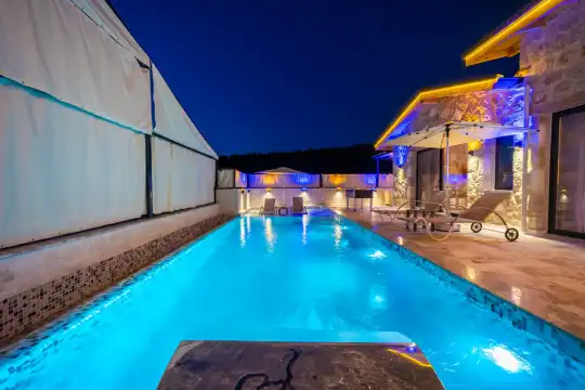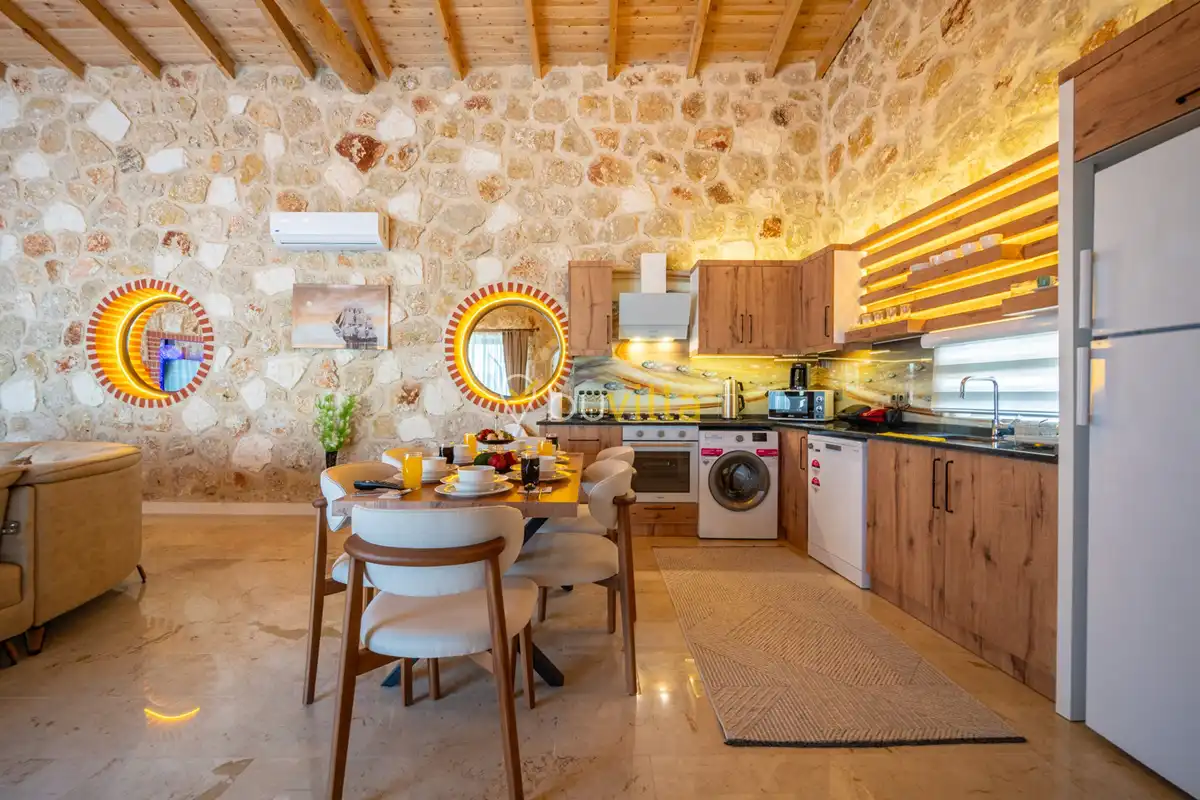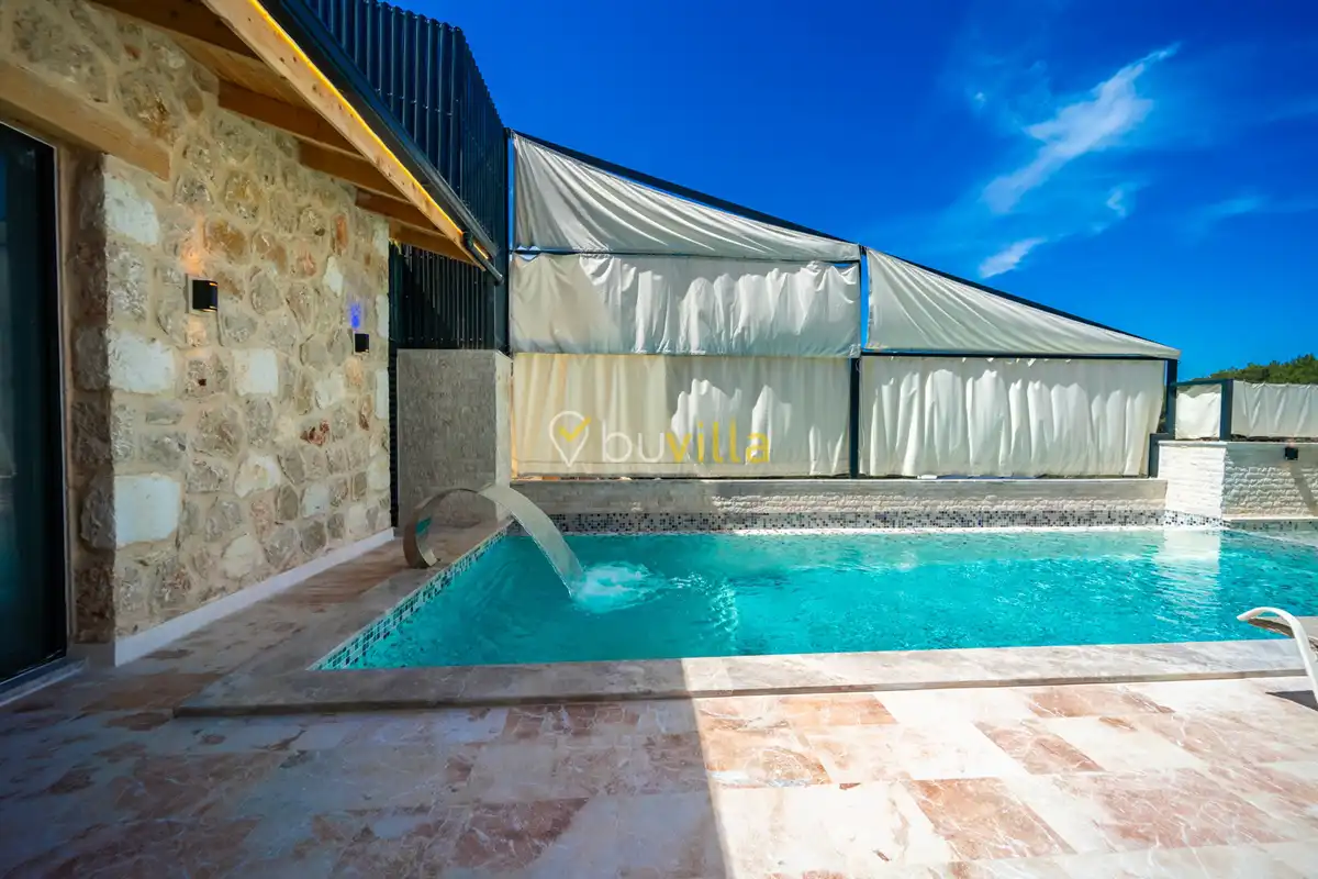 Villa Anemon 1, Kalkan’ın Akbel mevkiinde konumlanan, 2 yatak odalı ve 4 kişilik konaklama kapasitesine sahip özel bir kiralık villadır. Doğa ile uyumlu taş ve ahşap mimarisi sayesinde sıcak ve huzurlu bir atmosfer sunan villamız, sakin bir tatil arayan misafirler için ideal bir seçenektir. Villanın özel havuz terası, misafirlerin rahat ve keyifli vakit geçirebileceği şekilde tasarlanmış olup mahremiyet ön planda tutulmuştur. Ebeveyn yatak odasında yer alan çift kişilik jakuzi, tatilinize konfor ve ayrıcalık katarken dinlenmenizi üst seviyeye taşır.
