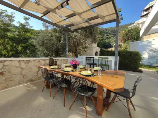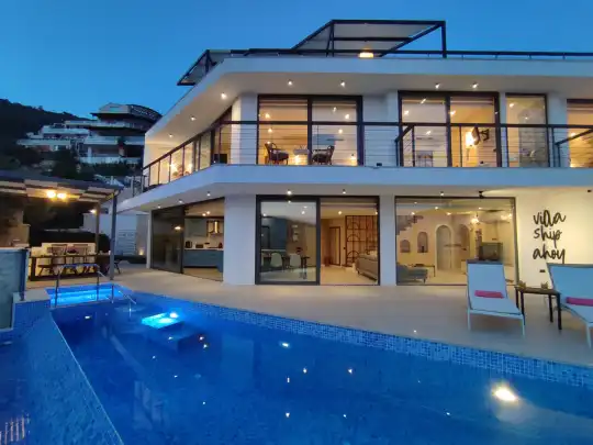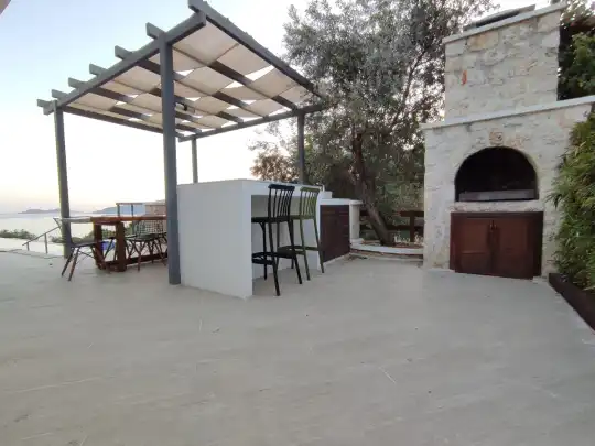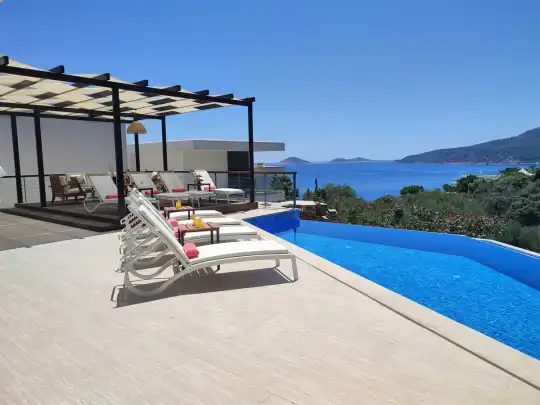 Deniz Manzarali Villa Kiralik Villa Antonia, Kalkan Kalamar mevkiindedir. 4 yatak odali 8 kisiye kadar konaklama imkani sunan villamiz kalabalik aileler ve arkadas gruplari için idealdir. Muhtesem deniz manzarasina hakim olan villamizin Modern Amerikan mutfaginda ihtiyaç duyabileceginiz tüm ekipmanlar yer almakta olup konforlu mobilyalarla dizayn edilmis salonu hizmetinizdedir.