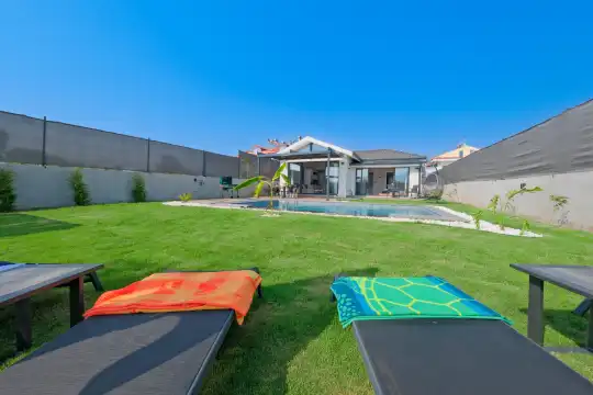 Merkezi konumuyla dikkat çeken villamız, geniş ve ferah bahçesiyle keyifli bir tatil sunmaktadır. Bahçe alanında kapasiteye uygun şezlong takımı, oturma grubu, salıncak ve barbekü alanı bulunmaktadır. Havuz alanı tamamen korunaklı olup, misafirlerimize özel bir alan sunmaktadır. Villamızın iç tasarımı da en az dış mekanı kadar konforlu ve şık bir şekilde dizayn edilmiştir. Havuz terasına açılan geniş oturma odası, tam donanımlı mutfağı ve modern dekorasyonu ile konforunuz ön planda tutulmuştur. Bir yatak odasında çift kişilik yatak, ikinci yatak odasında ise yine çift kişilik yatak yer almaktadır.