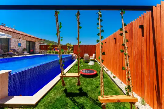 Kalkan Saribelen mevkiinde bulunan villamiz 2 yatak odali 4 kisi konaklama kapasitesine sahiptir. Villamiz doga içerisinde konumlandirilmis genis havuz ve bahçe terasina sahiptir. Çocuklu aile ve arkadas gruplari için uygun olan villamizin etrafi korunakli muhafazakâr villa seçeneklerimiz arasindadir. Bahçe alaninda masa tenisi, çocuk oyun parki mevcut olup villanin içerisinde sauna yer almaktadir. Tas mimariye sahip otantik villamiz siz degerli misafilerini beklemektedir.