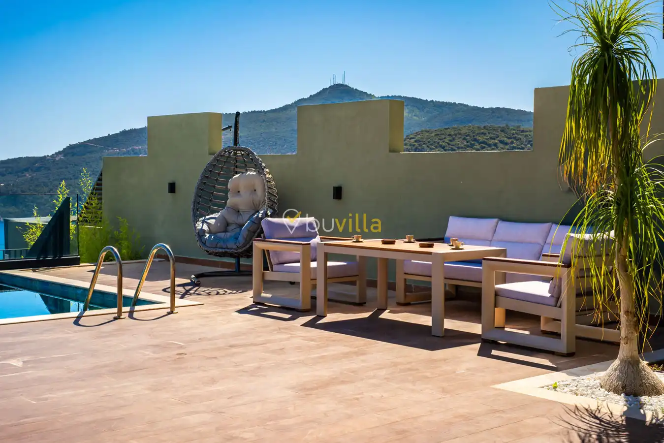 Geniş bahçesi ve havuz terası, misafirlerine huzurlu ve keyifli bir tatil ortamı sunarken; oturma grubu, şezlonglar, güneş şemsiyesi ve salıncak gibi olanaklarla donatılmıştır. Ayrıca, villamız özel otoparka sahiptir ve yerel marketlere yürüme mesafesinde bulunmasıyla avantaj sağlamaktadır.