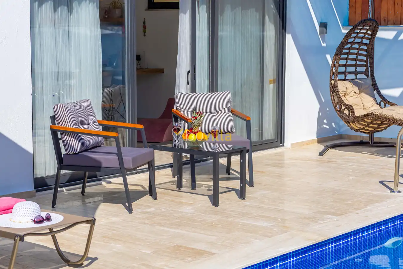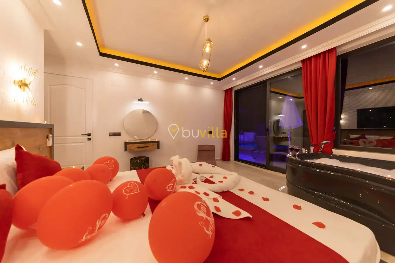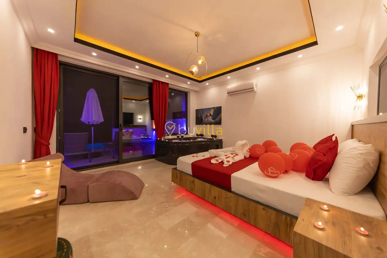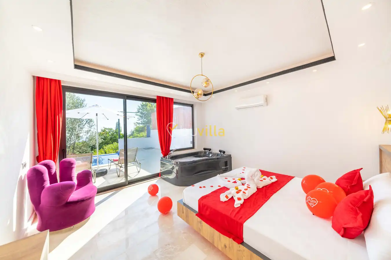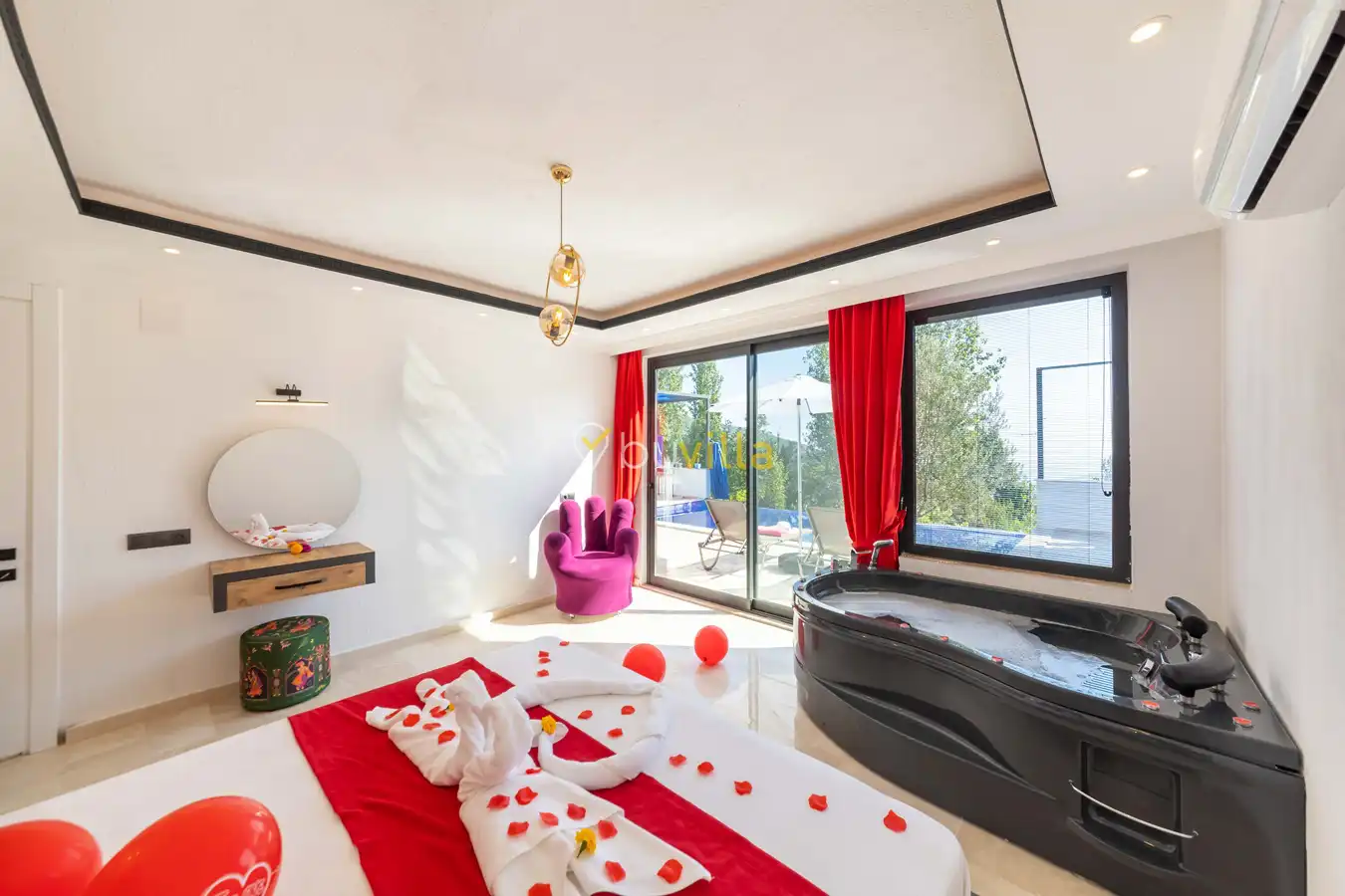 Özel yüzme havuzu ve havuz terası dışarıdan görünmeyecek şekilde planlanmış olup, sakin ve rahat bir tatil atmosferi sunar. Yatak odasında yer alan jakuzi detayı ise tatilinize ekstra konfor ve romantik bir dokunuş katmaktadır.