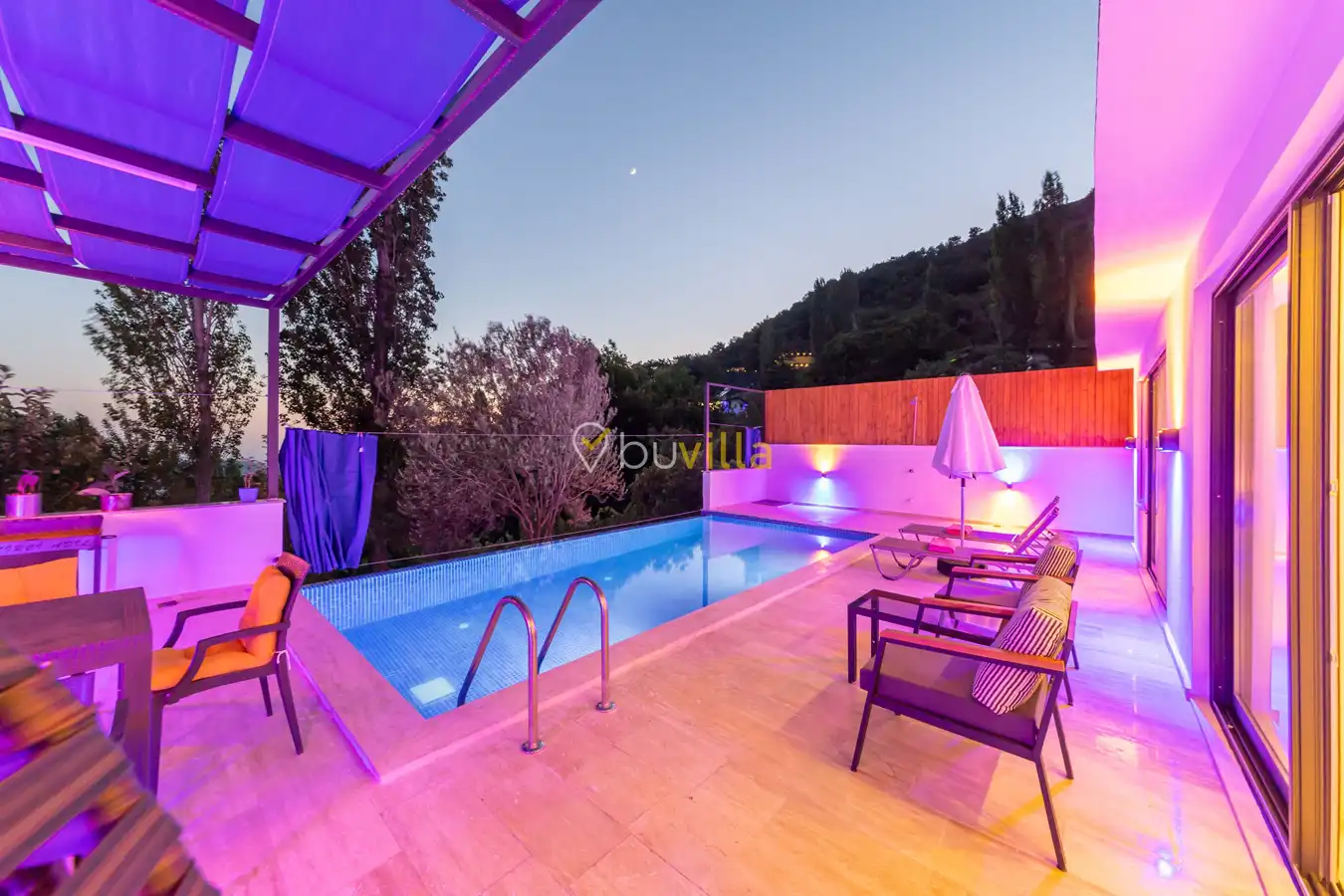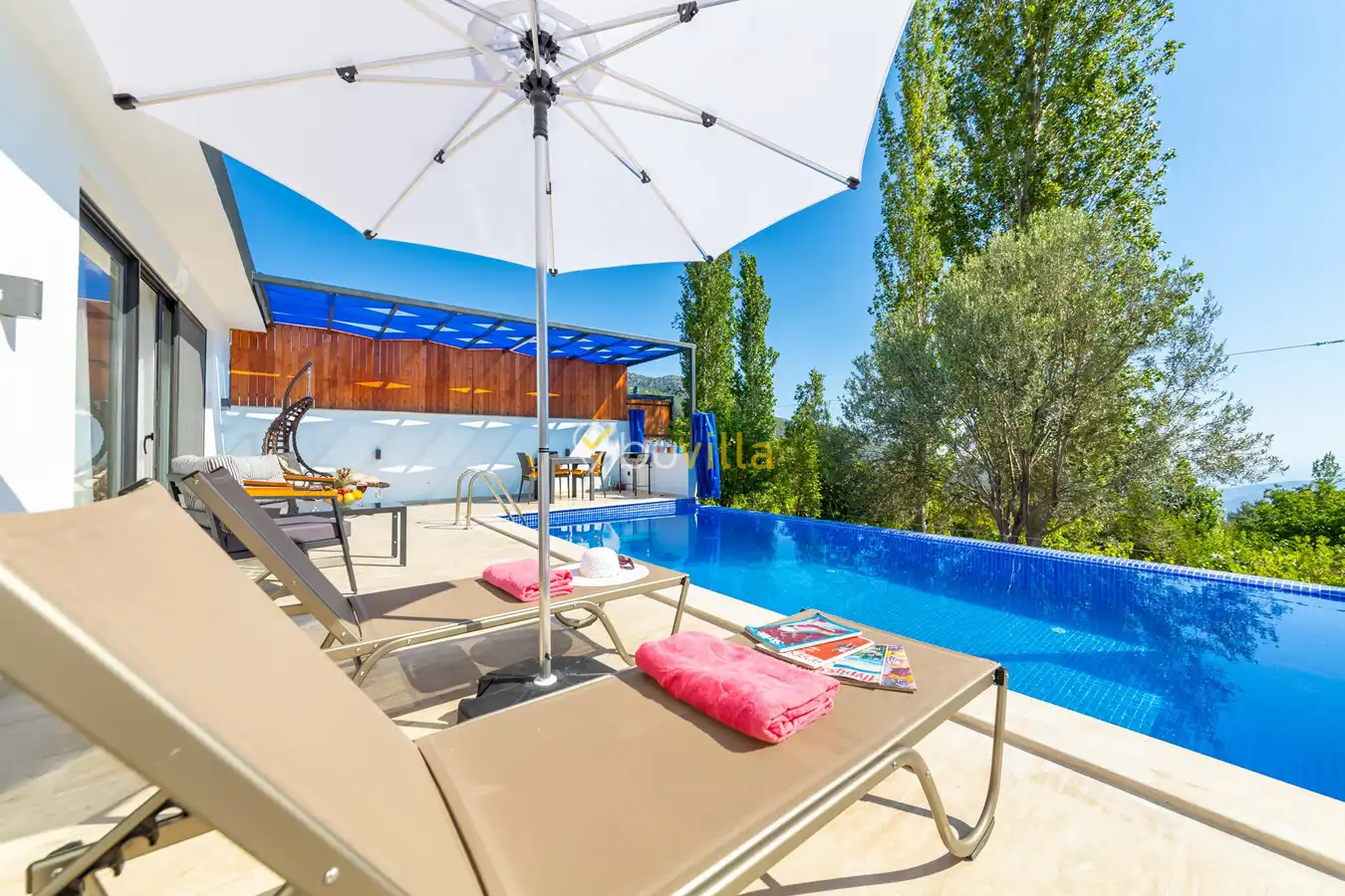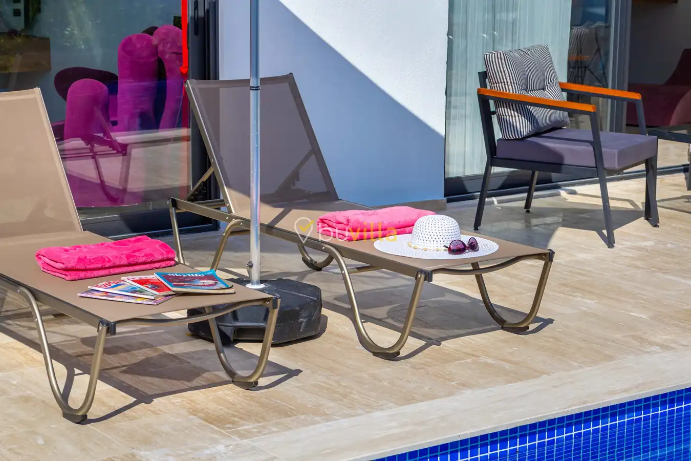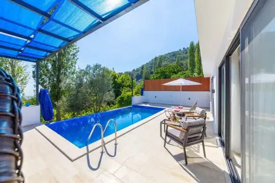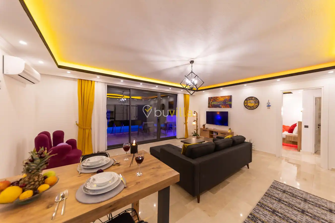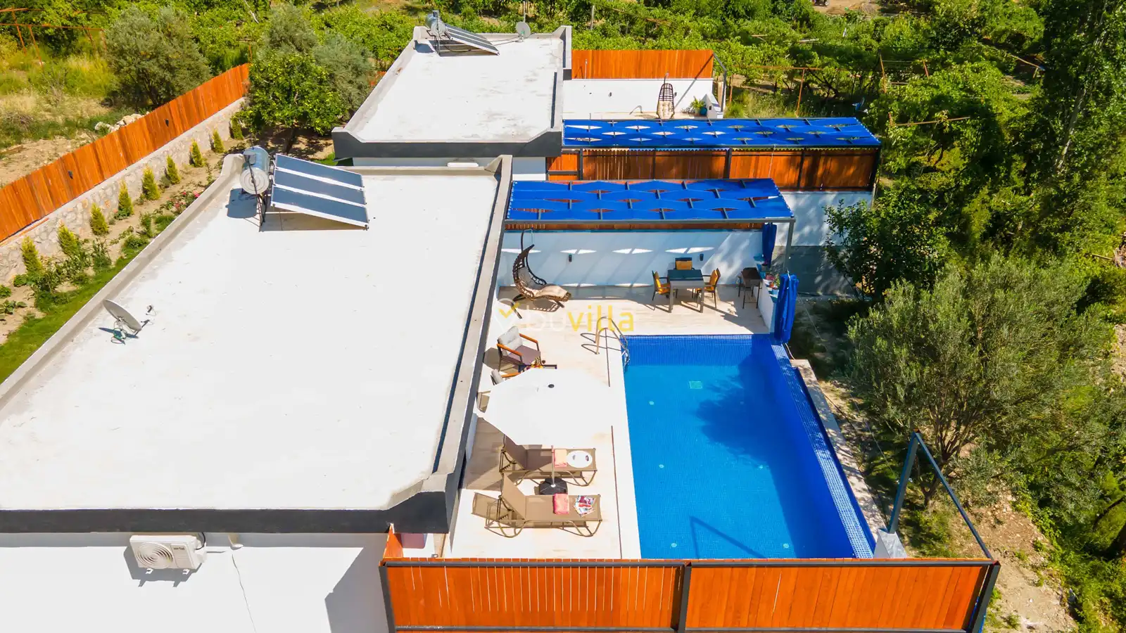 Özel yüzme havuzu ve havuz terası dışarıdan görünmeyecek şekilde planlanmış olup, sakin ve rahat bir tatil atmosferi sunar. Yatak odasında yer alan jakuzi detayı ise tatilinize ekstra konfor ve romantik bir dokunuş katmaktadır.