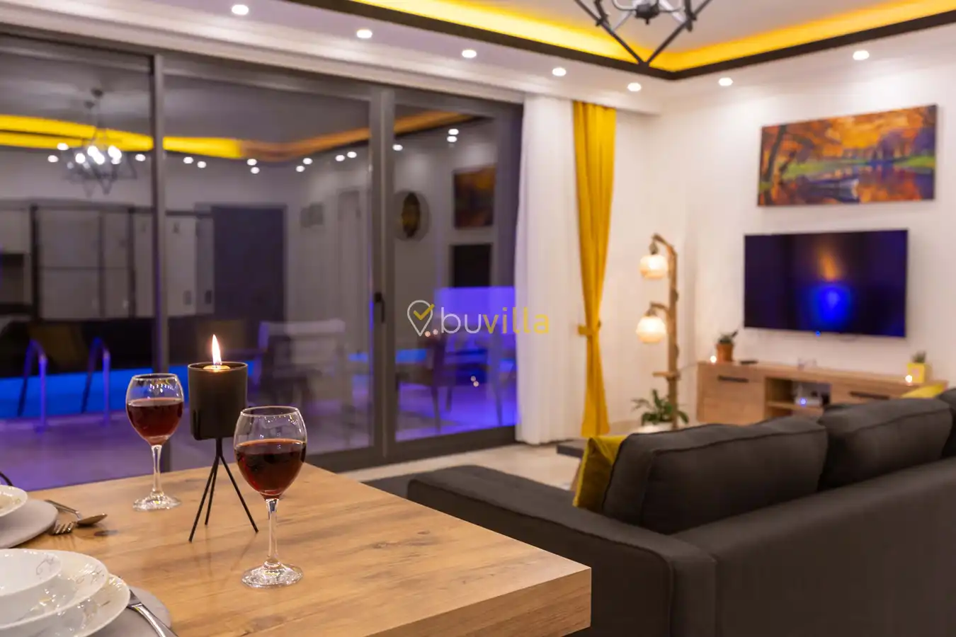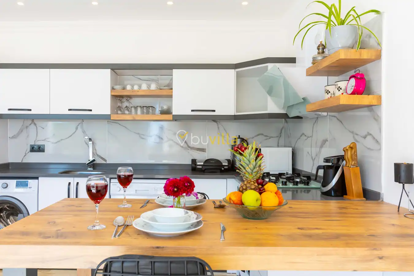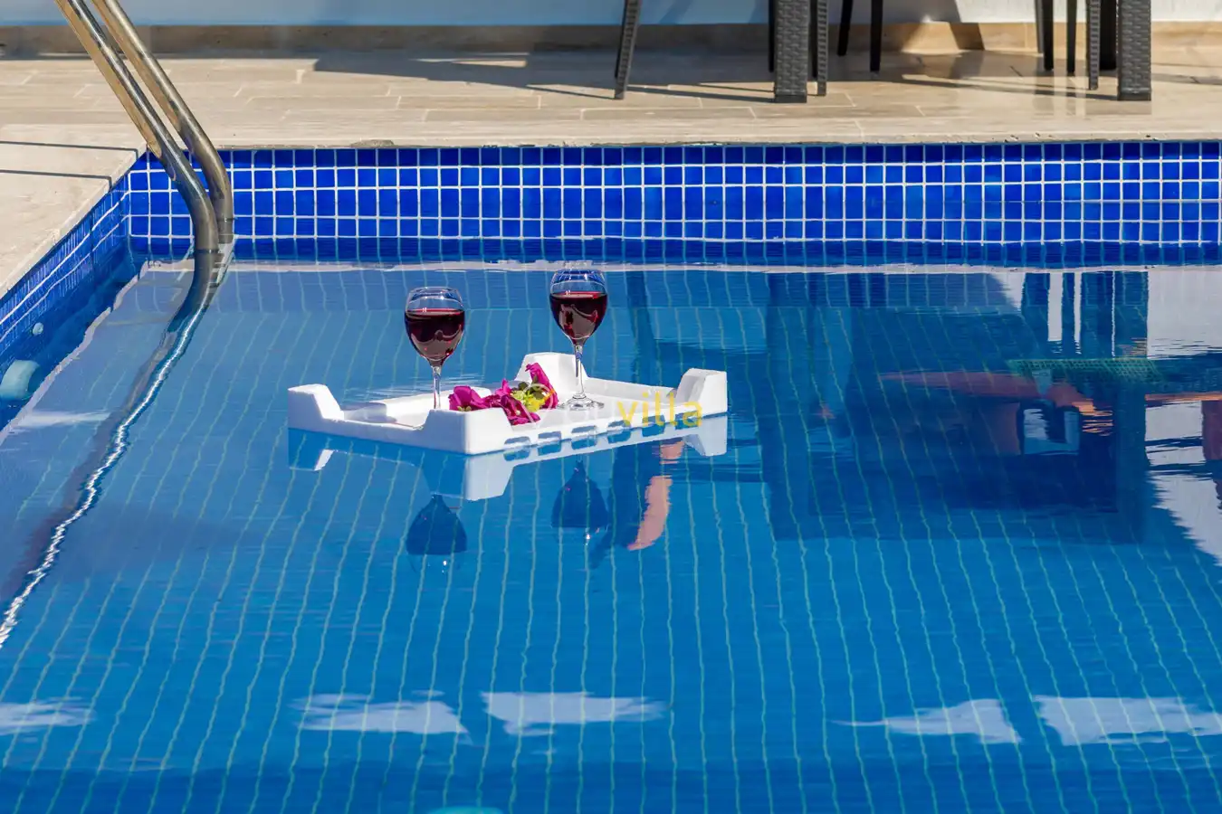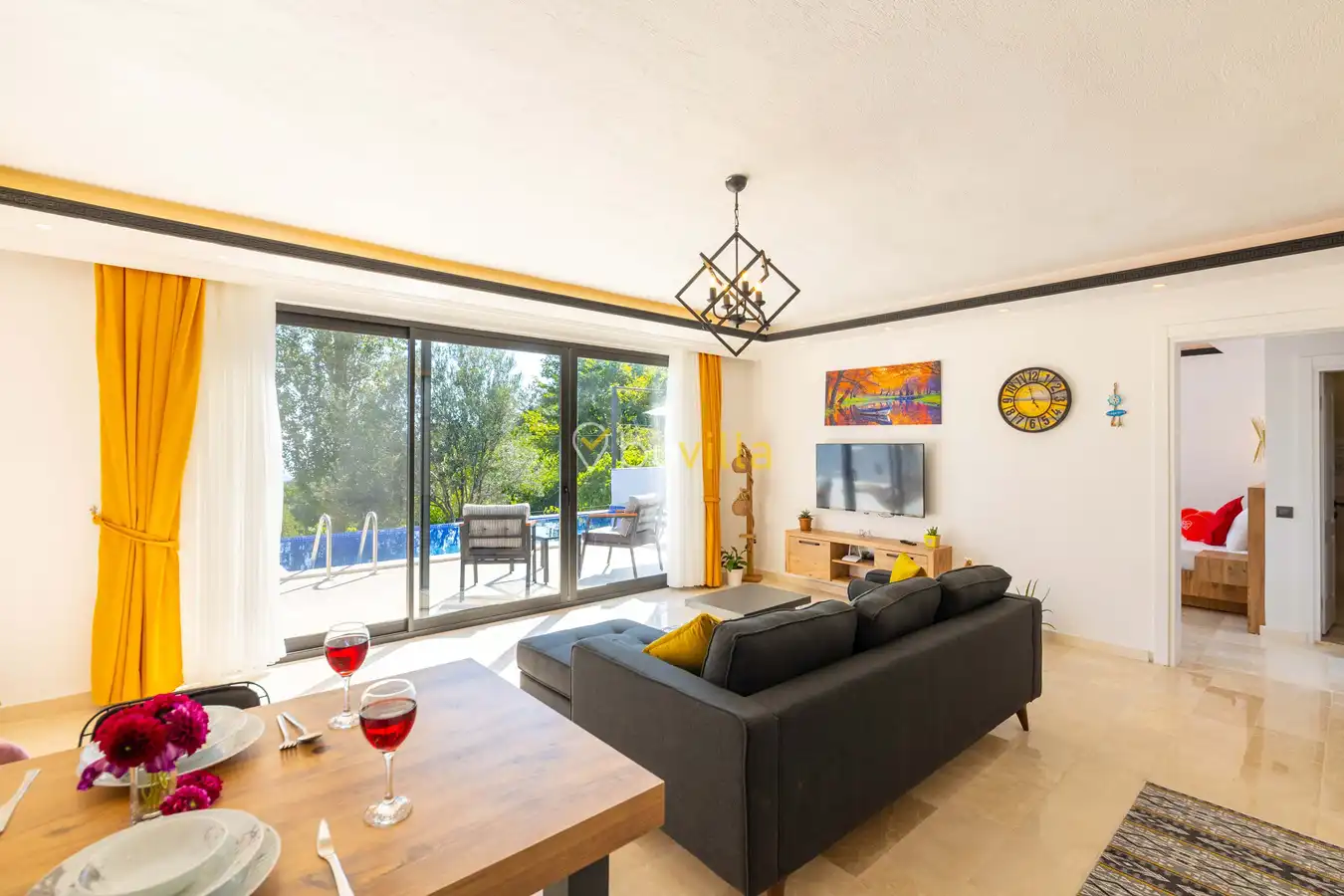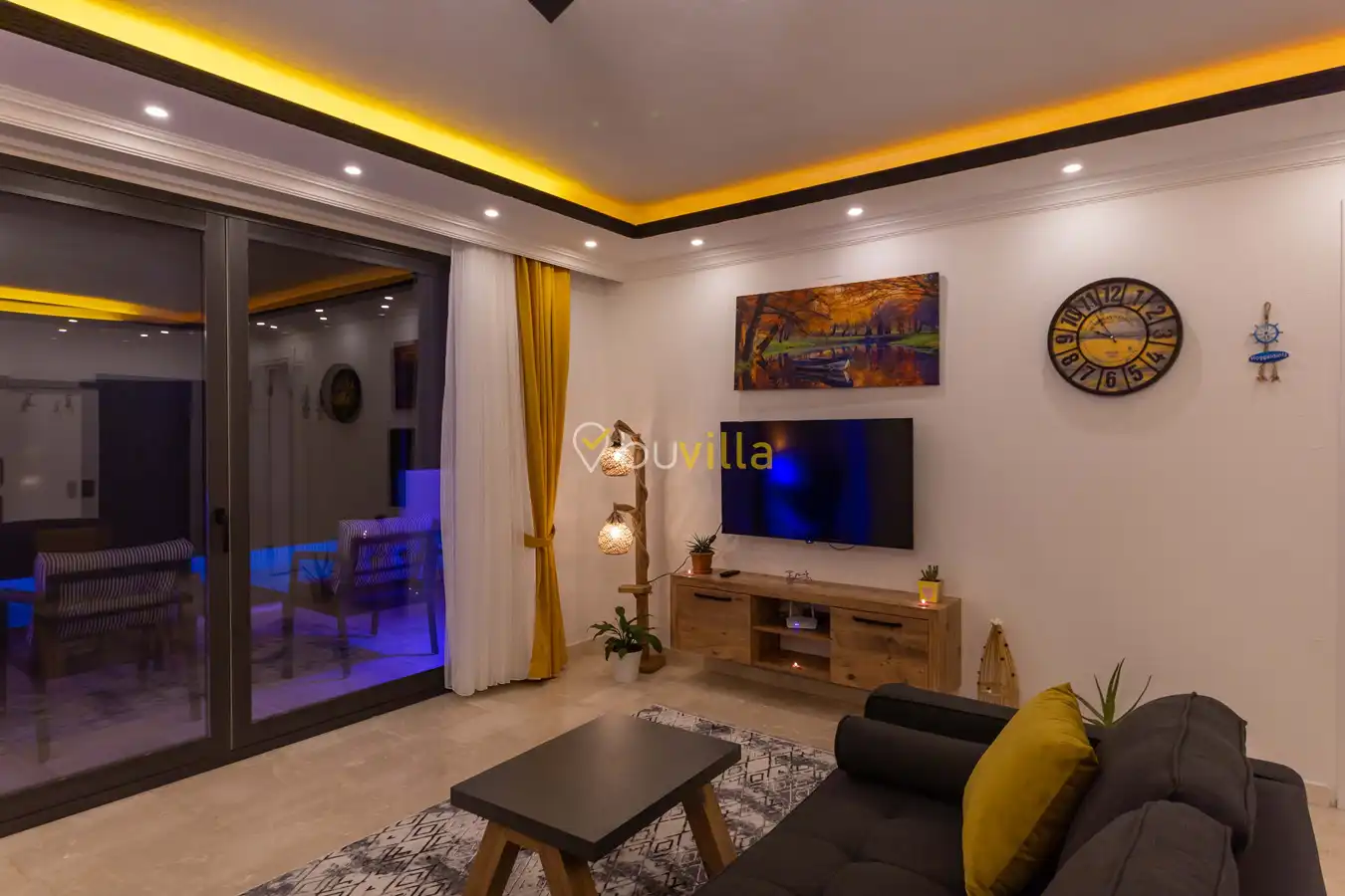 Özel yüzme havuzu ve havuz terası dışarıdan görünmeyecek şekilde planlanmış olup, sakin ve rahat bir tatil atmosferi sunar. Yatak odasında yer alan jakuzi detayı ise tatilinize ekstra konfor ve romantik bir dokunuş katmaktadır.