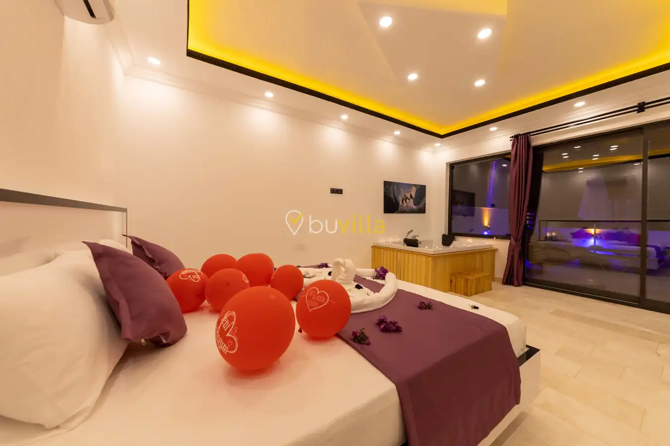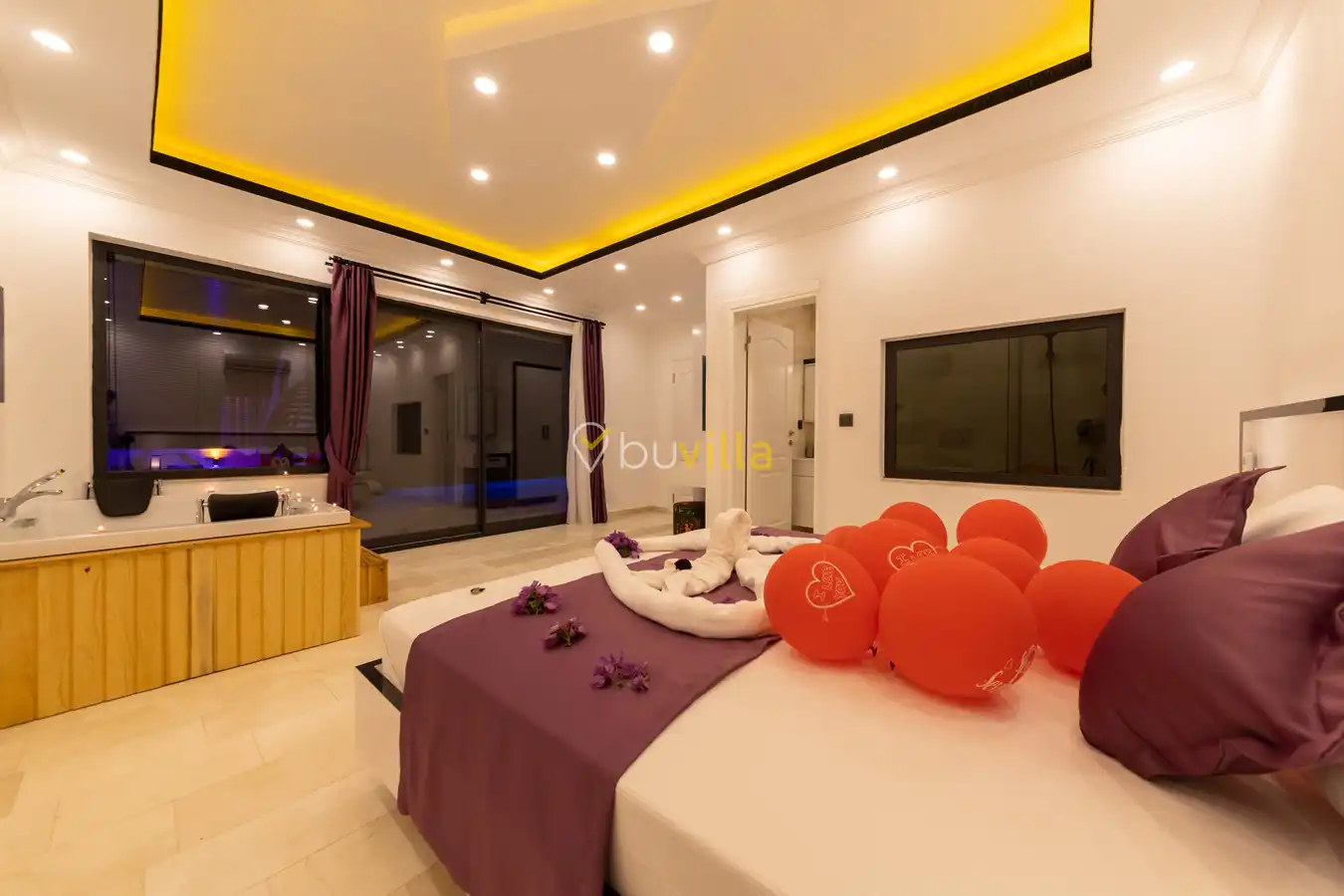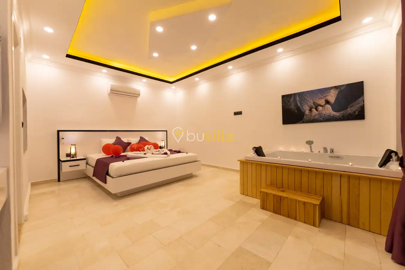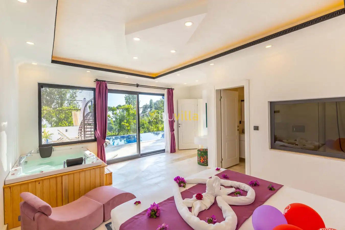 Villamızda 1 yatak odası, 1 salon ve tam donanımlı mutfak bulunmaktadır. Yatak odasında yer alan jakuzi, tatilinize romantik ve konforlu bir dokunuş katmaktadır.