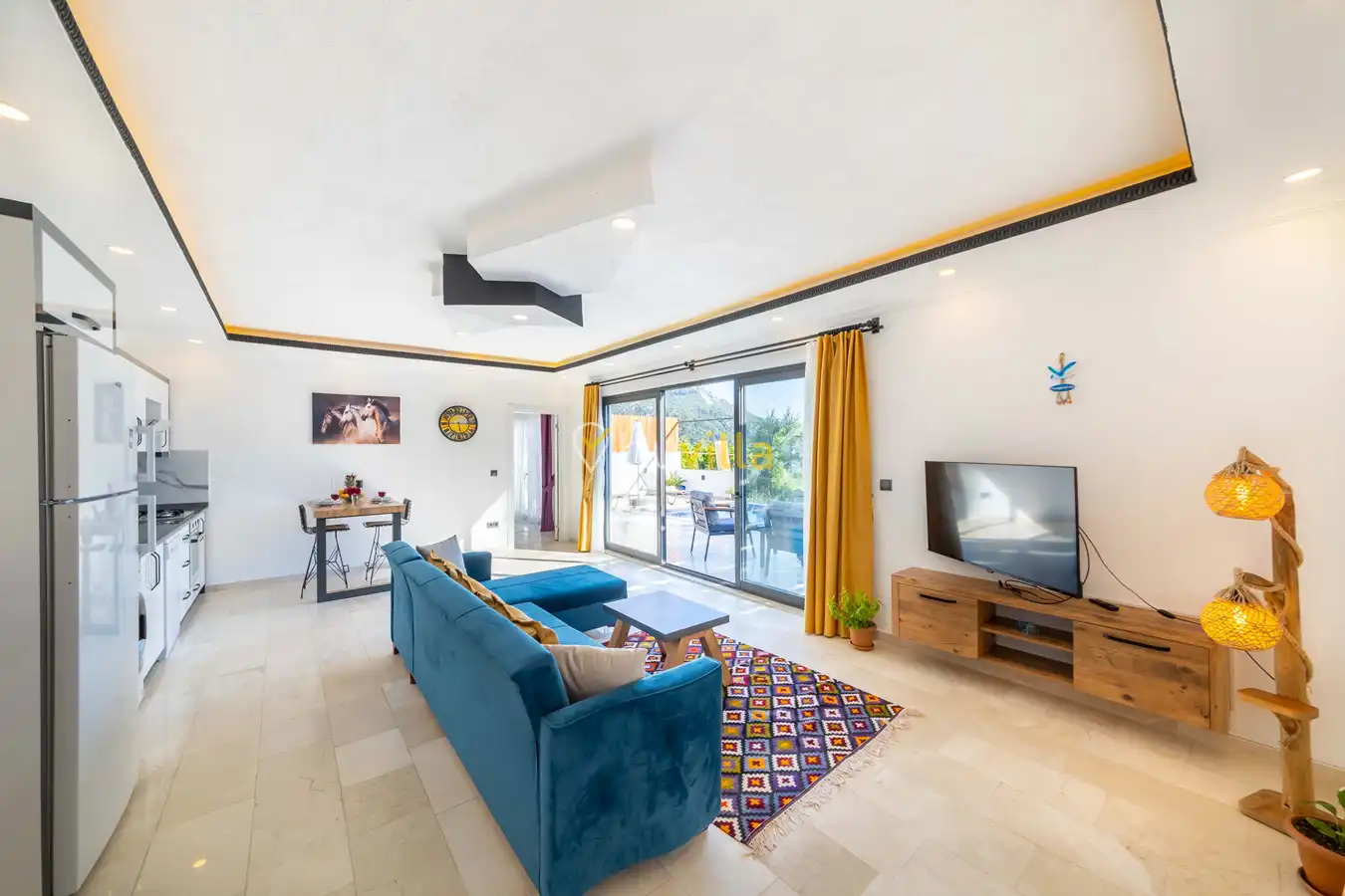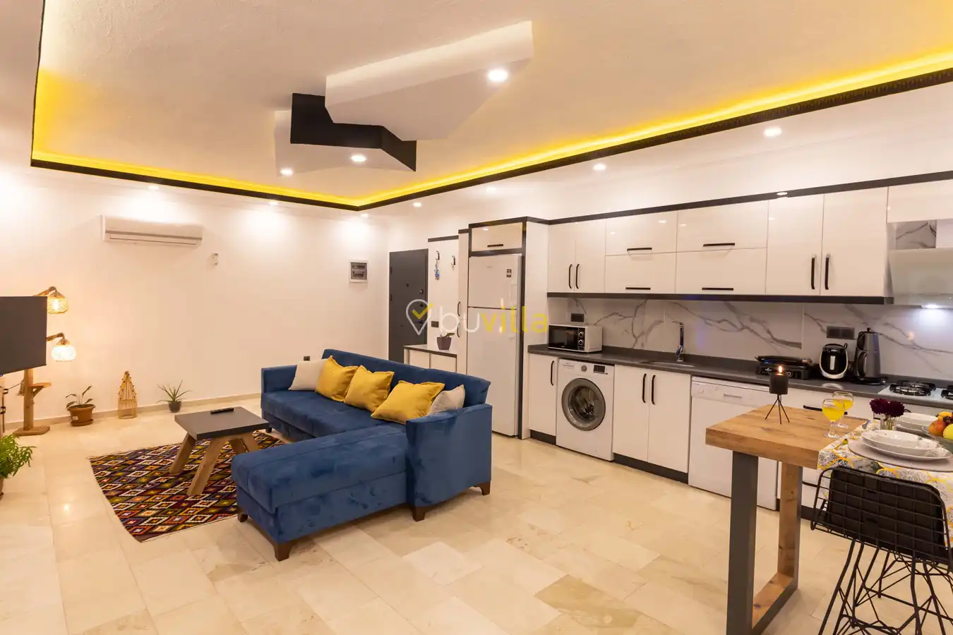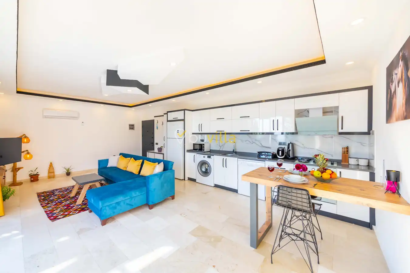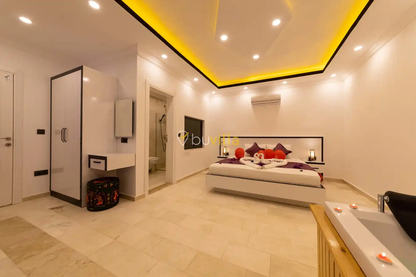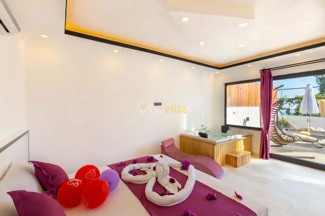 Villamızda 1 yatak odası, 1 salon ve tam donanımlı mutfak bulunmaktadır. Yatak odasında yer alan jakuzi, tatilinize romantik ve konforlu bir dokunuş katmaktadır.