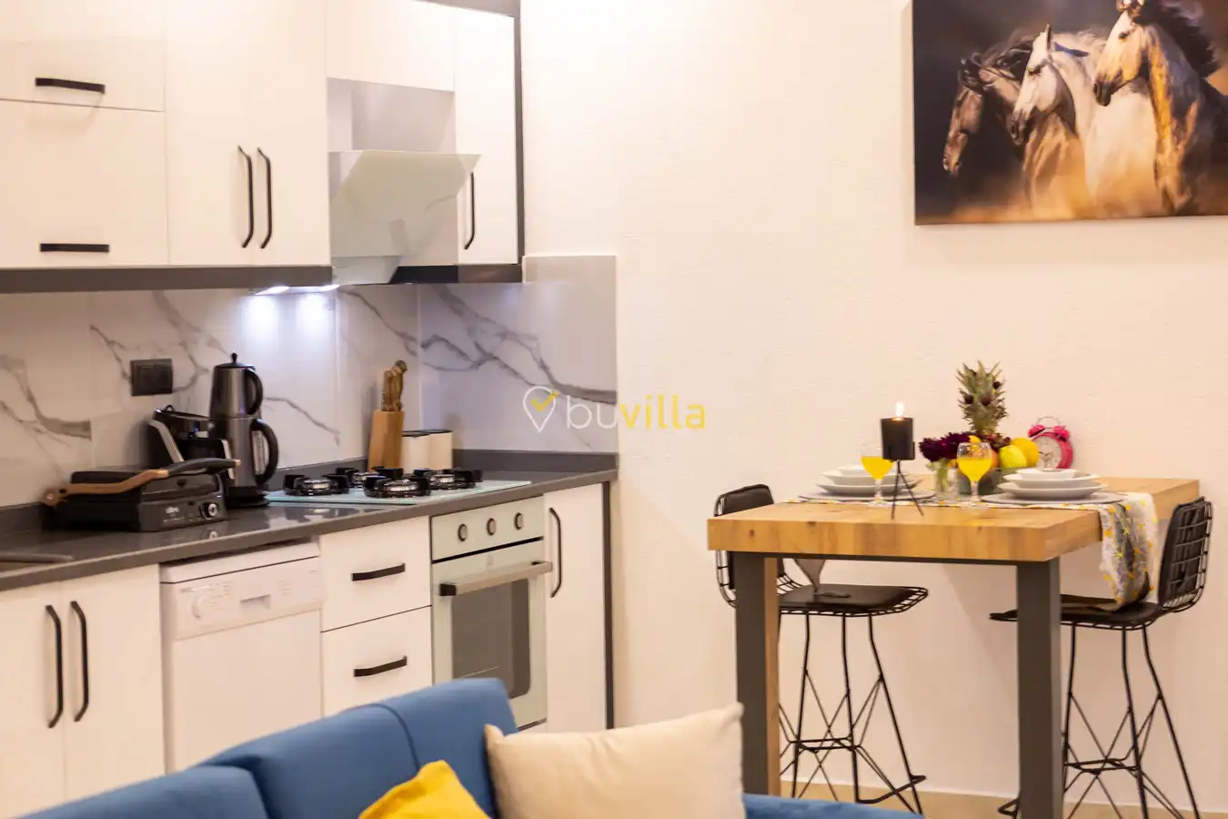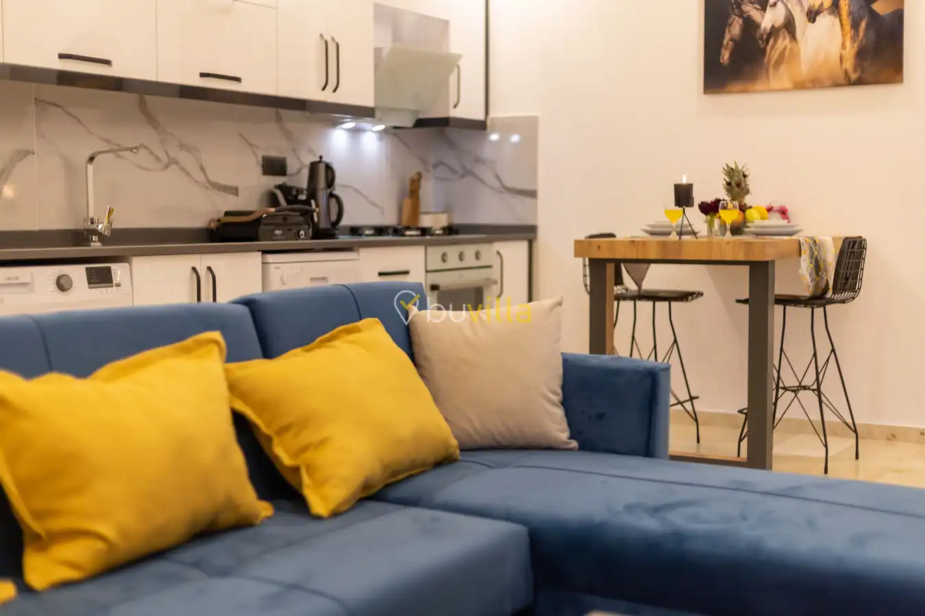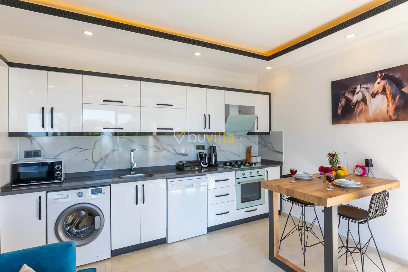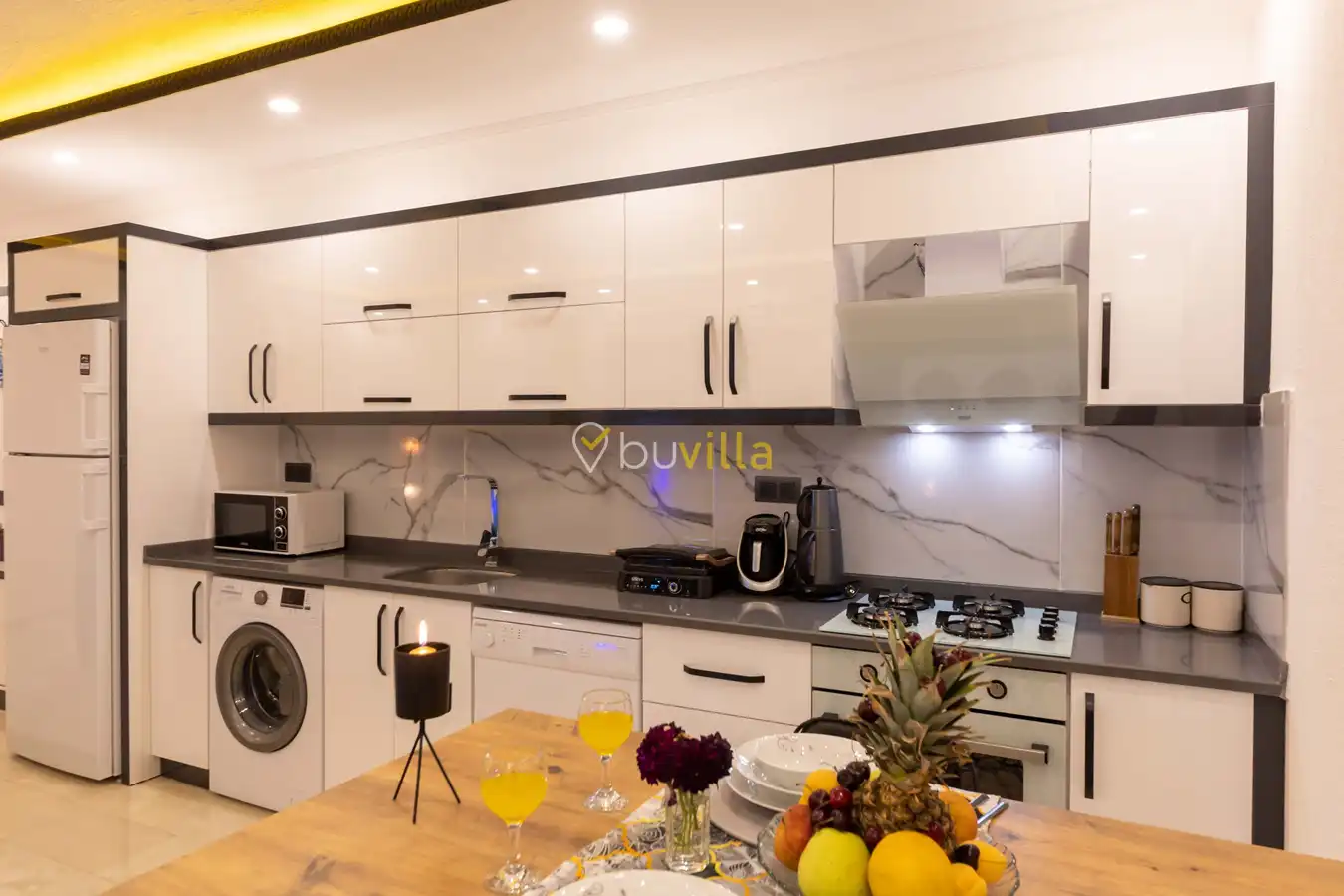 Villamızda 1 yatak odası, 1 salon ve tam donanımlı mutfak bulunmaktadır. Yatak odasında yer alan jakuzi, tatilinize romantik ve konforlu bir dokunuş katmaktadır.