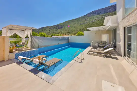 Ana yatak odasında yer alan jakuzi, dinlenme anlarınıza lüks bir dokunuş katarken; tam donanımlı mutfağı sayesinde sevdiklerinizle birlikte dilediğiniz yemeği hazırlayıp keyifle tüketebilirsiniz. Korunaklı bahçesi ve özel havuz terasında, barbekü, şezlong, gölgelikli oturma alanı ve konforlu bahçe mobilyaları yer almaktadır. Gizliliğe önem veren misafirlerimiz için ideal olan bu yapı, izole bir tatil arayanlar için harika bir tercihtir.