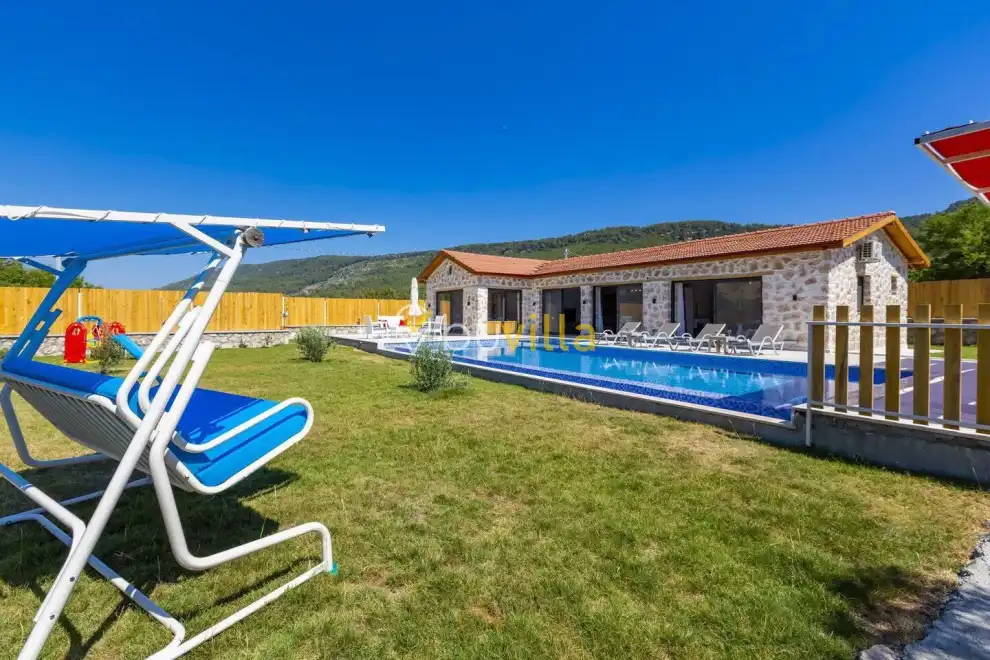 Villanın bahçesinde özel yüzme havuzu, şezlonglar, oturma alanı, mini çocuk oyun alanı, yemek masası ve barbekü alanı yer almaktadır. Yatak odalarından birinde bulunan jakuzi, konaklamanıza romantik ve konforlu bir dokunuş katar.