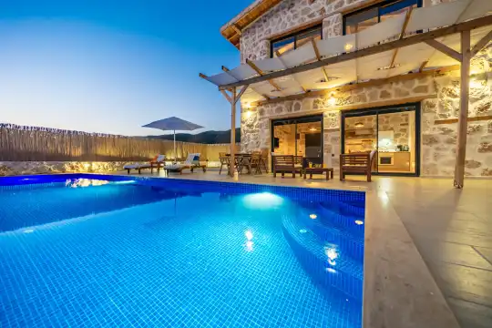 Muhafazakar Villa Villa Bonus 2 : Kalkan in Saribelen Mevkiinde 1 yatak odali 2 kisi konaklama kapasitesindedir. Doga içerisinde bulunan kiralik villamiz balayi çiftlerimiz için uygundur. Amerikan mutfaginda ihtiyaç duyabileceginiz tüm ekipmanlar yer almakta olup konforlu mobilyalarla dizayn edilmis salonu hizmetinizdedir. Sig Havuz Ölçüleri: Genislik 2,40 mt - Uzunluk 3,55 mt - Derinlik 0,40 cm