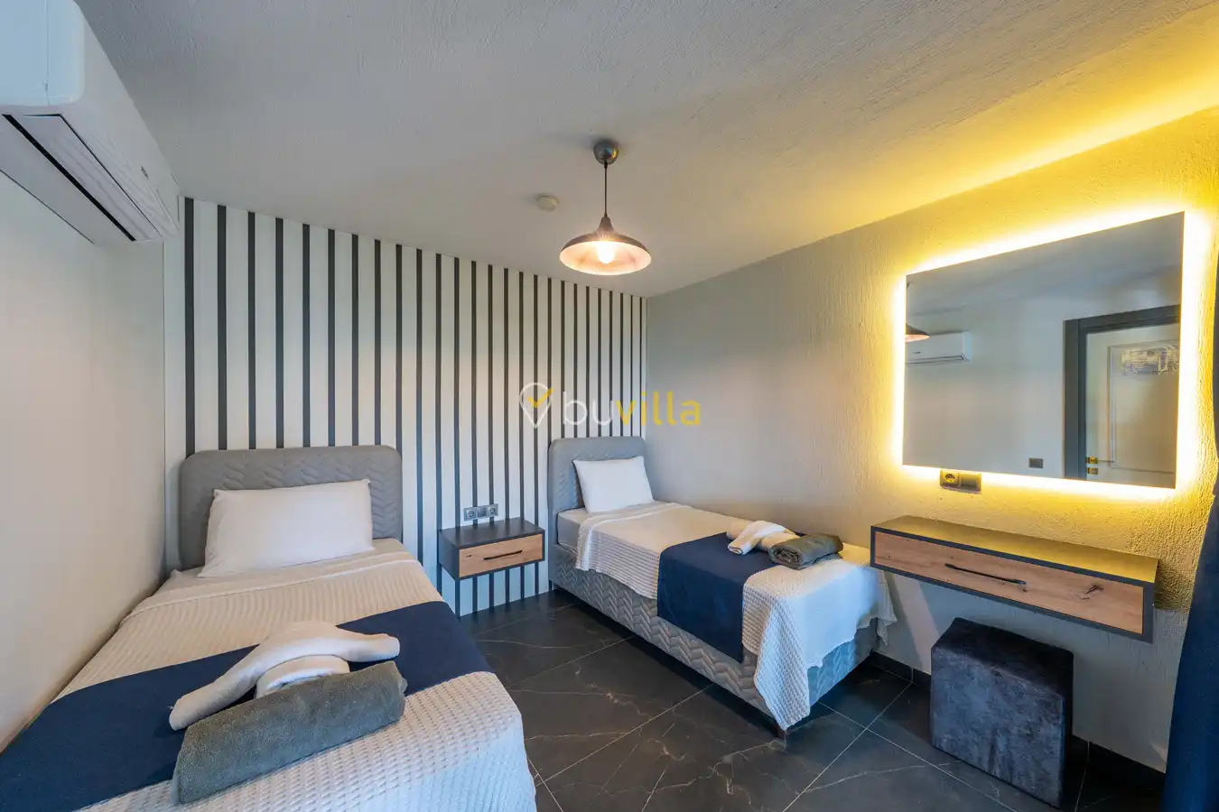 Villa, 4 geniş yatak odası ve 8 kişilik konaklama kapasitesiyle misafirlerine ferah ve rahat bir alan sunuyor. Özel banyolu, özenle dekore edilmiş modern odalarda huzurlu bir uyku sizi bekliyor. Hem iç hem dış havuzları sayesinde her mevsim yüzmenin tadını çıkarabilir, havuz başında güneşlenirken serinletici içeceklerinizi yudumlayabilirsiniz.