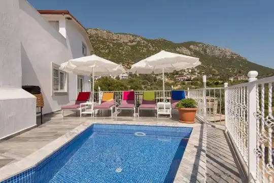 Deniz Manzarali Villa Kiralik Villa Çitlembik, Kalkan Kördere mekiinde yer almaktadir. 4 yatak odali 8 kisiye kadar konaklama imkani sunan villamiz kalabalik aile ve arkadas gruplari için idealdir. Muhtesem deniz manzarasina hakim jakuzili muhafazakar villamizin havuz terasinda çocuk havuzu yer almaktadir. Amerikan mutfaginda ihtiyaç duyabileceginiz tüm ekipmanlar yer almakta olup konforlu mobilyalarla dizayn edilmis salonu hizmetinizdedir.