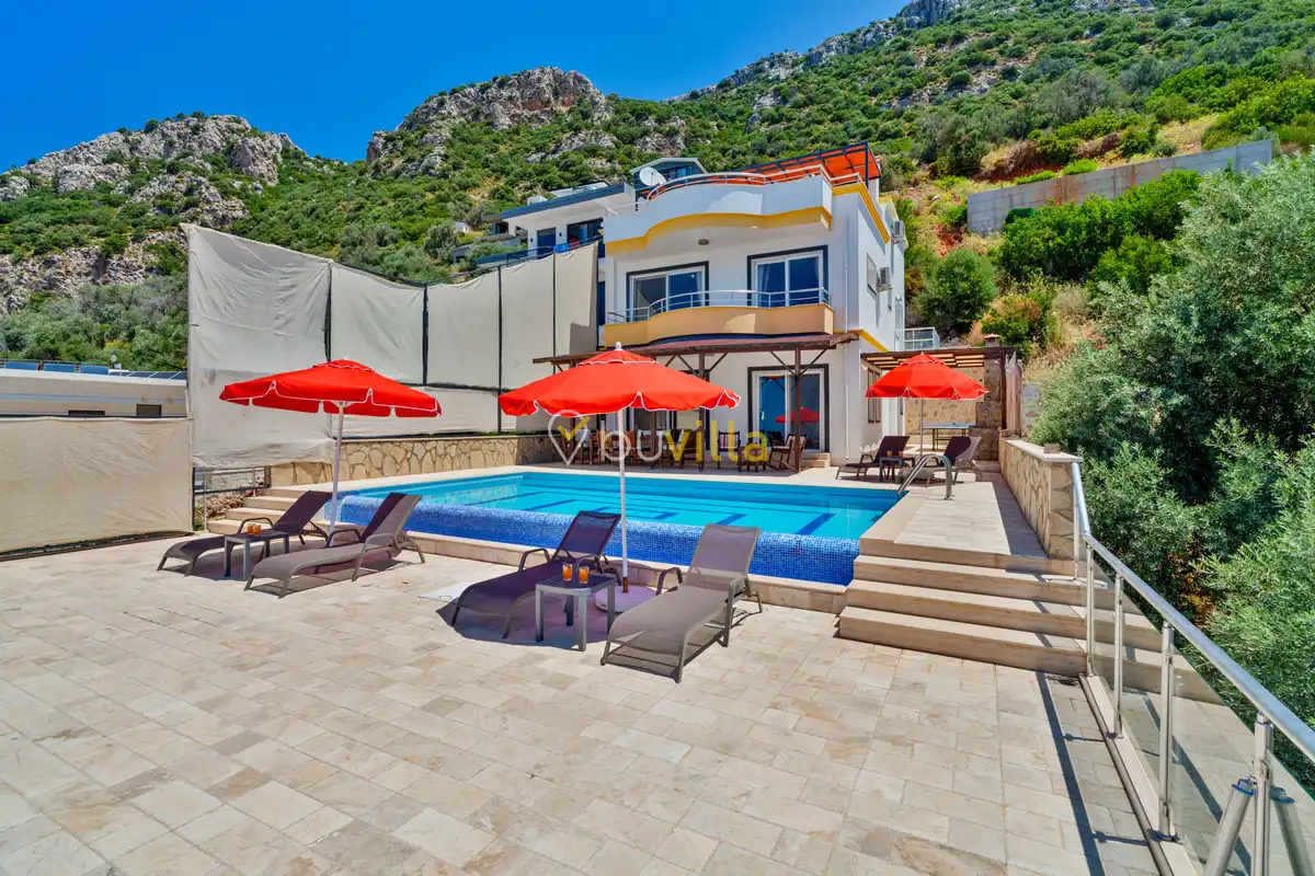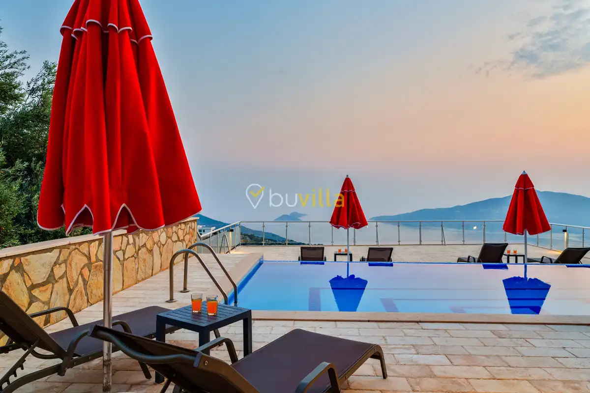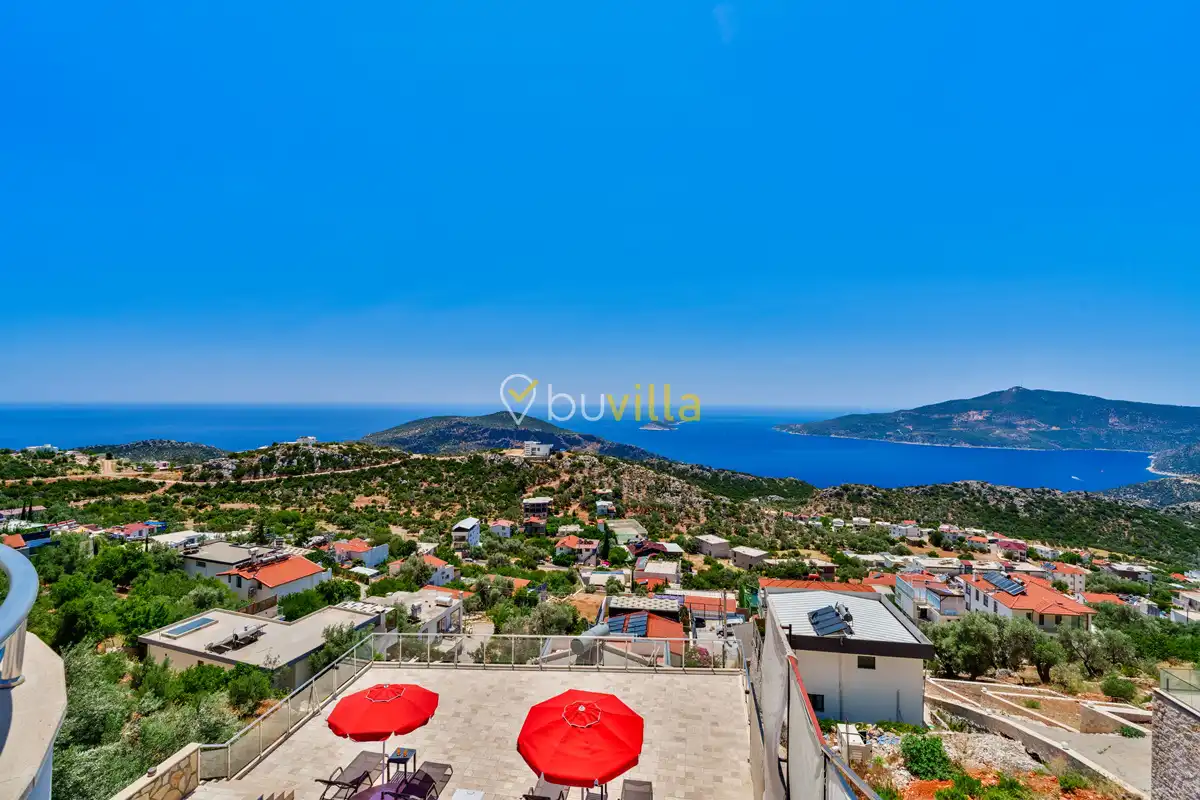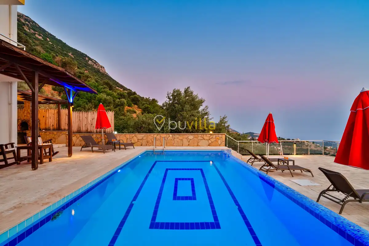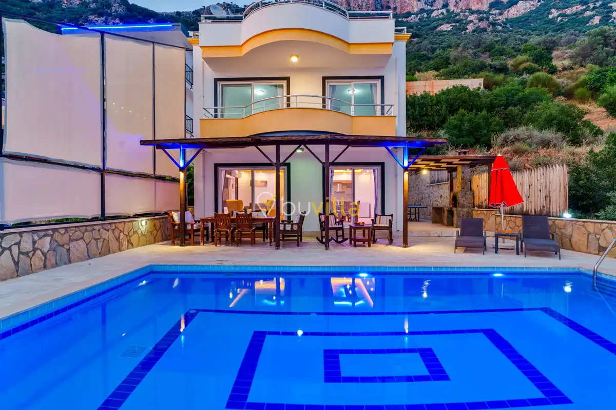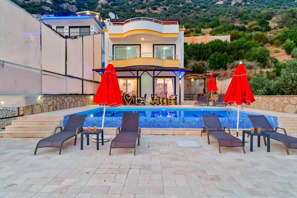 Kalkan’ın Kördere mevkiinde, Sarnıçbaşı bölgesinde yer alan bu lüks kiralık villa; panoramik deniz manzarası, yüksek konumu ve mahremiyet odaklı yapısıyla özel bir tatil deneyimi sunar. Dört yatak odasıyla sekiz kişilik konaklama kapasitesine sahip olan villa, hem muhafazakâr aileler hem de sakin ve izole bir tatil arayan misafirler için ideal bir villa kiralama alternatifidir.
