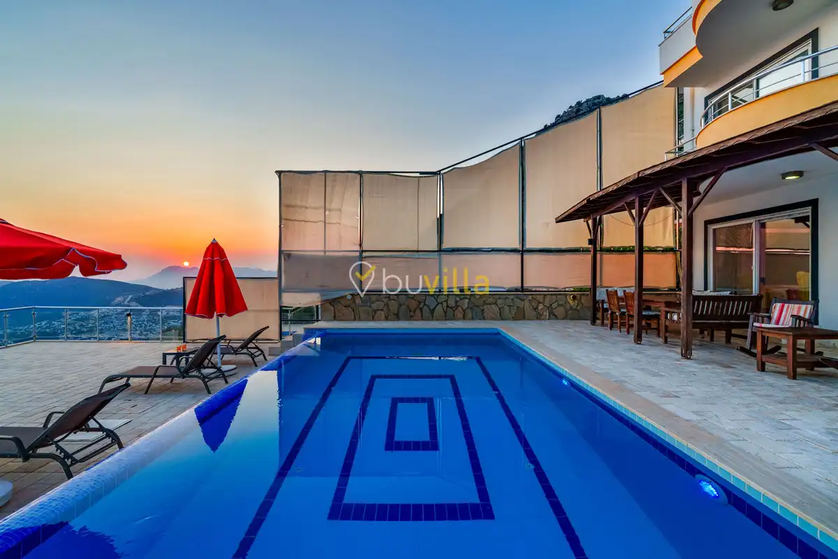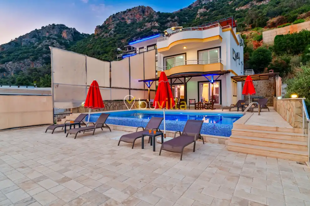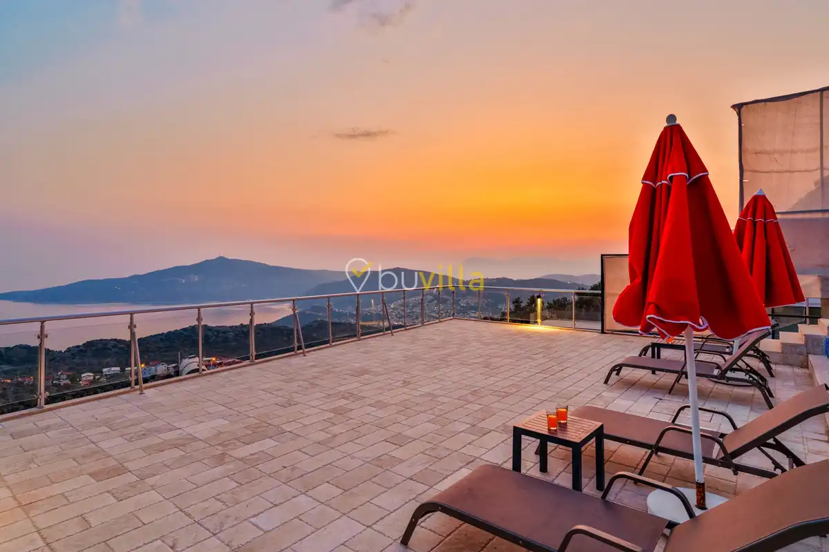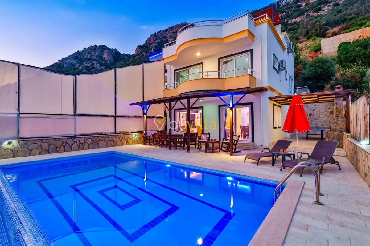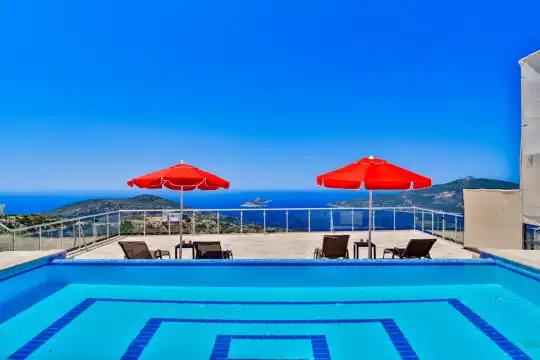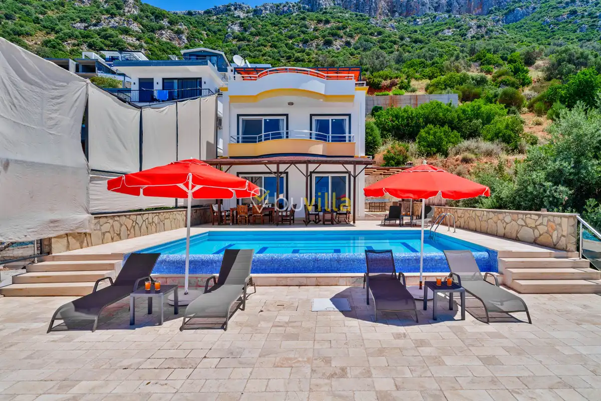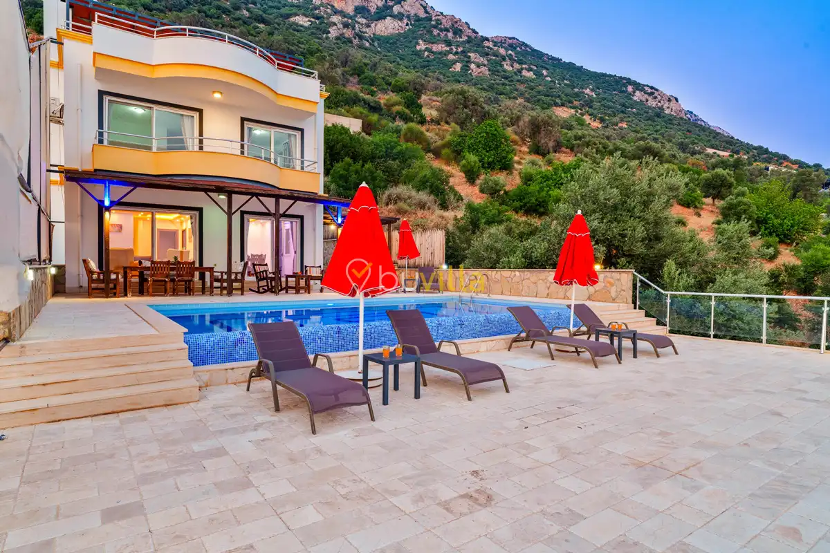Kalkan’ın Kördere mevkiinde, Sarnıçbaşı bölgesinde yer alan bu lüks kiralık villa; panoramik deniz manzarası, yüksek konumu ve mahremiyet odaklı yapısıyla özel bir tatil deneyimi sunar. Dört yatak odasıyla sekiz kişilik konaklama kapasitesine sahip olan villa, hem muhafazakâr aileler hem de sakin ve izole bir tatil arayan misafirler için ideal bir villa kiralama alternatifidir.