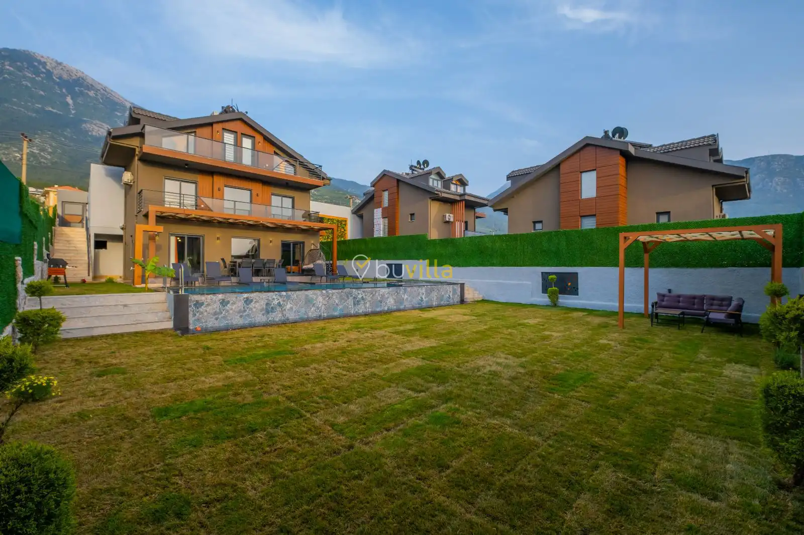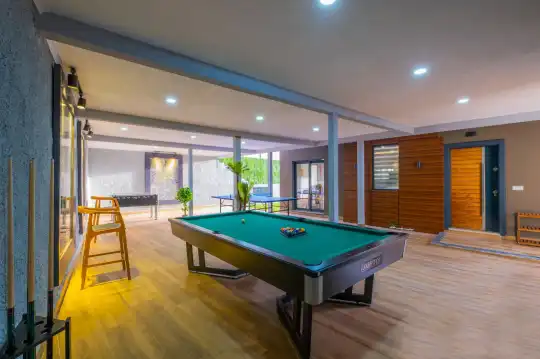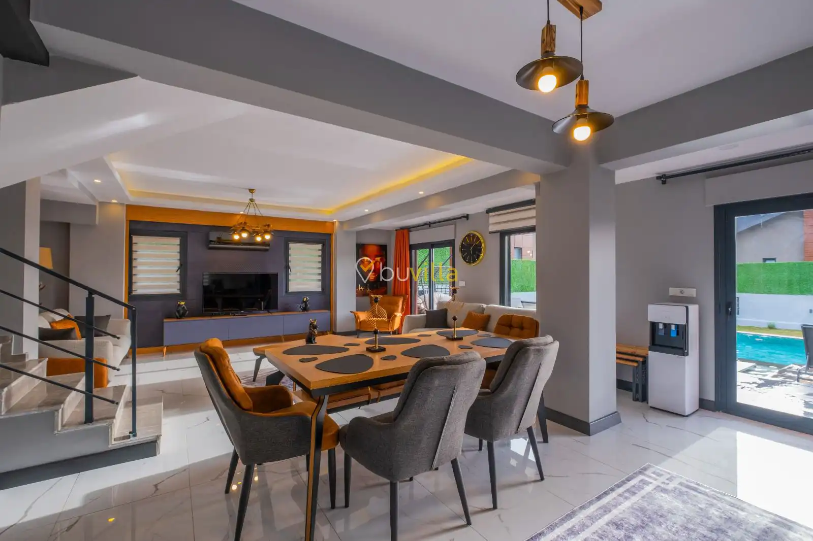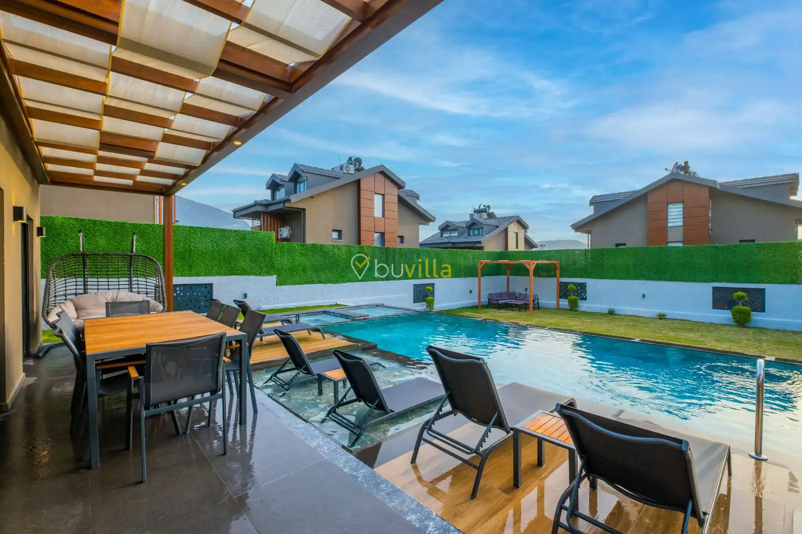 Villamızın geniş havuz terasında şezlonglar, bahçe yemek masası ve keyifli anlar yaşayabileceğiniz bir salıncak bulunmaktadır. Çocuk havuzu (2 m x 2 m) ve havuza entegre jakuzi sayesinde tatilinizi daha da keyifli hale getirebilirsiniz.