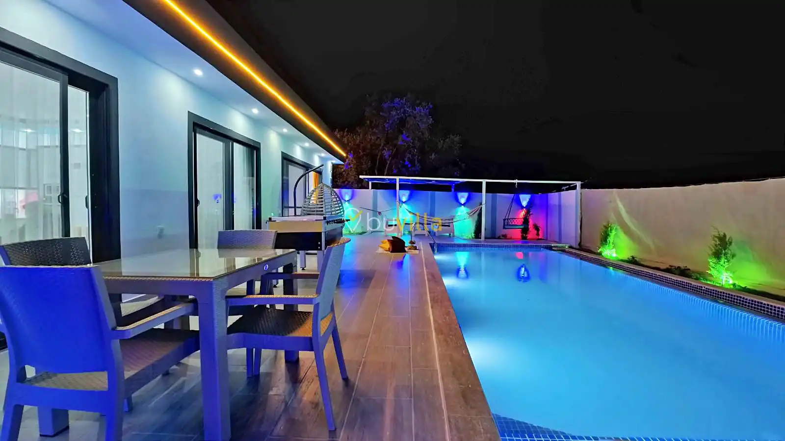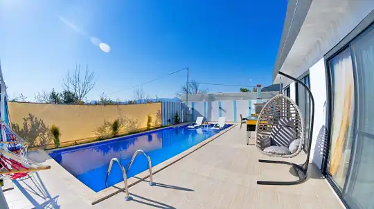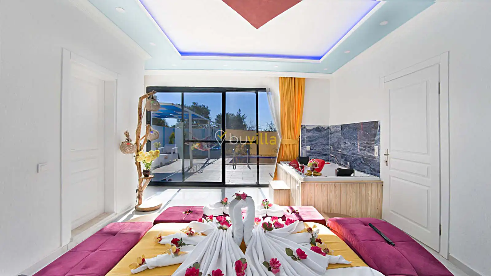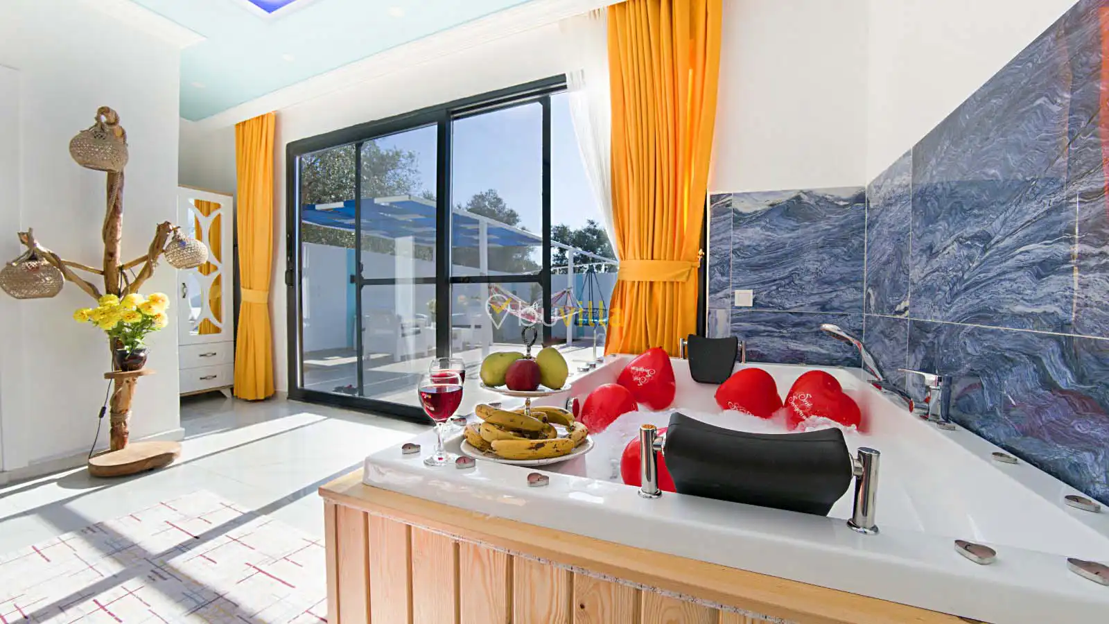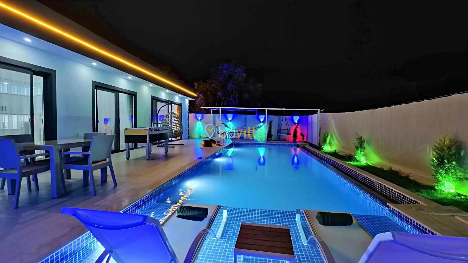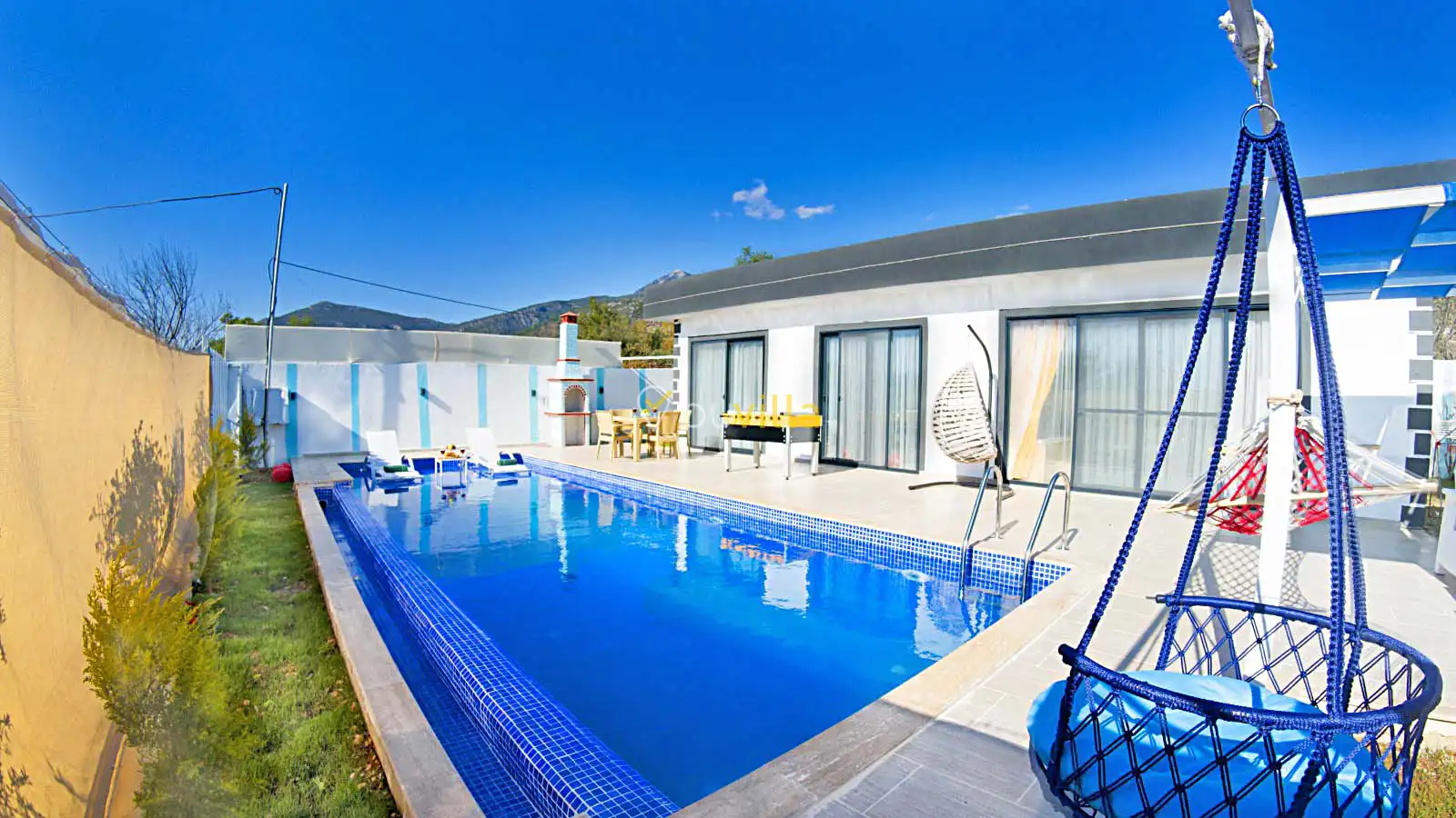 Villamızın havuz alanı korunaklı olup havuz terasında salıncak ve langırt bulunmaktadır. Oldukça renkli ve şirin bir dekorasyona sahip olan villamızın iç kısmında ayrıca jakuzi yer almaktadır. Romantik atmosferi ve özel yapısı sayesinde balayı çiftleri için son derece uygun olan villamız, keyifli ve dinlendirici bir tatil deneyimi sunmaktadır.