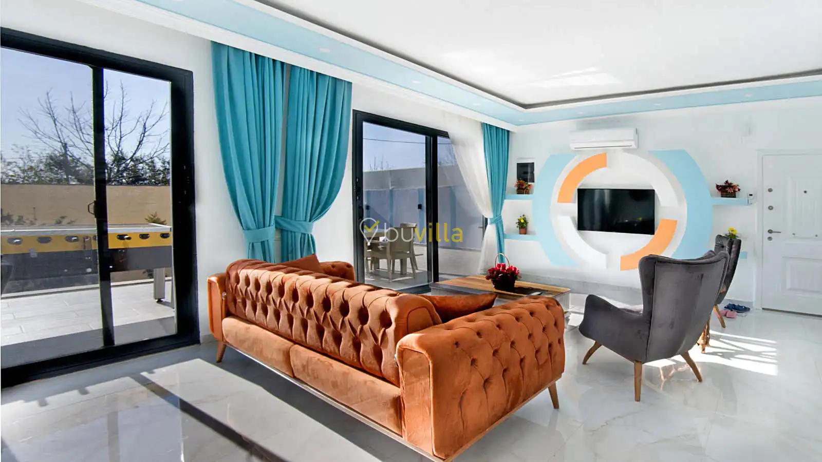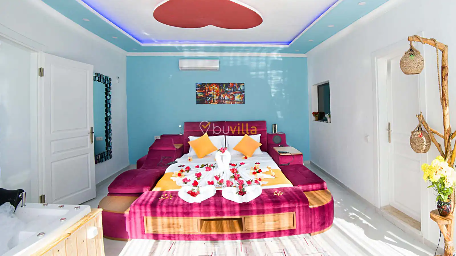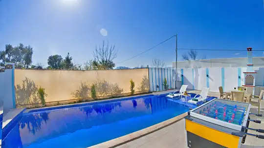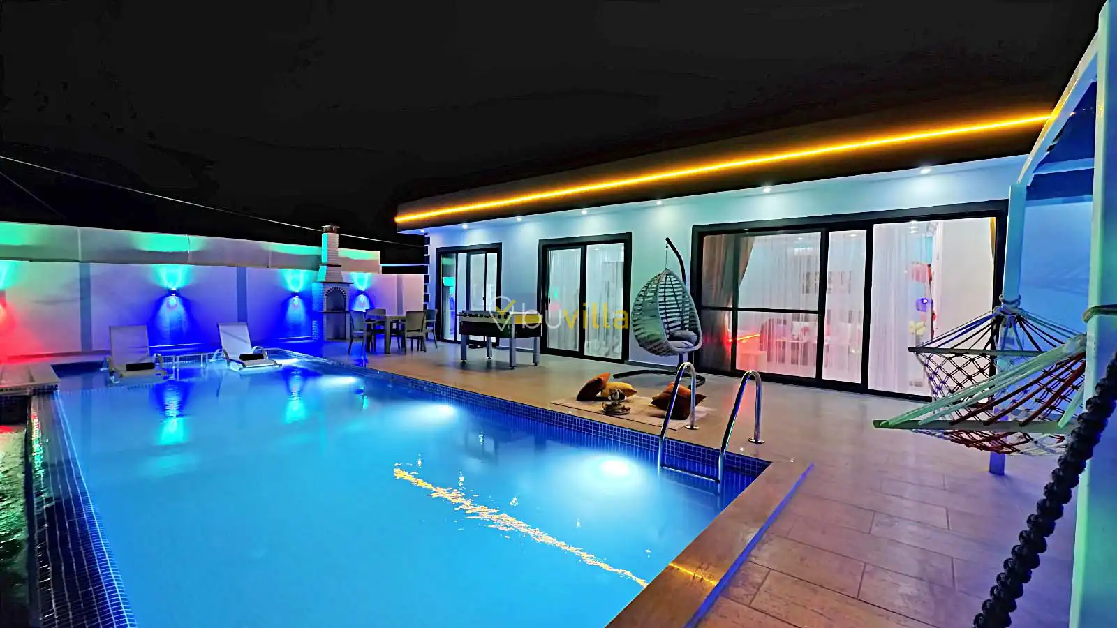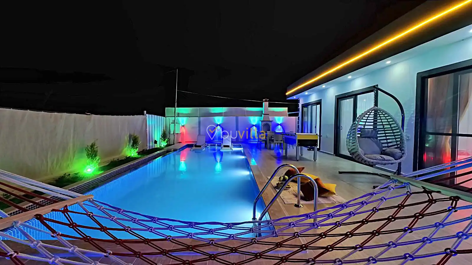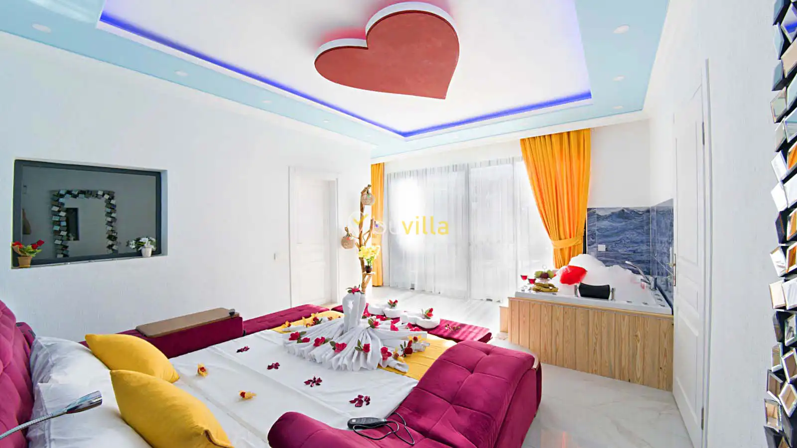 Villamızın havuz alanı korunaklı olup havuz terasında salıncak ve langırt bulunmaktadır. Oldukça renkli ve şirin bir dekorasyona sahip olan villamızın iç kısmında ayrıca jakuzi yer almaktadır. Romantik atmosferi ve özel yapısı sayesinde balayı çiftleri için son derece uygun olan villamız, keyifli ve dinlendirici bir tatil deneyimi sunmaktadır.