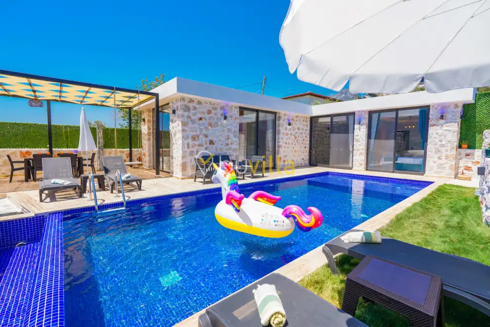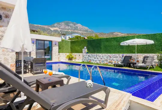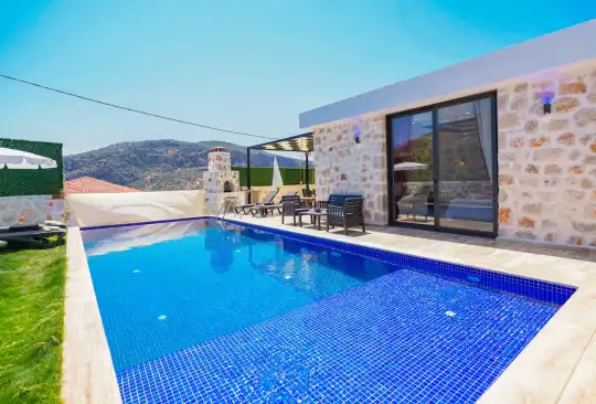Doga Içinde Muhafazakar Villa Kiralik Villa Ezgi Kalkan Ulugöl mevkiinde yer almakta olup 4 kisiye kadar konaklama imkani saglamaktadir. Tam donanimli Amerikan mutfagi ve konforlu salonu hizmetinizdedir. Ebeveyn yatak odasinda jakuzi yer almaktadir. Havuz bahçe kati korunakli olan doga manzarali villamiz muhafazakar aileler için ideal bir seçenektir.