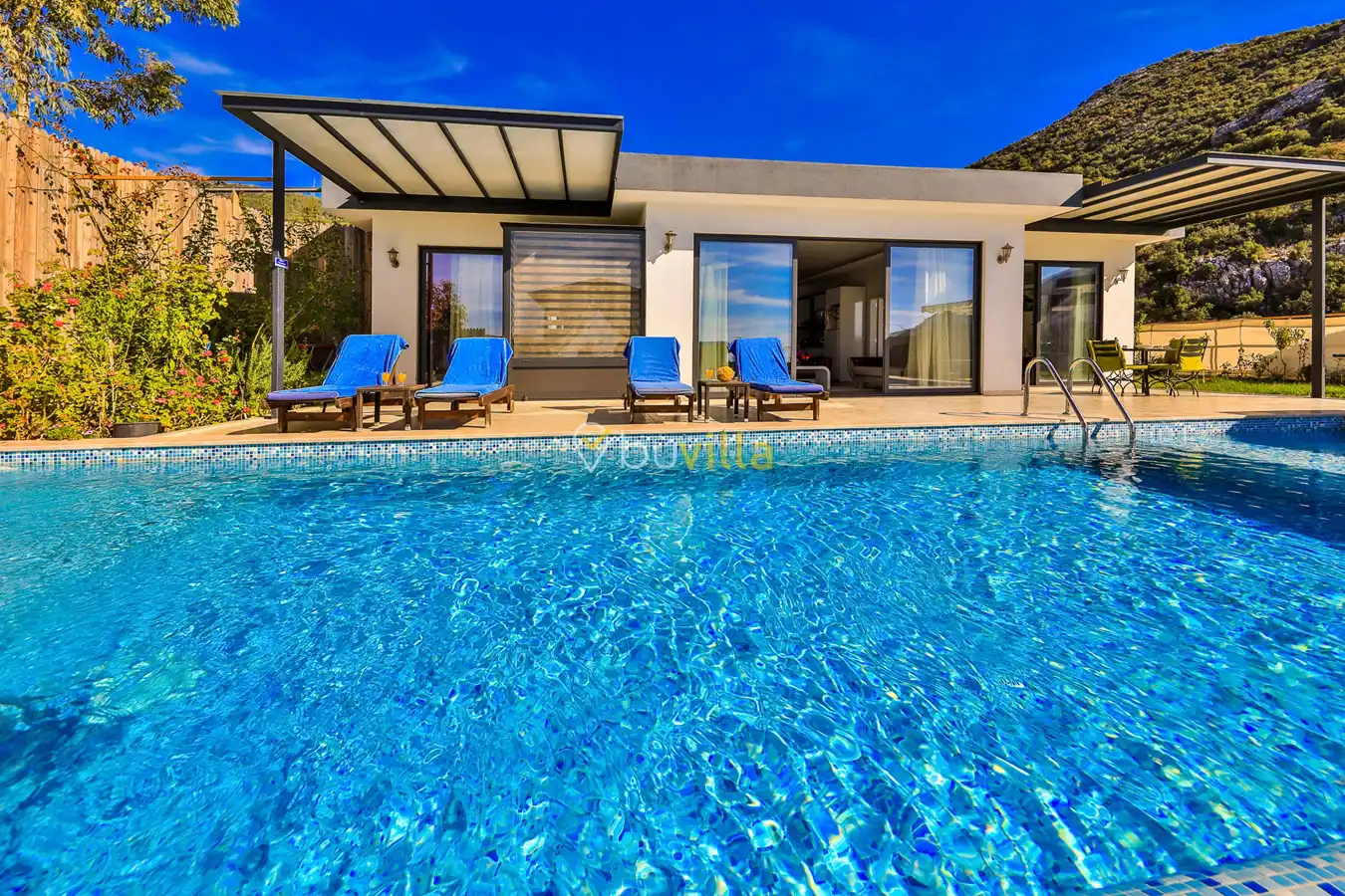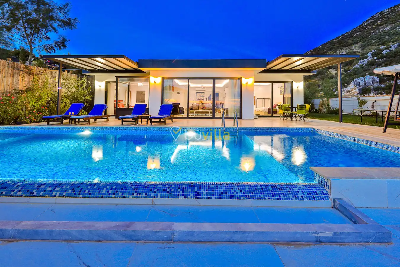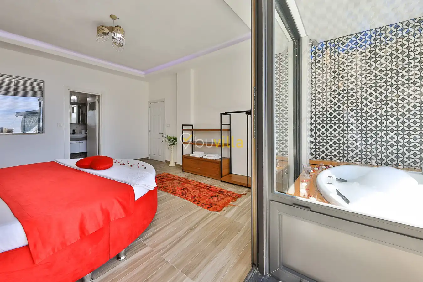 Villamızda 2 yatak odası ve 2 banyo bulunmaktadır. Birinci yatak odasında çift kişilik yatak, klima, jakuzi ve ebeveyn banyosu yer alırken; ikinci yatak odasında 2 adet tek kişilik yatak, klima ve ebeveyn banyosu bulunmaktadır. Açık plan salon bölümünde ise mutfak, konforlu oturma grubu, WC, televizyon ve klima yer almaktadır.