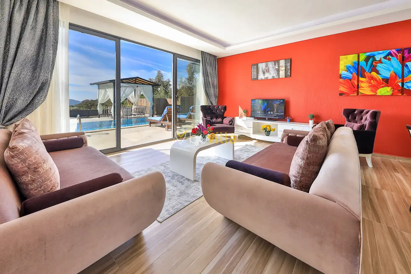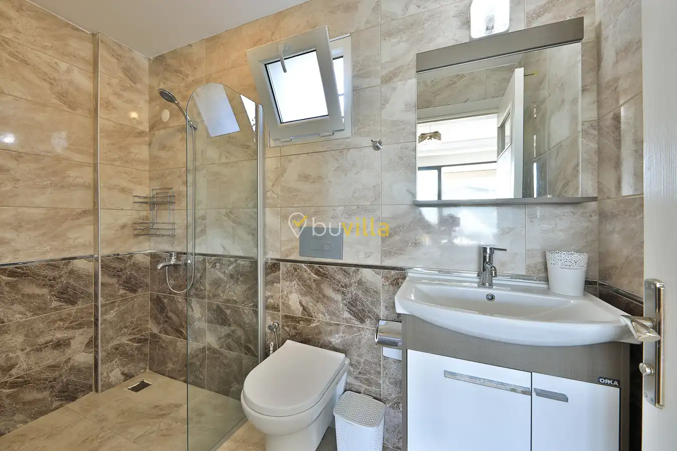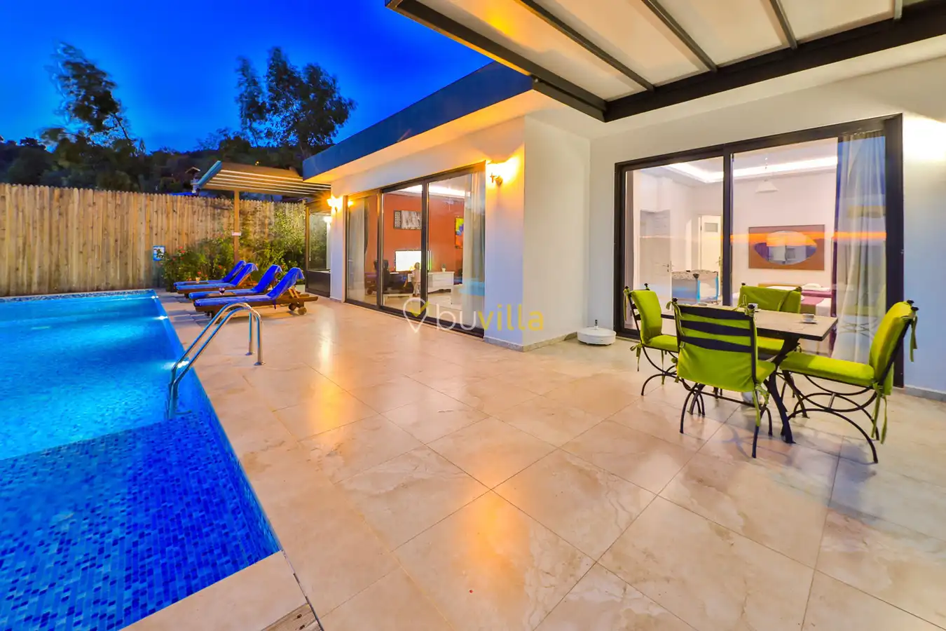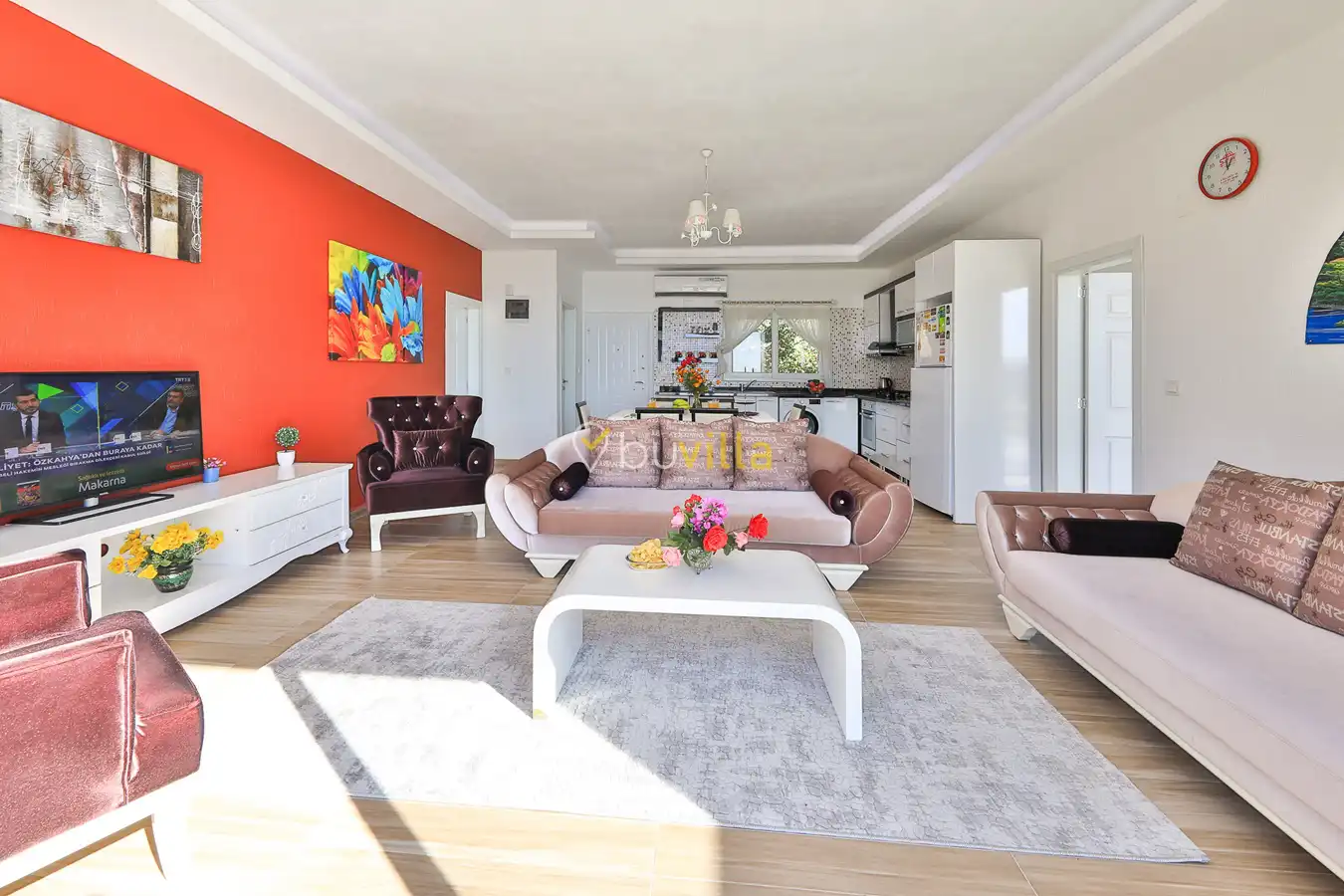 Villamızda 2 yatak odası ve 2 banyo bulunmaktadır. Birinci yatak odasında çift kişilik yatak, klima, jakuzi ve ebeveyn banyosu yer alırken; ikinci yatak odasında 2 adet tek kişilik yatak, klima ve ebeveyn banyosu bulunmaktadır. Açık plan salon bölümünde ise mutfak, konforlu oturma grubu, WC, televizyon ve klima yer almaktadır.