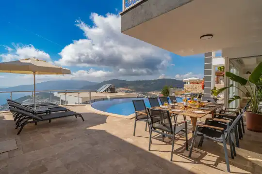 Deniz Manzarali Villa Kiralik Villa Gök , Kalkan Kiziltas mevkiinde konumlanan deniz manzarali bir villadir. 5 yatak odali olan villamizda toplamda 10 kisi konaklayabilmektedir. Ebebeyn yatak odasinda büyük bir jakuzi yer almaktadir. Kiralik villamizin tam donanimli Amerikan mutfaginda ihtiyaç duyabileceginiz tüm ekipmanlar mevcut olup konforlu mobilyalarla dizayn edilmis salonu hizmetinizdedir. Havuz ve bahçe katindan essiz bir deniz manzarasina sahip Villa Gök’ e sizleri bekliyoruz.