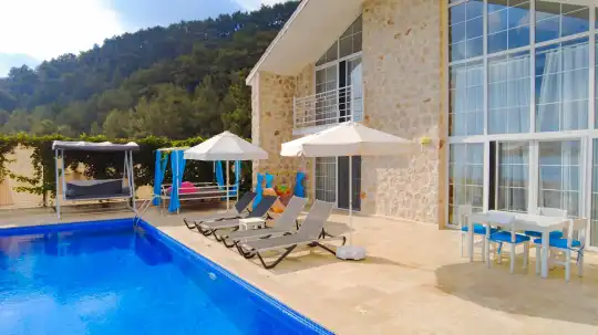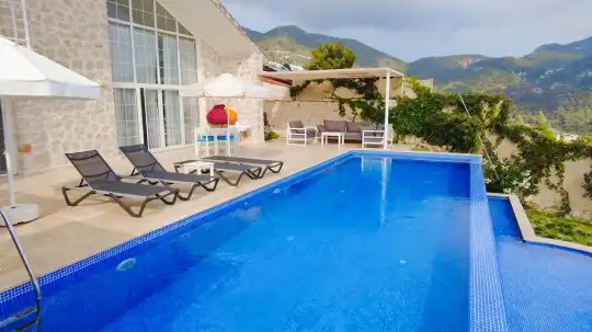 Kalkan Islamlar mevkiinde 2 yatak odali 4 kisi kapasitelidir. Doga içerisindeki villamiz muhtesem doga ve deniz manzarasina sahiptir. Kiralik villamizin etrafi korunakli olup muhafazakâr villa seçeneklerimiz arasindadir. Ihtiyaç duyabileceginiz tüm ekipmanlar bulunan villamizin genis havuz terasi bulunmaktadir. Keyifli tatil firsati sunan kiralik villamiz misafirleriniz agirlamayi beklemektedir. (Villamiz da 3*3 ebatlarinda çocuk havuzu bulunmaktadir.)