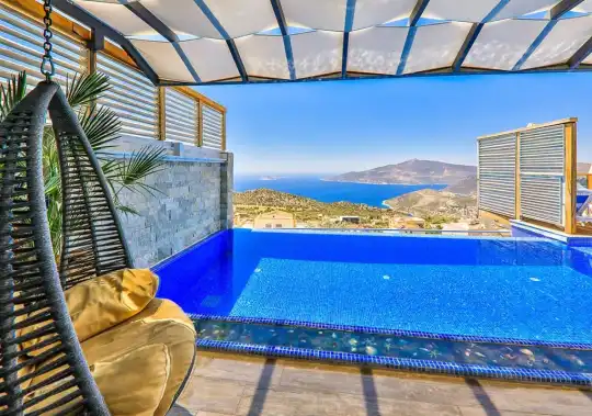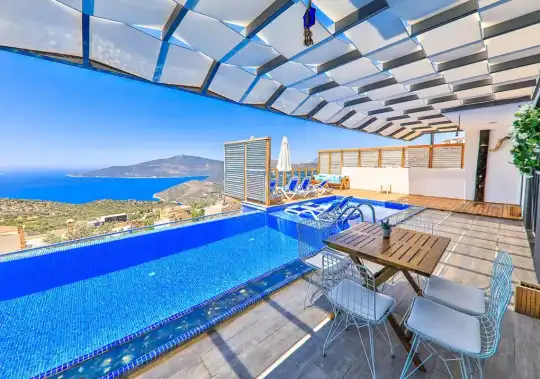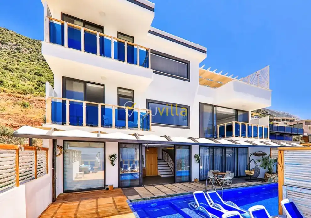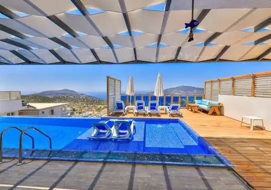 Deniz Manzaralı Villa Kiralik Villa Jilda Kalkan Kördere mevkiinde yer alan villamız 3 yatak odalı 6 kisi kapasiteli bir tatil villasıdır. En süit odalarımızdan bir tanesinde hamam yer almaktadır. Muhteşem tasarımı ile lüks amerikan mutfağına sahip olan villamız da tüm araç gereçleri bulunup salonunda projeksiyon sistemi bulunmaktadır. Havuzun yer aldığı ana terasta özel bir oturma alanı ve barbekü bulunmaktadır. Havuz ve bahçe disarıdan görünmeyecek şekilde muhafazakar aileler için uygun hale getirilmiştir.