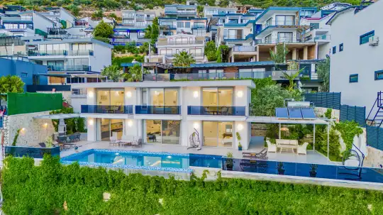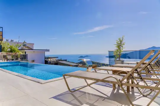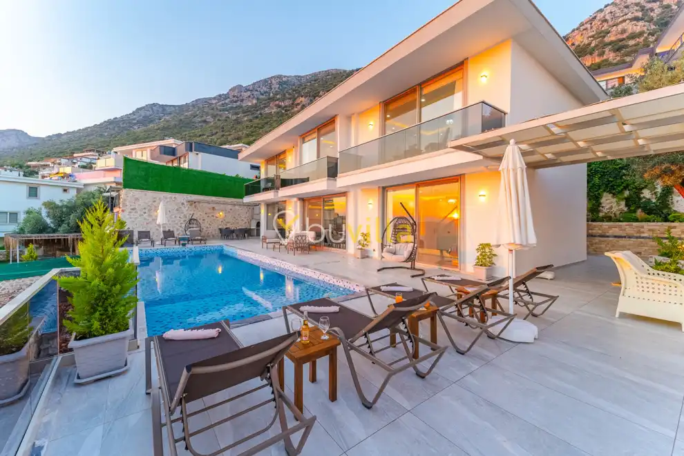 Deniz Manzarali Villa Kiralik Villa July , Kalkan Kördere mevkiinde yer almakta olup 4 yatak odali 8 kisiye kadar konaklama imkani saglamaktadir. Kalabalik aile ve arkadas gruplari için ideal bir seçenek olan villamiz muhtesem deniz manzarasiyla tatilinizi taçlandiracaktir.Amerikan mutfaginda ihtiyaç duyabileceginiz mutfak ekipmanlari mevcut olup konforlu mobilyalarla dizayn edilmis salonu hizmetinizdedir.