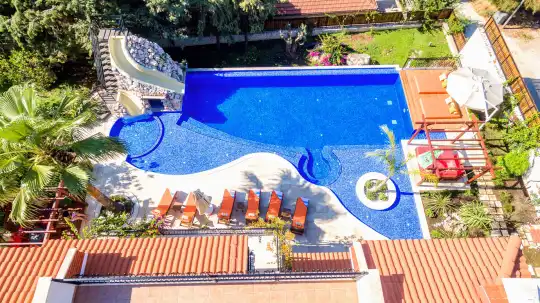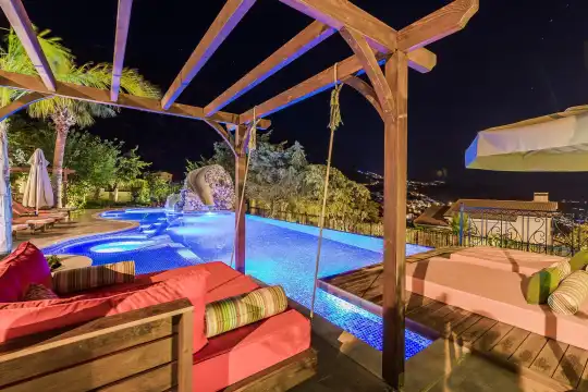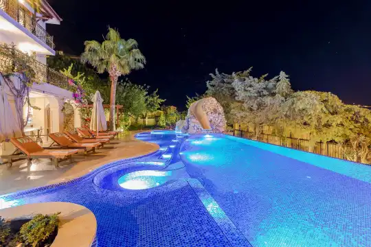 Kalkan merkezi konumda yer almaktadir. 4 yatak odali 8 kisiye kadar konaklama imkani saglayan villamizin kapali ve açik havuzu mevcuttur. Özel havuzunda kaydirak bulunan villamiz unutulmaz bir tatil imkani saglamaktadir. Villamizin içerisinde Jakuzi, Türk Hamami, Sauna, Sinema Odasi ve Spor Salonu mevcuttur. Amerikan mutfaginda ihtiyaç duyabileceginiz tüm ekipmanlar yer almakta olup konforlu mobilyalarla dizayn edilmis salonu hizmetinizdedir. Kapali havuz isitmasi 1 Ocak - 1 Mayis ve 1 Ekim - 31 Aralik tarihleri arasinda kullanima açiktir