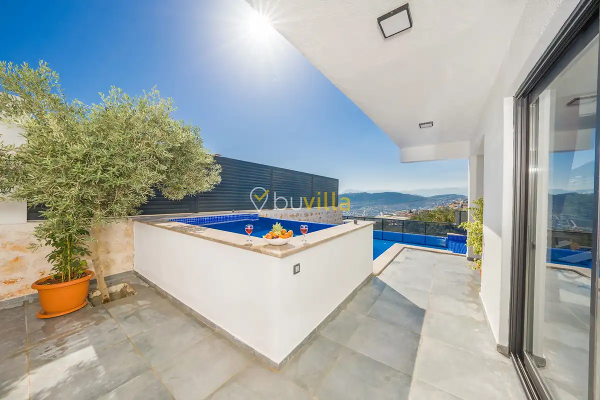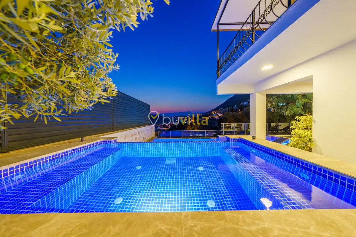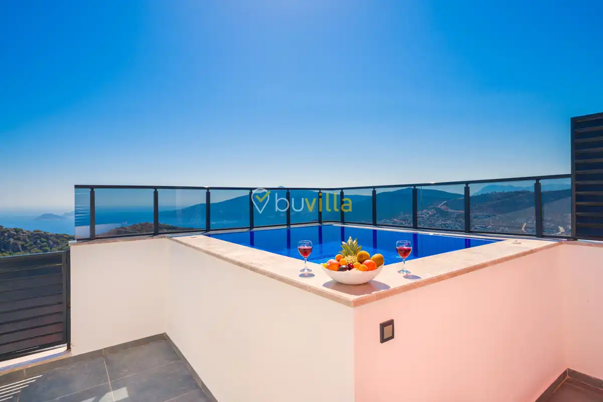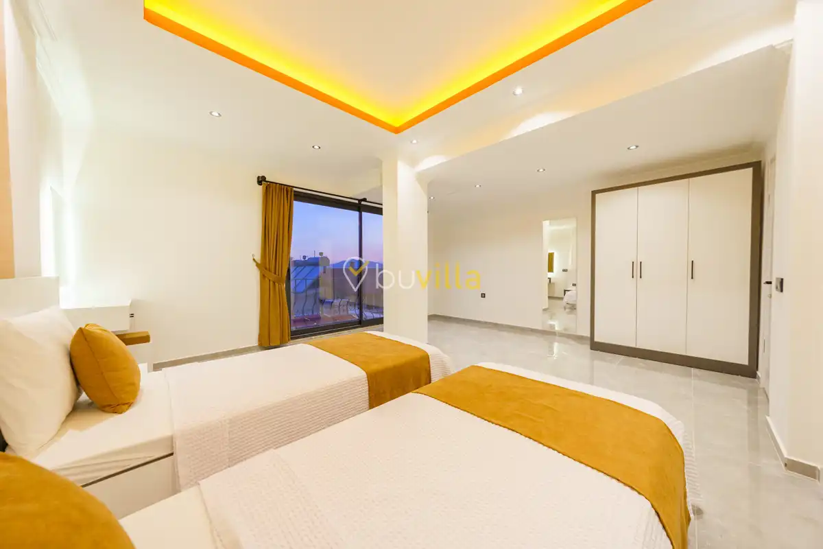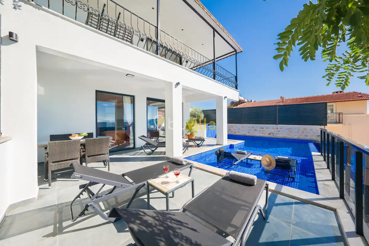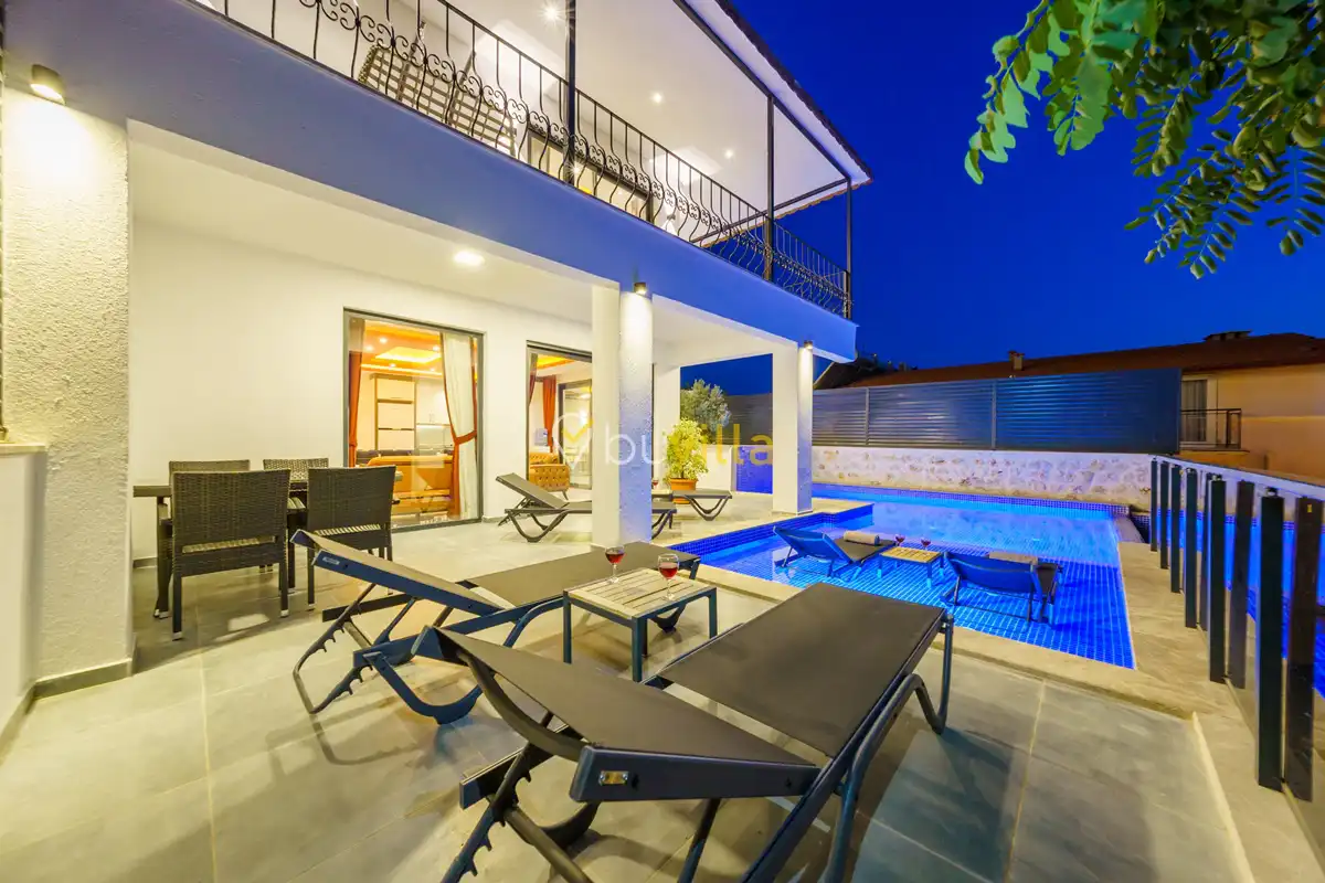 Kalkan Kördere bölgesinde 4 suit yatak odası ile 8 kişiye kadar konaklama kapasitesi sunmaktadır. Konaklama düzeni 2 adet double yatak ve 4 adet single yatak şeklindedir. Tüm yatak odalarında özel banyo ve WC bulunmakta olup, misafirlerimize konforlu ve rahat bir konaklama imkânı sağlamaktadır. Villamız yarı korunaklı yapıya sahiptir; bazı alanlar çevredeki villaların üst katlarından kısmen görülebilmektedir. Özel yüzme havuzunun bulunduğu alanda, jakuzili çocuk havuzu olarak da kullanılabilen ek bir havuz yer almaktadır. Ayrıca villamızın çatı katında, serinlemek amacıyla tasarlanmış küçük boyutlu bir yüzme havuzu da mevcuttur.