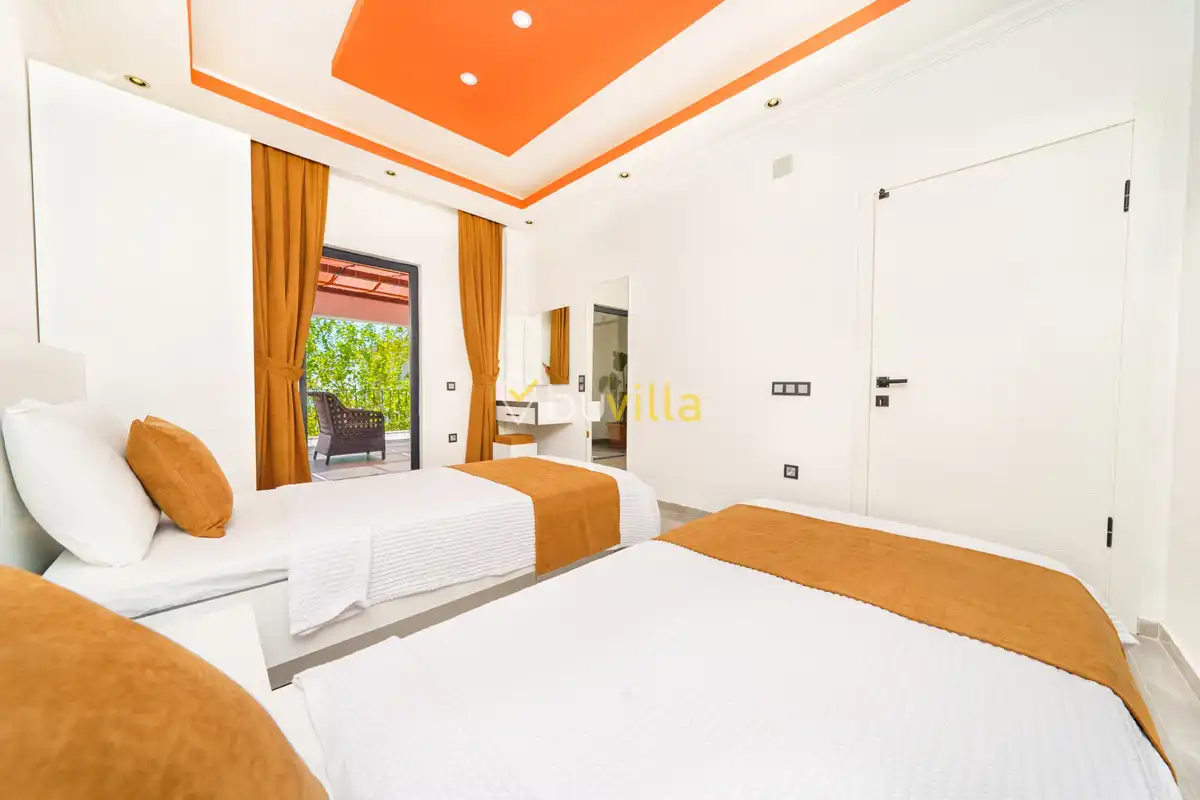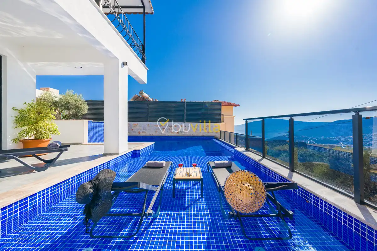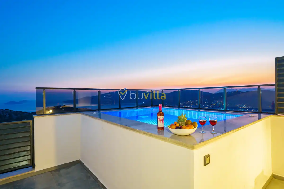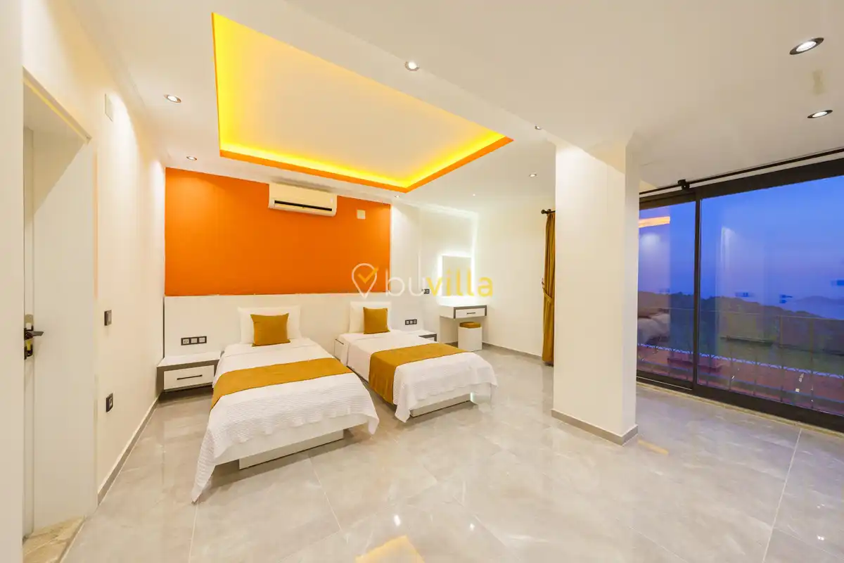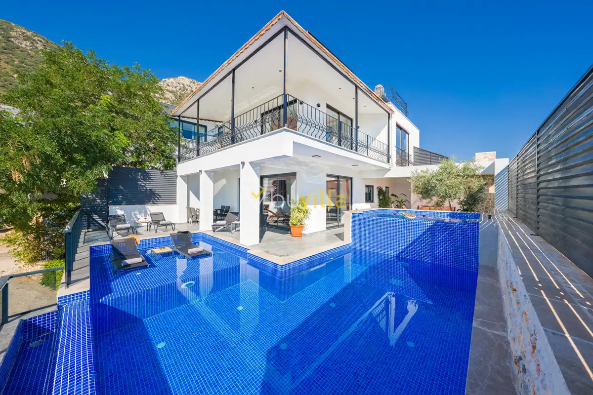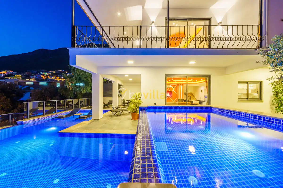 Kalkan Kördere bölgesinde 4 suit yatak odası ile 8 kişiye kadar konaklama kapasitesi sunmaktadır. Konaklama düzeni 2 adet double yatak ve 4 adet single yatak şeklindedir. Tüm yatak odalarında özel banyo ve WC bulunmakta olup, misafirlerimize konforlu ve rahat bir konaklama imkânı sağlamaktadır. Villamız yarı korunaklı yapıya sahiptir; bazı alanlar çevredeki villaların üst katlarından kısmen görülebilmektedir. Özel yüzme havuzunun bulunduğu alanda, jakuzili çocuk havuzu olarak da kullanılabilen ek bir havuz yer almaktadır. Ayrıca villamızın çatı katında, serinlemek amacıyla tasarlanmış küçük boyutlu bir yüzme havuzu da mevcuttur.