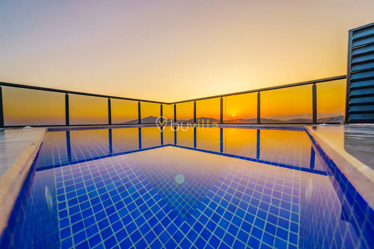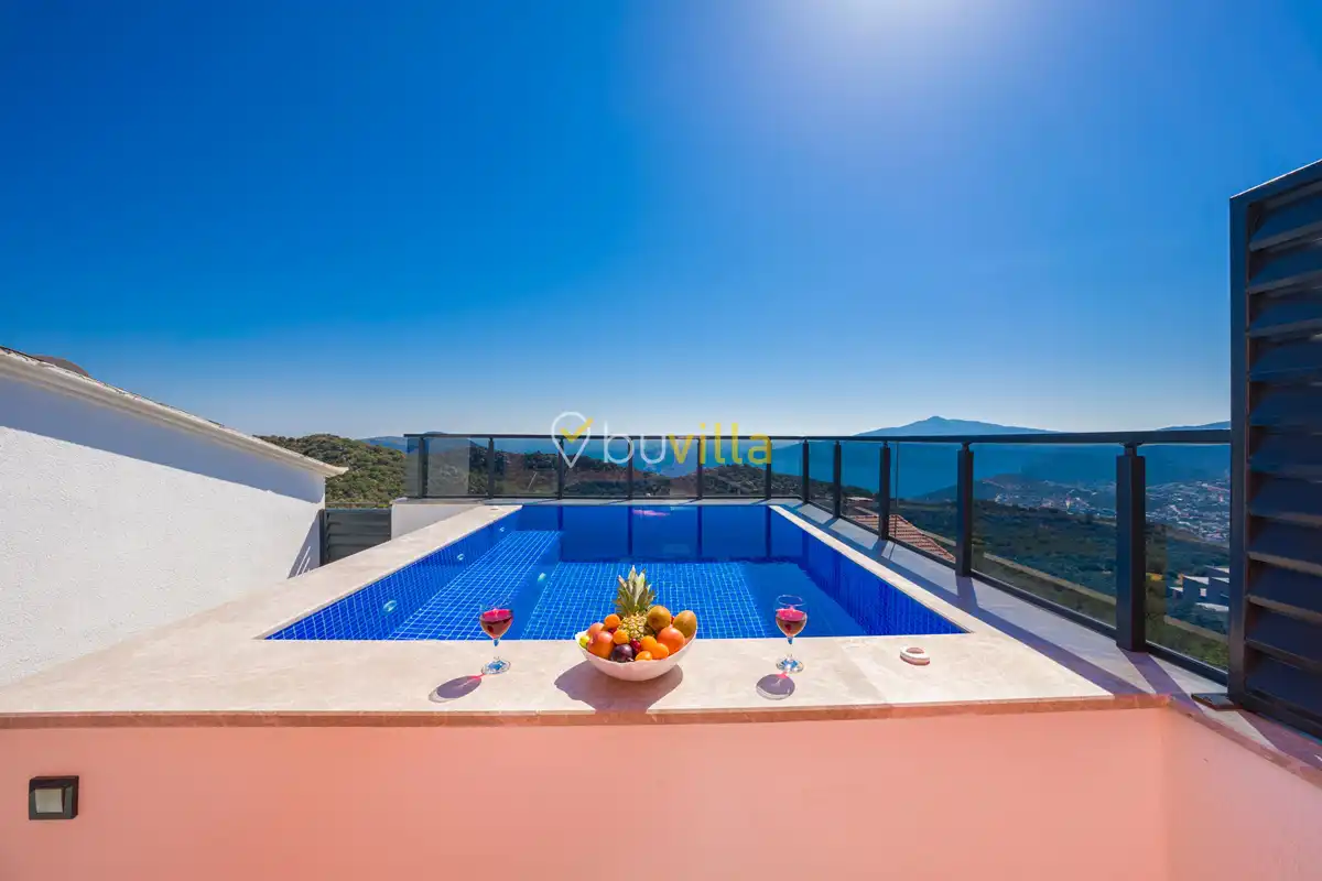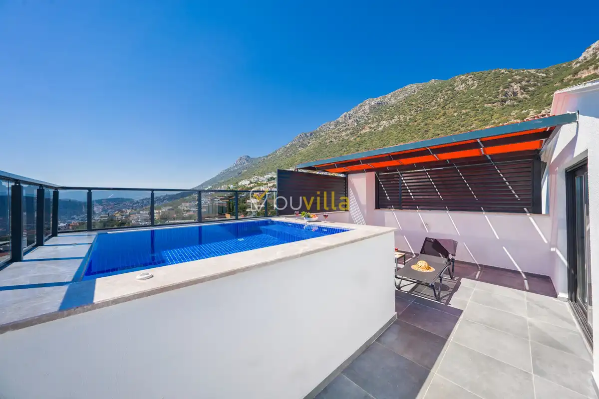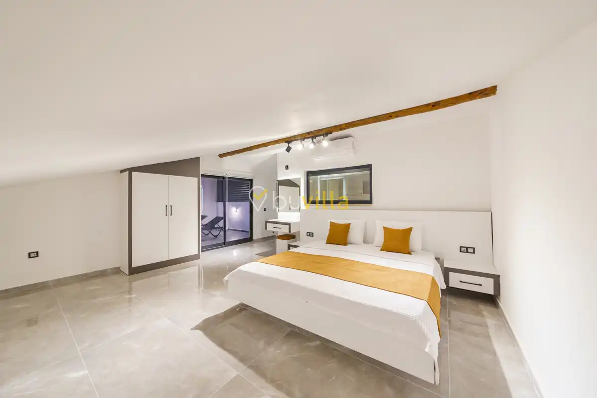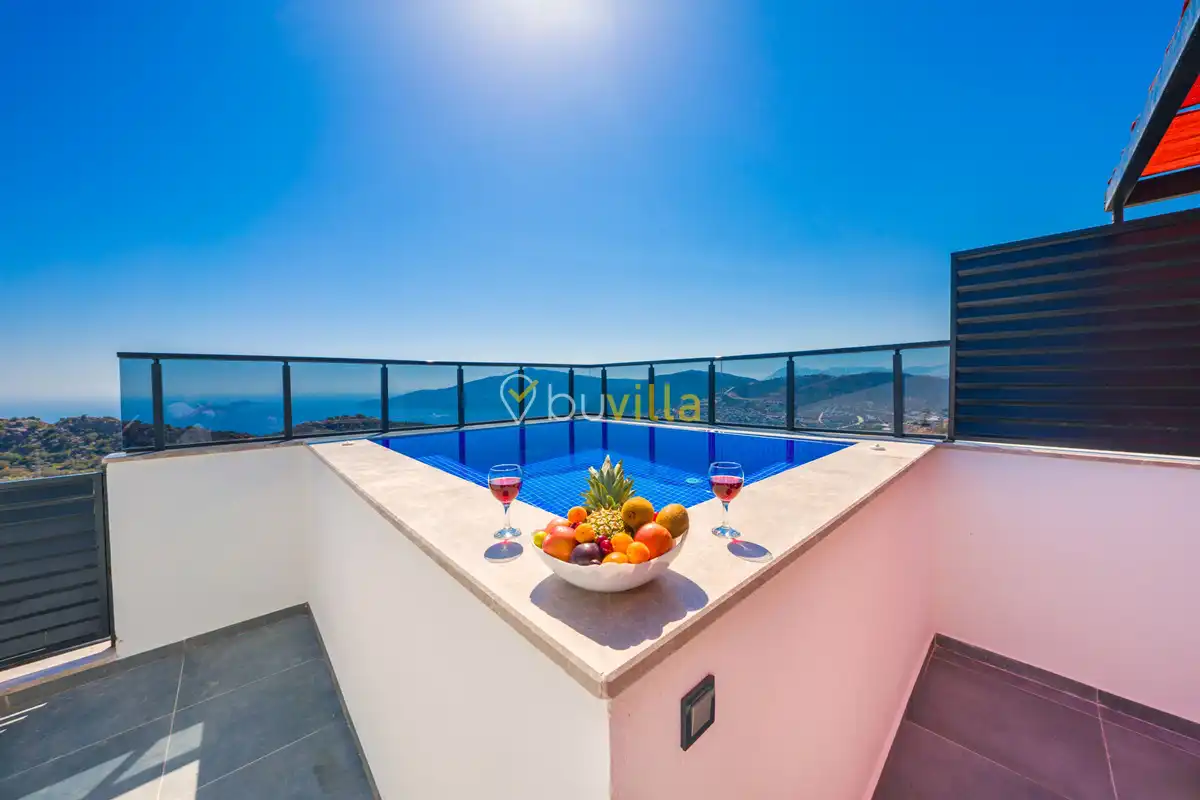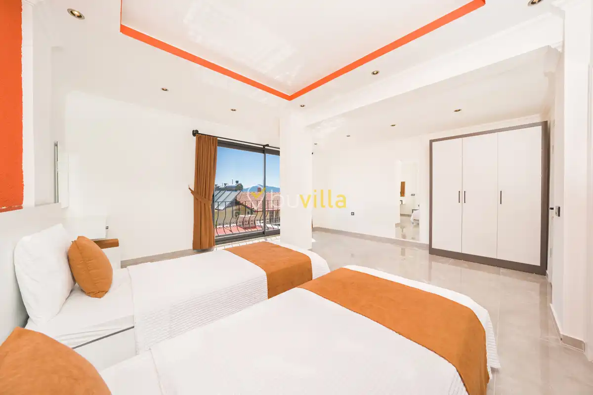 Kalkan Kördere bölgesinde 4 suit yatak odası ile 8 kişiye kadar konaklama kapasitesi sunmaktadır. Konaklama düzeni 2 adet double yatak ve 4 adet single yatak şeklindedir. Tüm yatak odalarında özel banyo ve WC bulunmakta olup, misafirlerimize konforlu ve rahat bir konaklama imkânı sağlamaktadır. Villamız yarı korunaklı yapıya sahiptir; bazı alanlar çevredeki villaların üst katlarından kısmen görülebilmektedir. Özel yüzme havuzunun bulunduğu alanda, jakuzili çocuk havuzu olarak da kullanılabilen ek bir havuz yer almaktadır. Ayrıca villamızın çatı katında, serinlemek amacıyla tasarlanmış küçük boyutlu bir yüzme havuzu da mevcuttur.