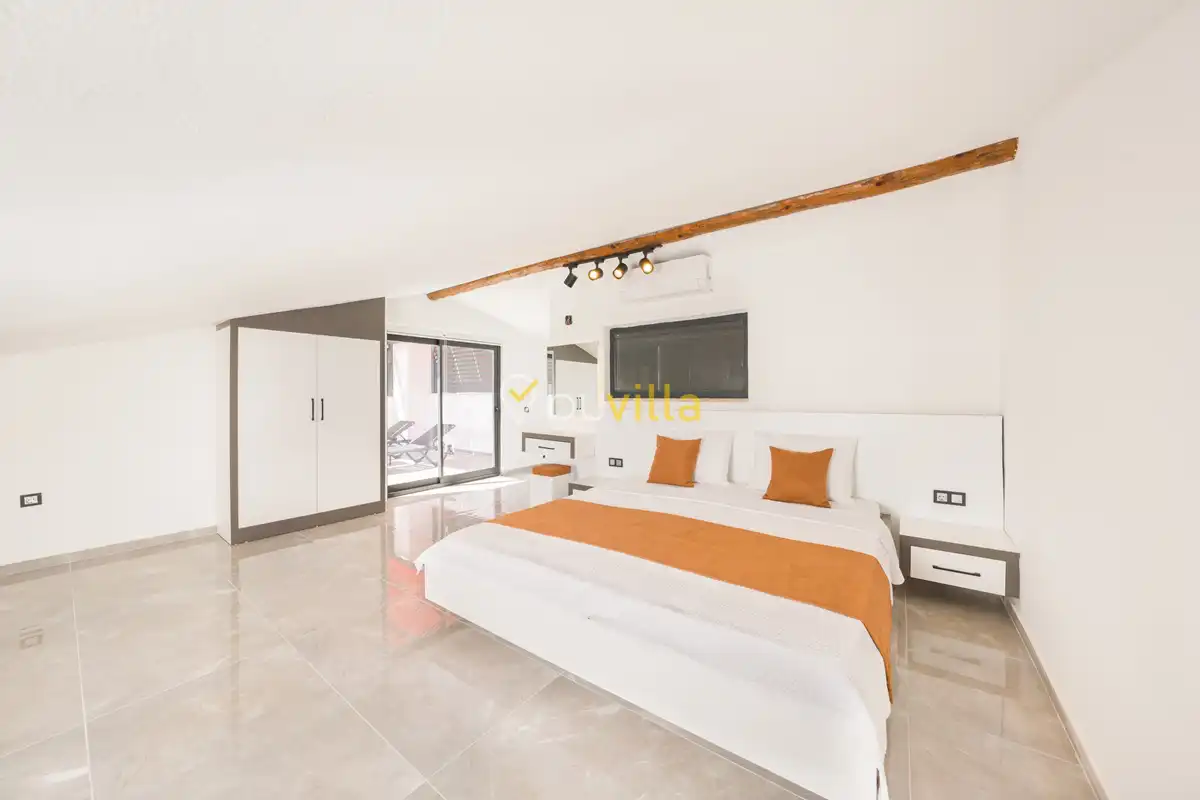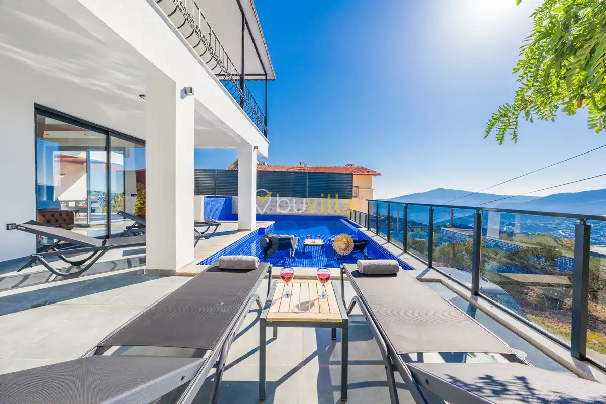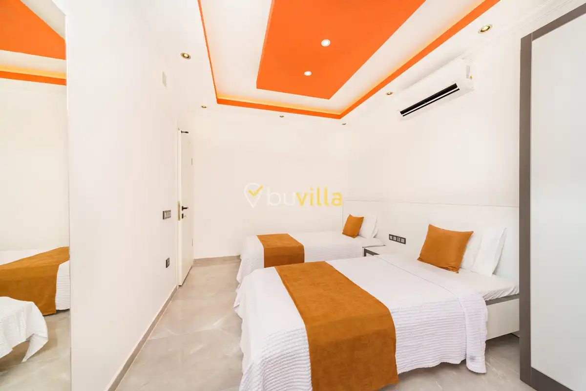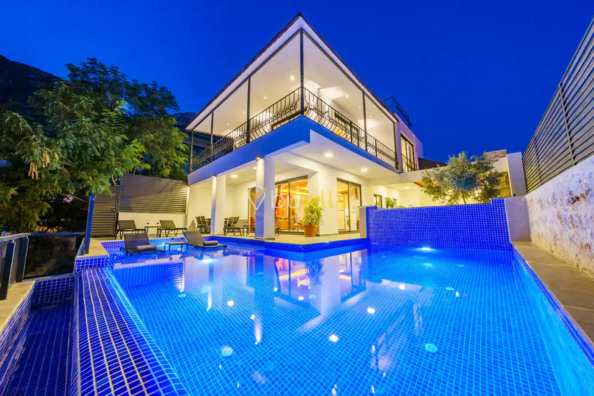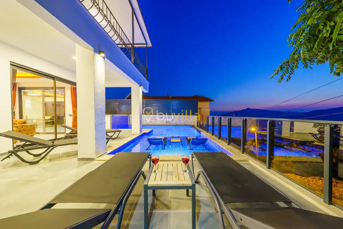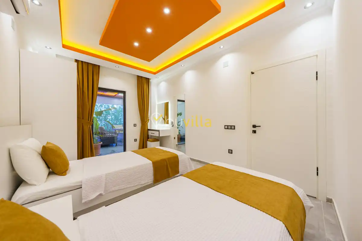 Kalkan Kördere bölgesinde 4 suit yatak odası ile 8 kişiye kadar konaklama kapasitesi sunmaktadır. Konaklama düzeni 2 adet double yatak ve 4 adet single yatak şeklindedir. Tüm yatak odalarında özel banyo ve WC bulunmakta olup, misafirlerimize konforlu ve rahat bir konaklama imkânı sağlamaktadır. Villamız yarı korunaklı yapıya sahiptir; bazı alanlar çevredeki villaların üst katlarından kısmen görülebilmektedir. Özel yüzme havuzunun bulunduğu alanda, jakuzili çocuk havuzu olarak da kullanılabilen ek bir havuz yer almaktadır. Ayrıca villamızın çatı katında, serinlemek amacıyla tasarlanmış küçük boyutlu bir yüzme havuzu da mevcuttur.