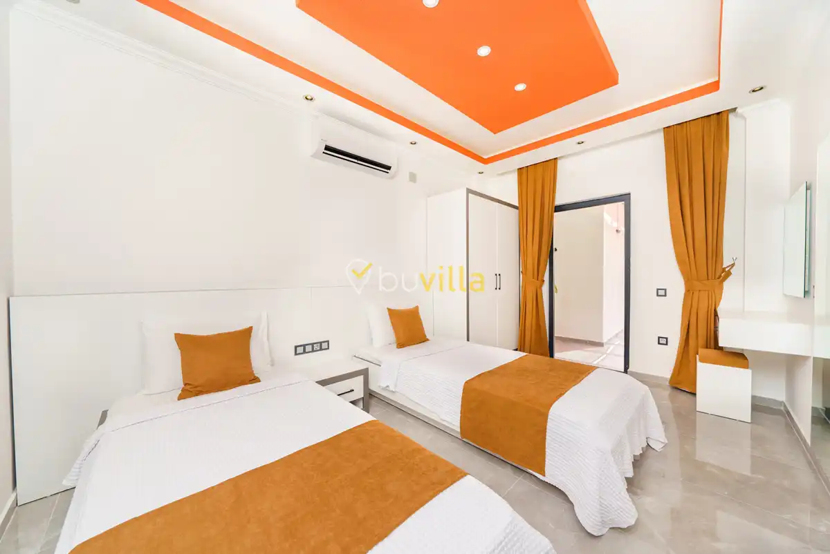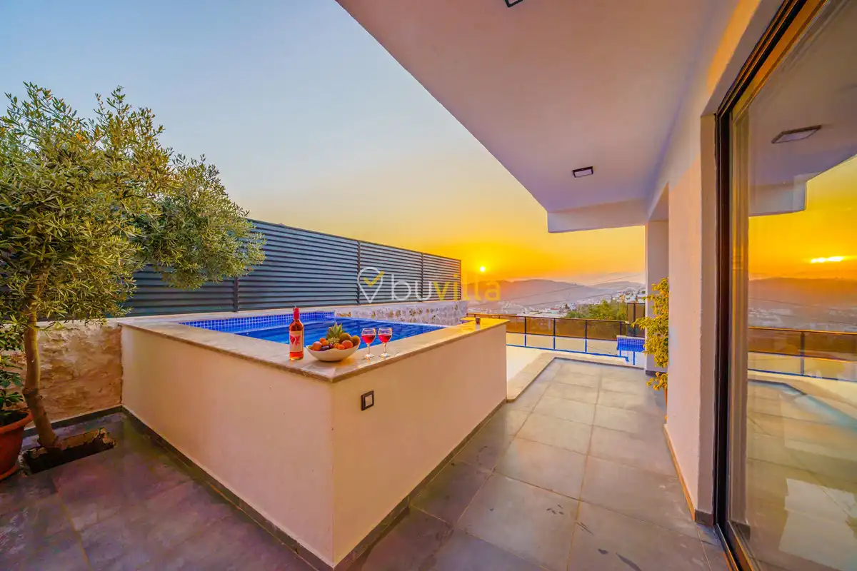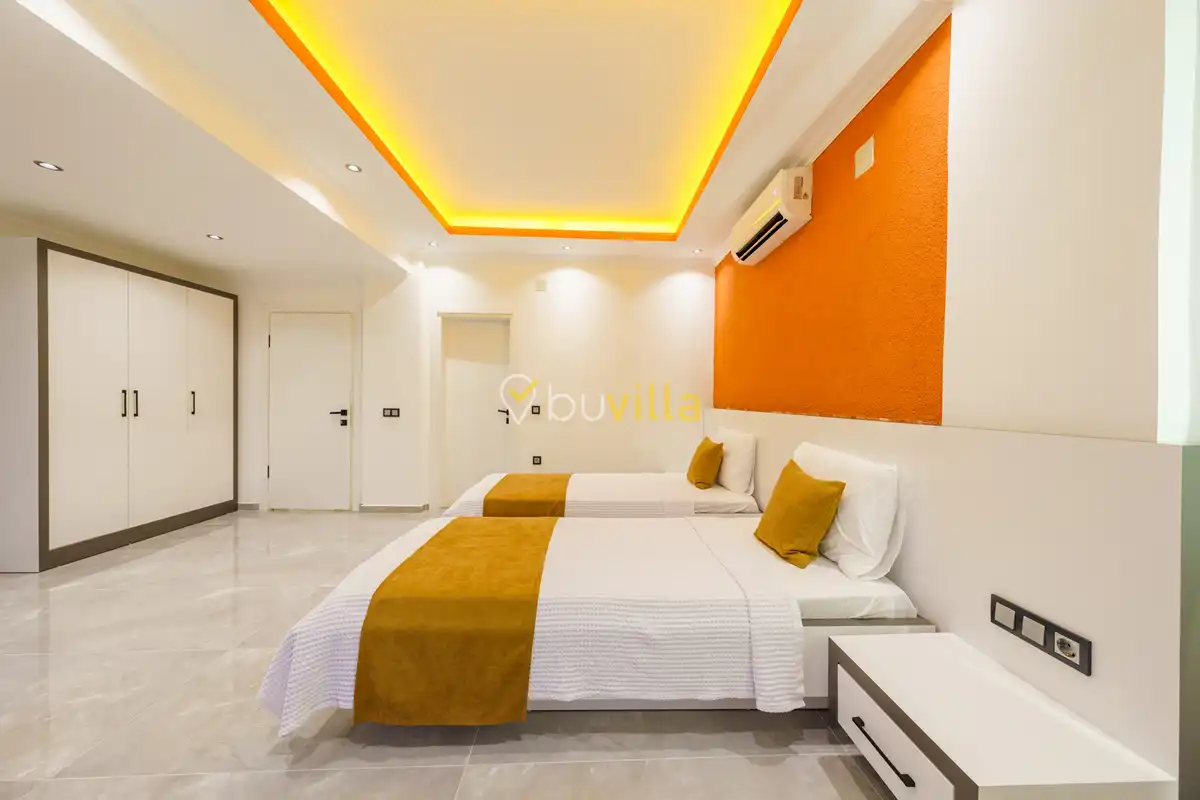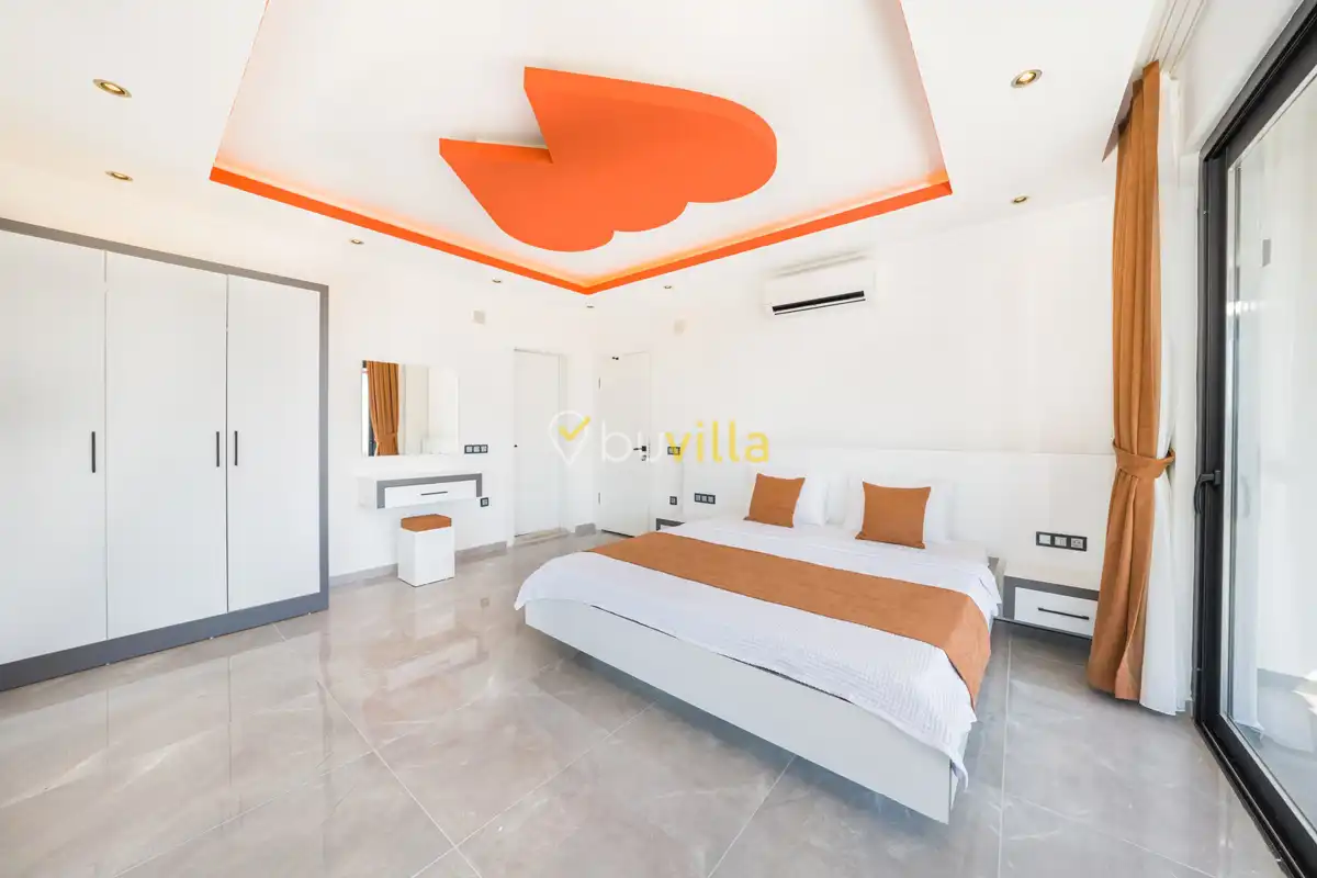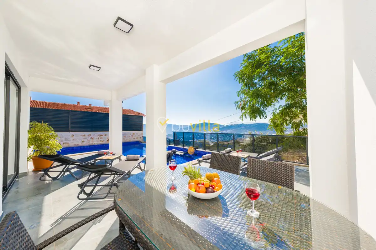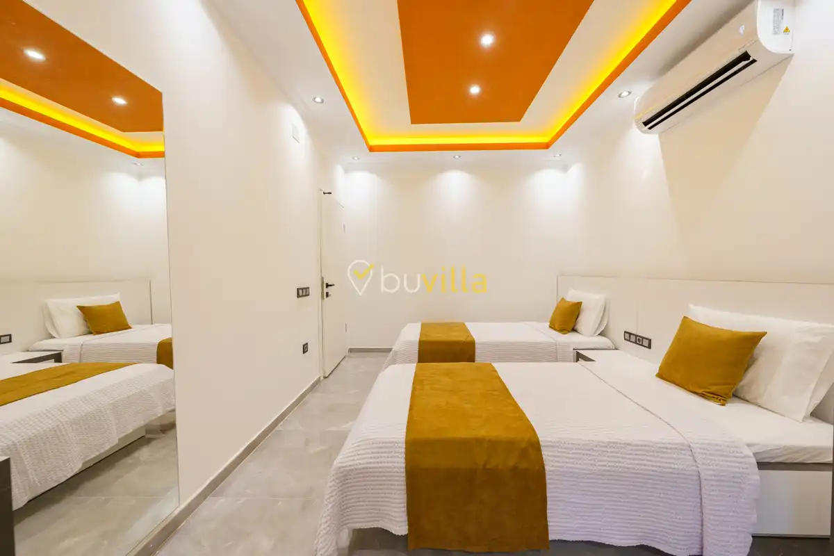 Kalkan Kördere bölgesinde 4 suit yatak odası ile 8 kişiye kadar konaklama kapasitesi sunmaktadır. Konaklama düzeni 2 adet double yatak ve 4 adet single yatak şeklindedir. Tüm yatak odalarında özel banyo ve WC bulunmakta olup, misafirlerimize konforlu ve rahat bir konaklama imkânı sağlamaktadır. Villamız yarı korunaklı yapıya sahiptir; bazı alanlar çevredeki villaların üst katlarından kısmen görülebilmektedir. Özel yüzme havuzunun bulunduğu alanda, jakuzili çocuk havuzu olarak da kullanılabilen ek bir havuz yer almaktadır. Ayrıca villamızın çatı katında, serinlemek amacıyla tasarlanmış küçük boyutlu bir yüzme havuzu da mevcuttur.