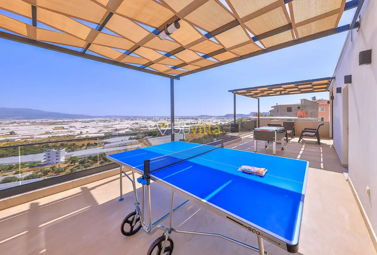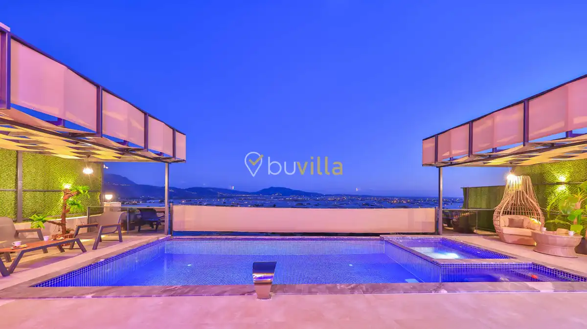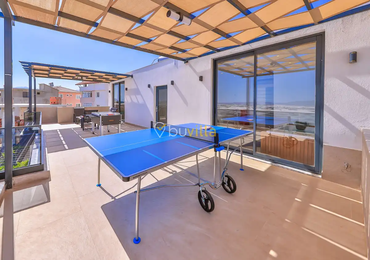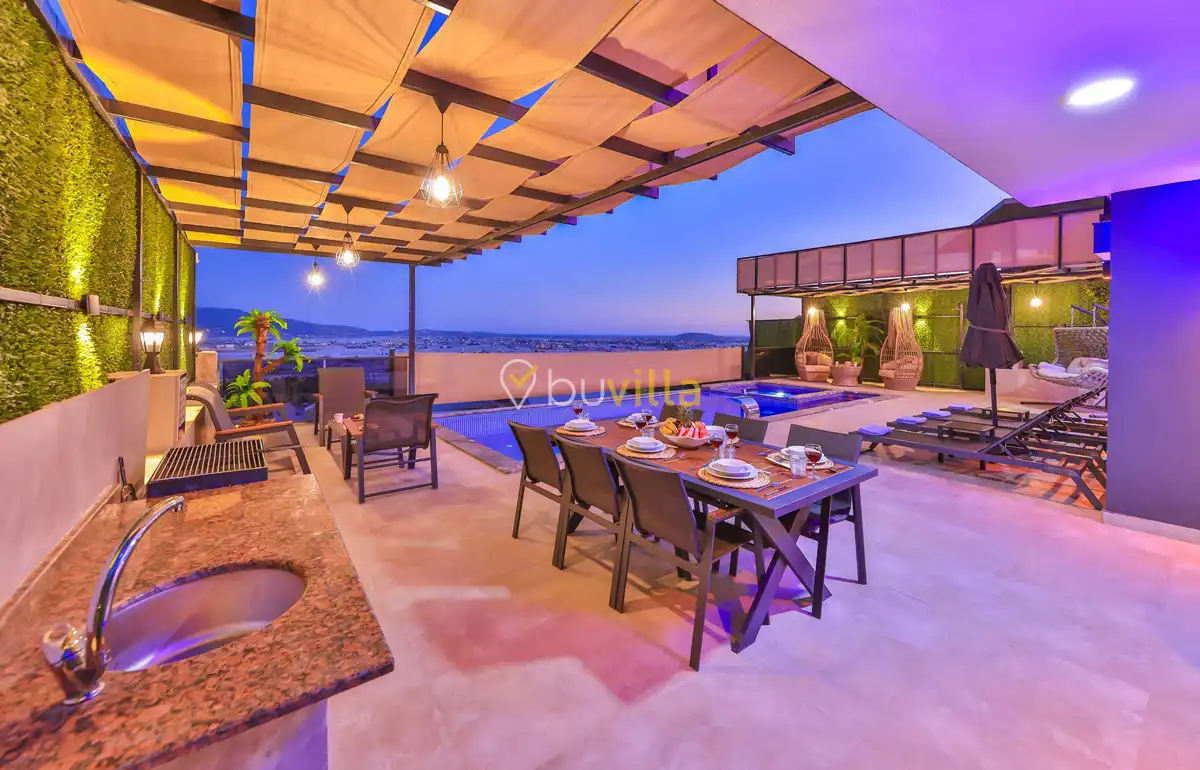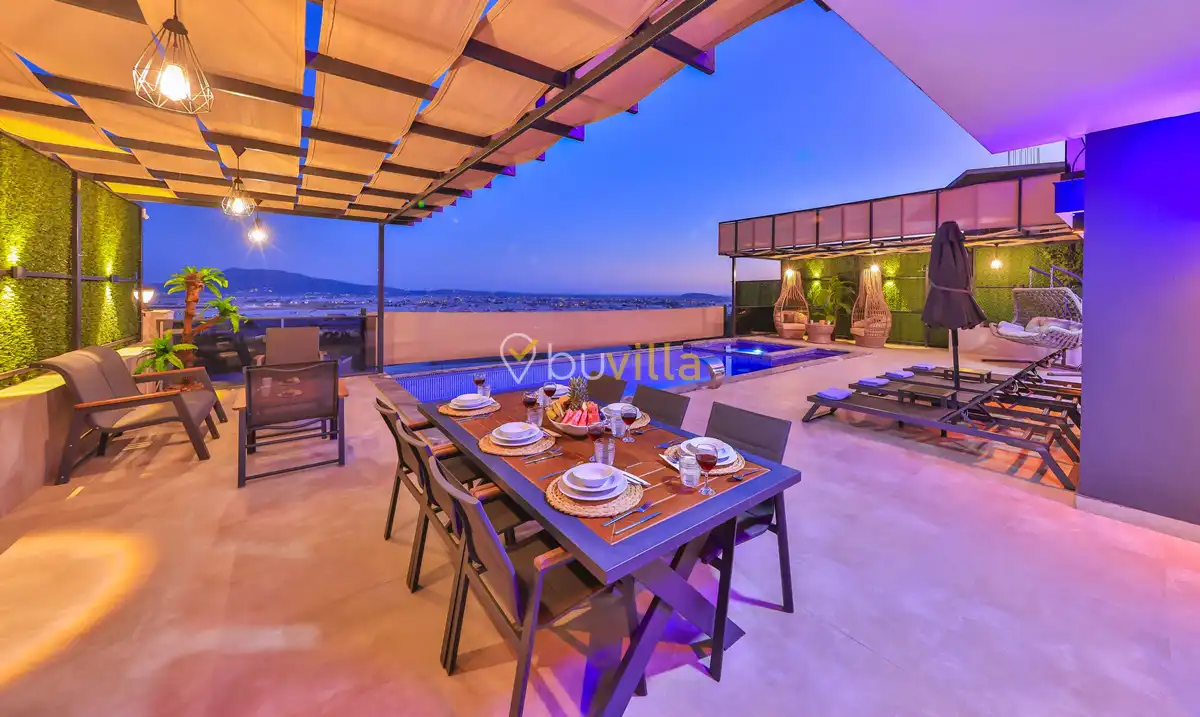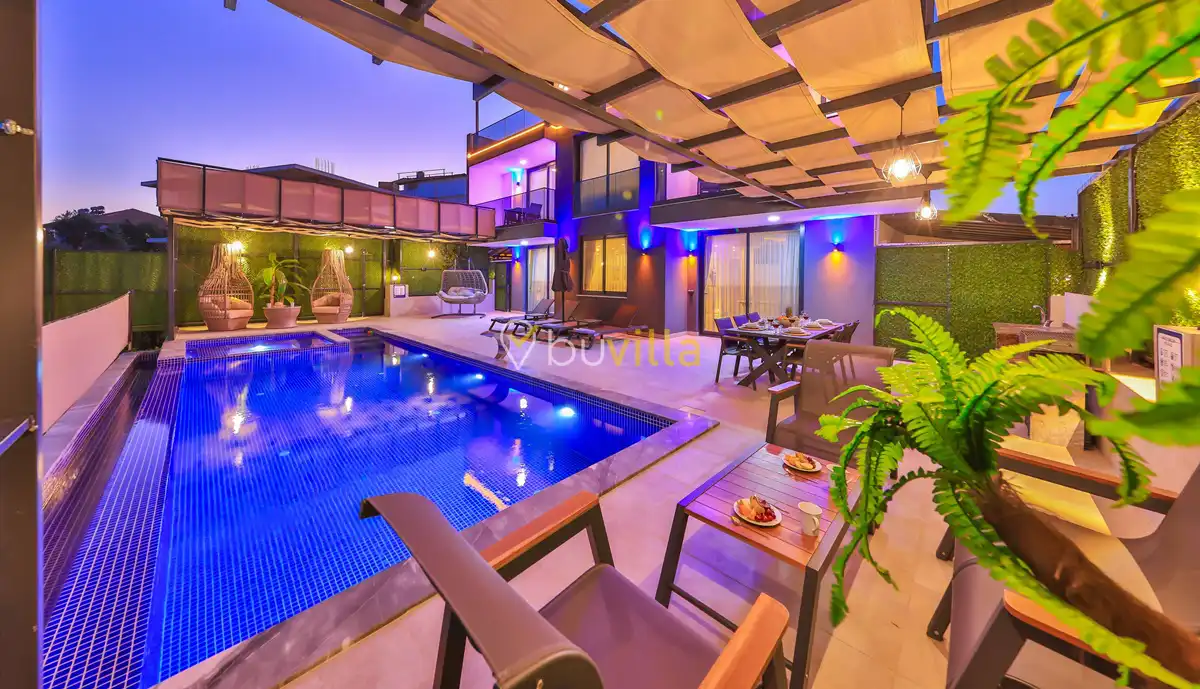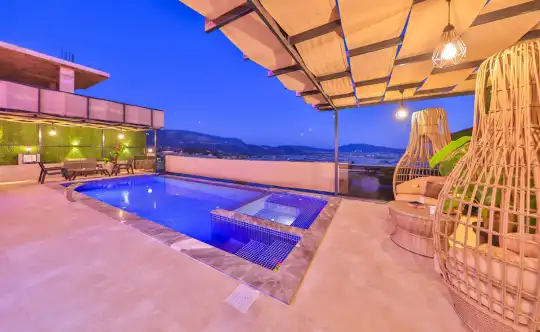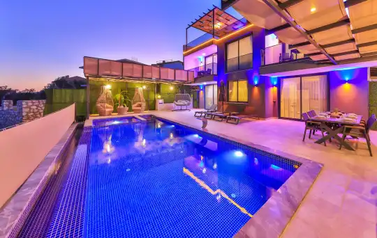Modern dizayn edilmiş 3 yatak odasına ve 5 banyoya sahip olan triplex villamız, geniş ailelere uygun şekilde her ince ayrıntısı düşünülerek tasarlanmıştır. Villamızın 3. katında sauna ve jakuzi bulunmaktadır. Korunaklı havuz alanı ve geniş bahçe terasında akşamları keyifli vakit geçirebilmeniz için langırt ve masa tenisi yer almaktadır.