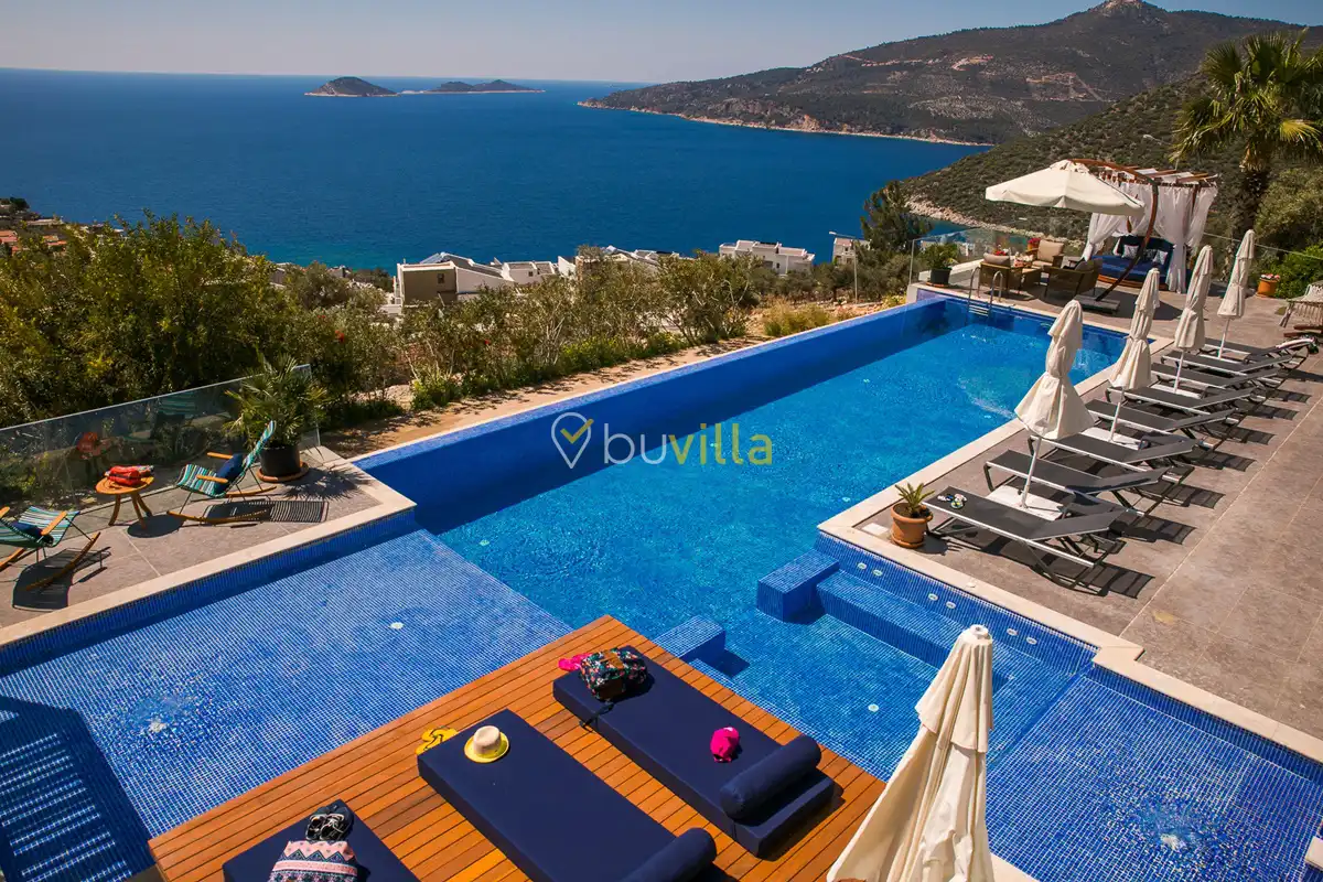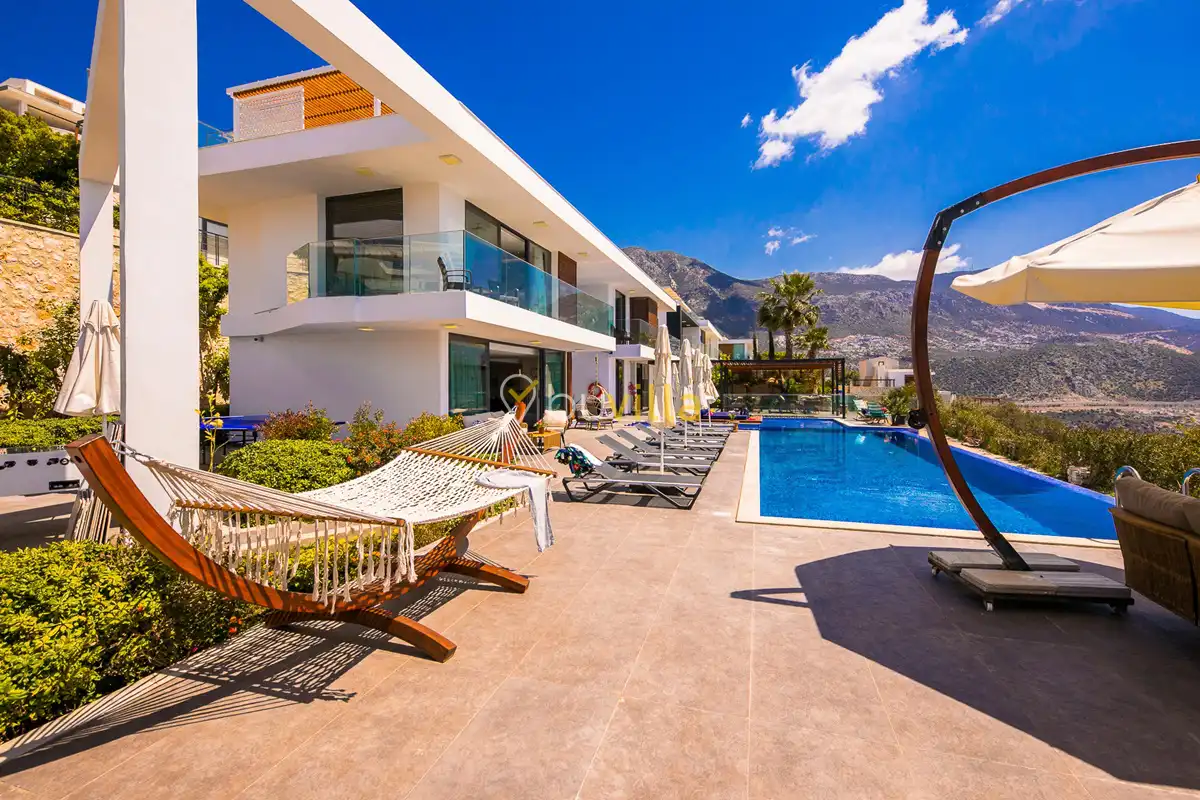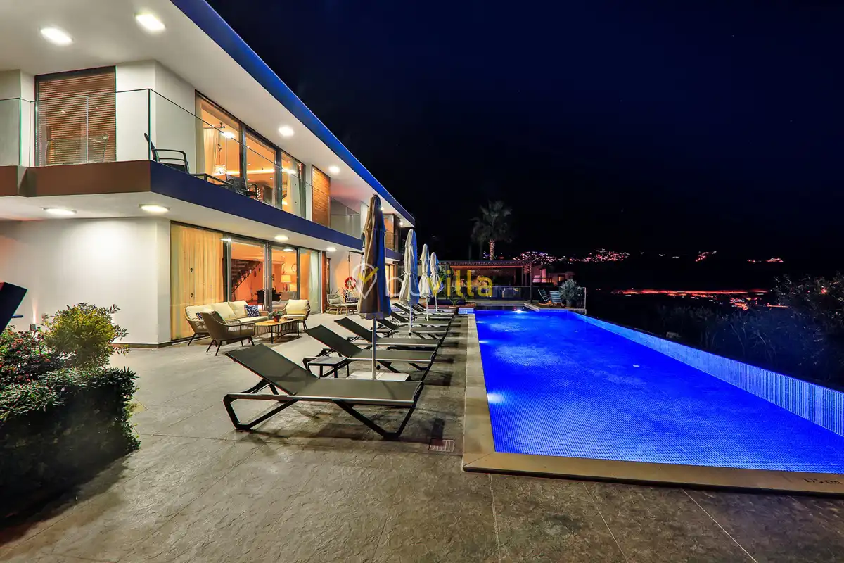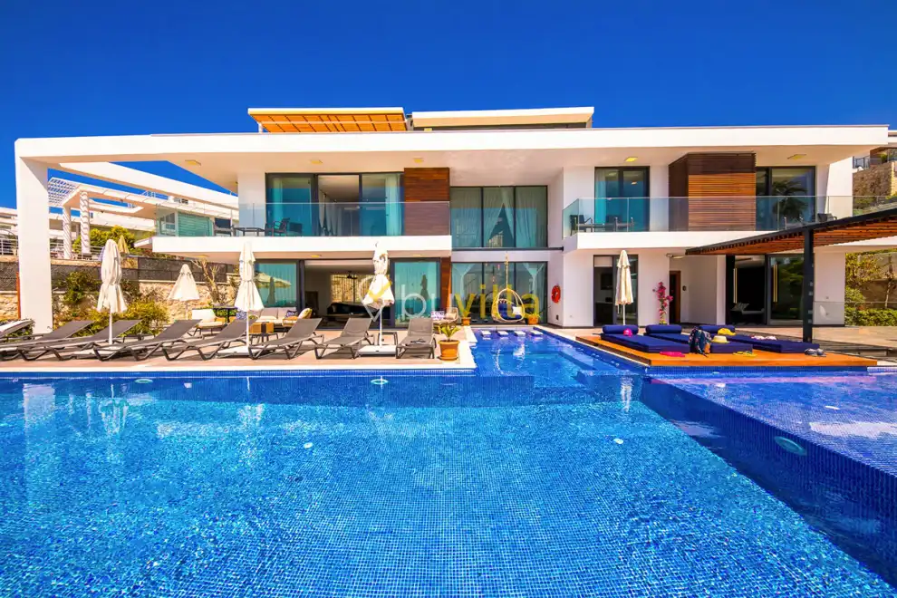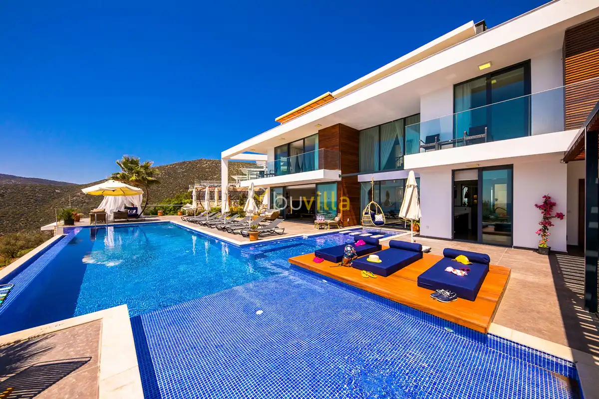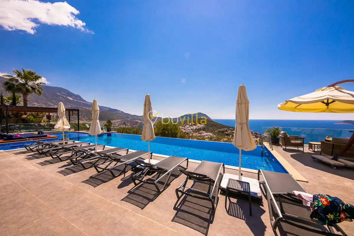 Deniz Manzarali Lüks Villa Kiralik Villa Lapis , Kalkan Kalamar mevkinde bulunan 4 yatak odali 8 kisi kapasiteli lüks bir villadir. Kiralik villamizin tüm yatak odalarinda kendilerine ait tuvalet ve banyo mevcut olup ebeveyn yatak odasinin bir tanesinde hos bir jakuzi sizleri beklemektedir. Lüks dizayni ile göz dolduran villamizin tam donanimli Amerikan mutfaginda ihtiyaç duyabileceginiz tüm ekipmanlar mevcuttur. Havuz bahçe katindan panoramik deniz manzarasina sahip villamizin büyük bir özel yüzme havuzu bulunmaktadir. Villamizda keyifli vakit geçirmek için langirt , masa tenisi bulunmaktadir. Sevdikleriniz ile gözlerden uzak huzurlu vakitler geçirmek için sizleri Villa Lapis ’ e bekliyoruz.