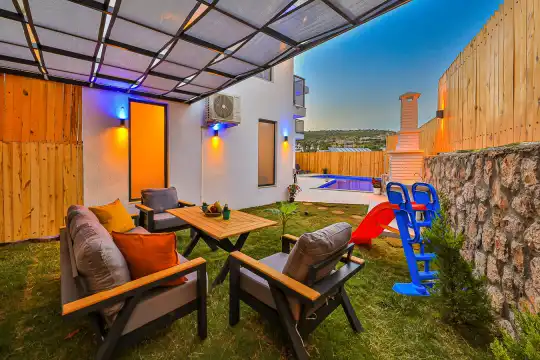 Doga Içinde Villa Kiralik Villa Metaverse , Kalkan Patara mevkiinde yer almakta oluop 4 kisiye kadar konaklama imkani sunmaktadir. Kiralik villamizin kapali isitmali havuzu mevcut olup kis aylari içinde ideal bir seçenektir. Havuz kati korunakli villamizin Amerikan mutfaginda ihtiyaç duyabileceginiz ekipmanlar mevcut olup konforlu mobilyalarla dizayn edilmis salonu hizmetinizdedir.