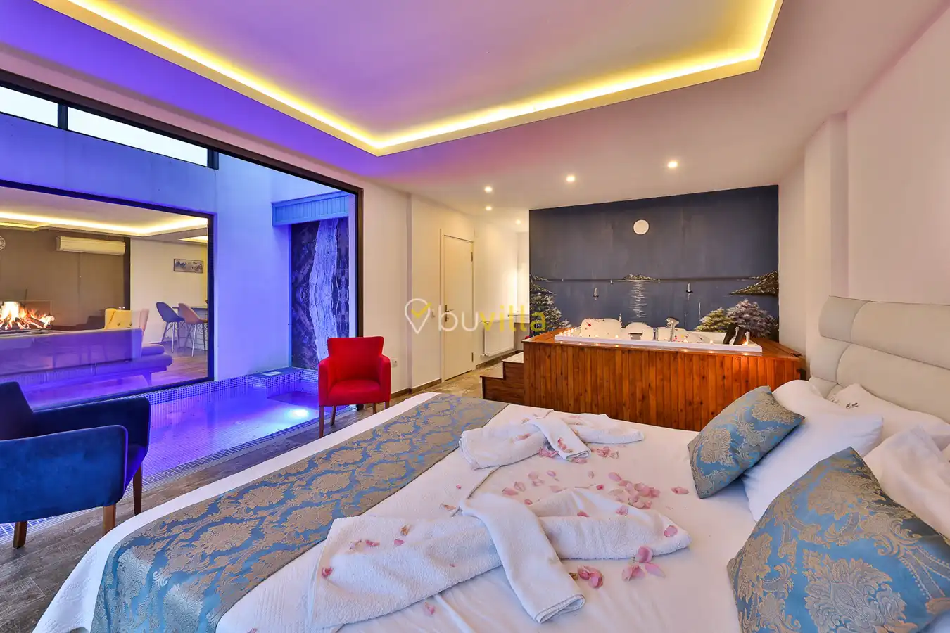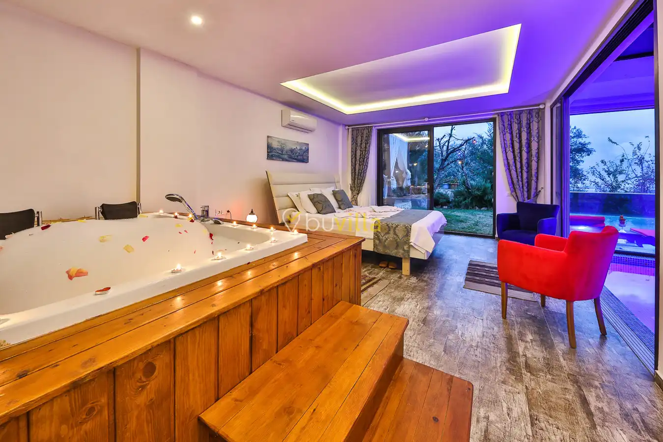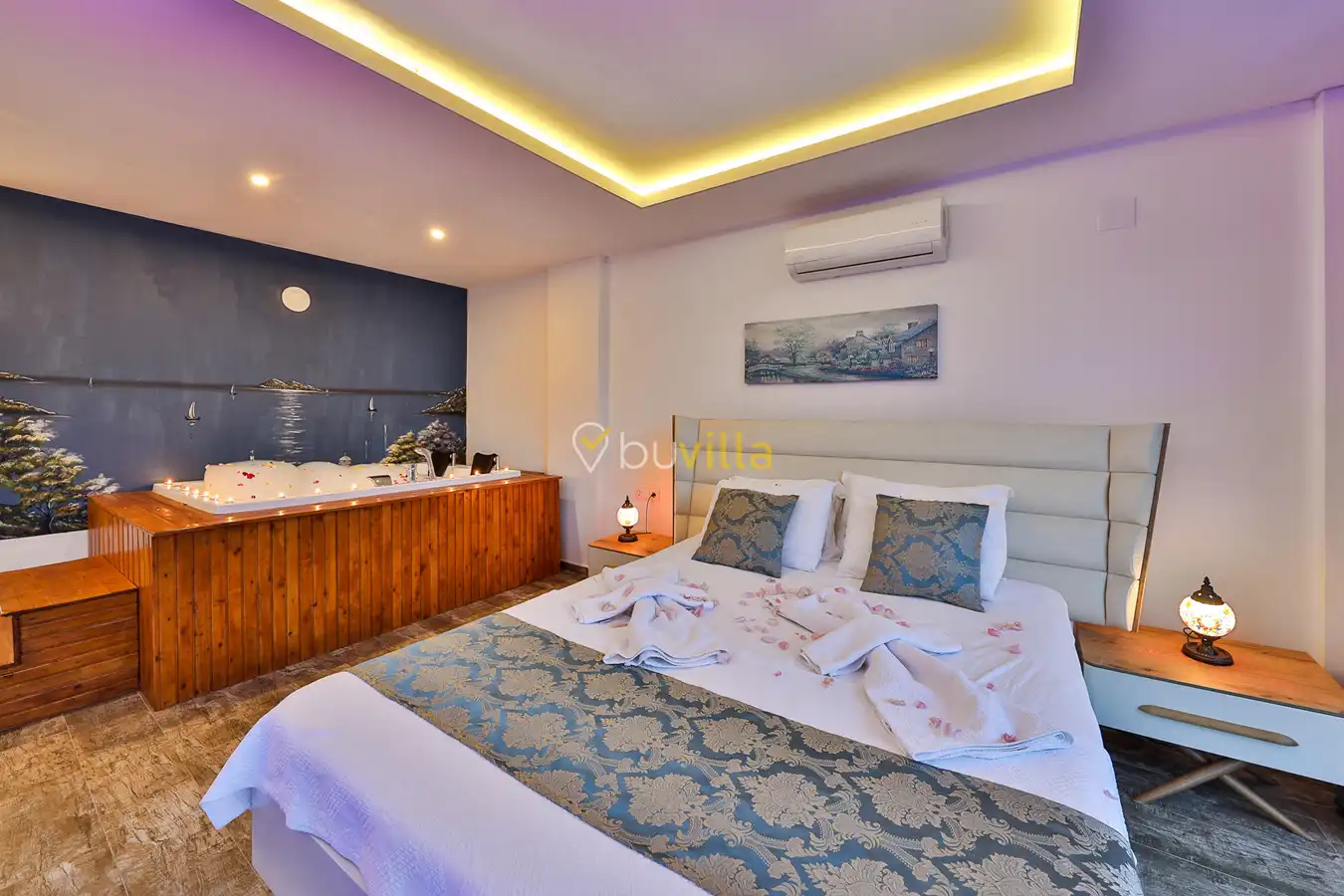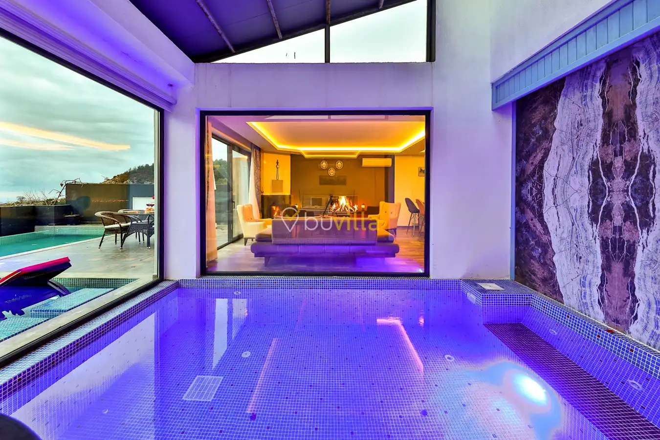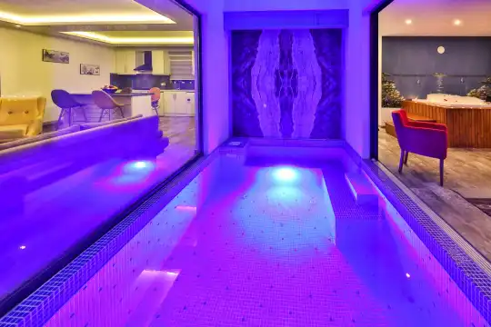 Villanın öne çıkan özellikleri arasında modern ve şık tasarımı, tam donanımlı yaşam alanları ve çiftlerin ihtiyaç duyabileceği tüm olanakların eksiksiz bir şekilde sağlanmış olması yer alır. Jakuzi, kapalı ve ısıtmalı yüzme havuzu gibi lüks detaylar tatilinizi unutulmaz kılarken, yerden ısıtma, petekli ısıtma sistemi ve aktif kullanımlı şömine sayesinde her mevsim konforlu bir tatil geçirebilirsiniz.