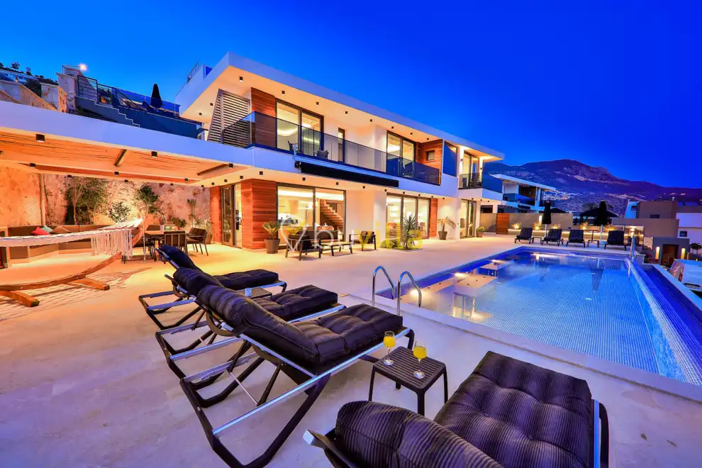 Deniz Manzarali Lüks Kiralik Villa Nymphe, Kas Kalkan Kalamar mevkiinde 8 kisi kapasiteli villamiz genis ailelere uygundur. Muhtesem denize manzarasi ve lüks dizayni ile muhtesem bir tatil imkani sunmaktadir. 4 yatak odali villamizin tüm odalari suit oda sekilndedir deniz manzarasina hakimdir. Unutulmaz bir tatil için Villa Nymphe siz degerli misafirlerini agirlamayi bekliyor.