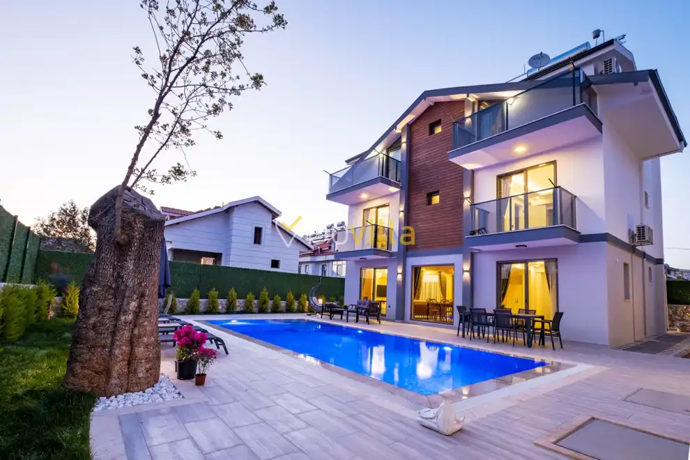 Özel Havuzlu Villa Kiralik Villa Olin 2 , Fethiye Hisarönü mevkiinde yer almaktadir. 4 yatak odali 8 kisiye kadar konaklama imkani saglamaktadir. Merkeze oldukça yakin konumda yer alan villamiz kalabalik aile ve arkadas gruplari için ideal bir seçenektir. Amerikan mutfaginda ihtiyaç duyabileceginiz ekipmanlar mevcut olup konforlu mobilyalarla dizayn edilmis salonu hizmetinizdedir. Çocuk Havuzu Ölçüleri: Uzunluk 2m - Genislik 1m - Derinlik 0,40cm