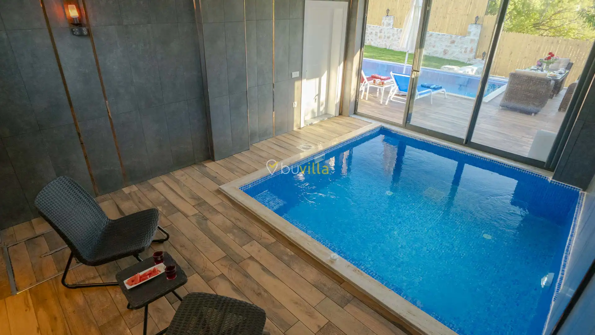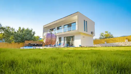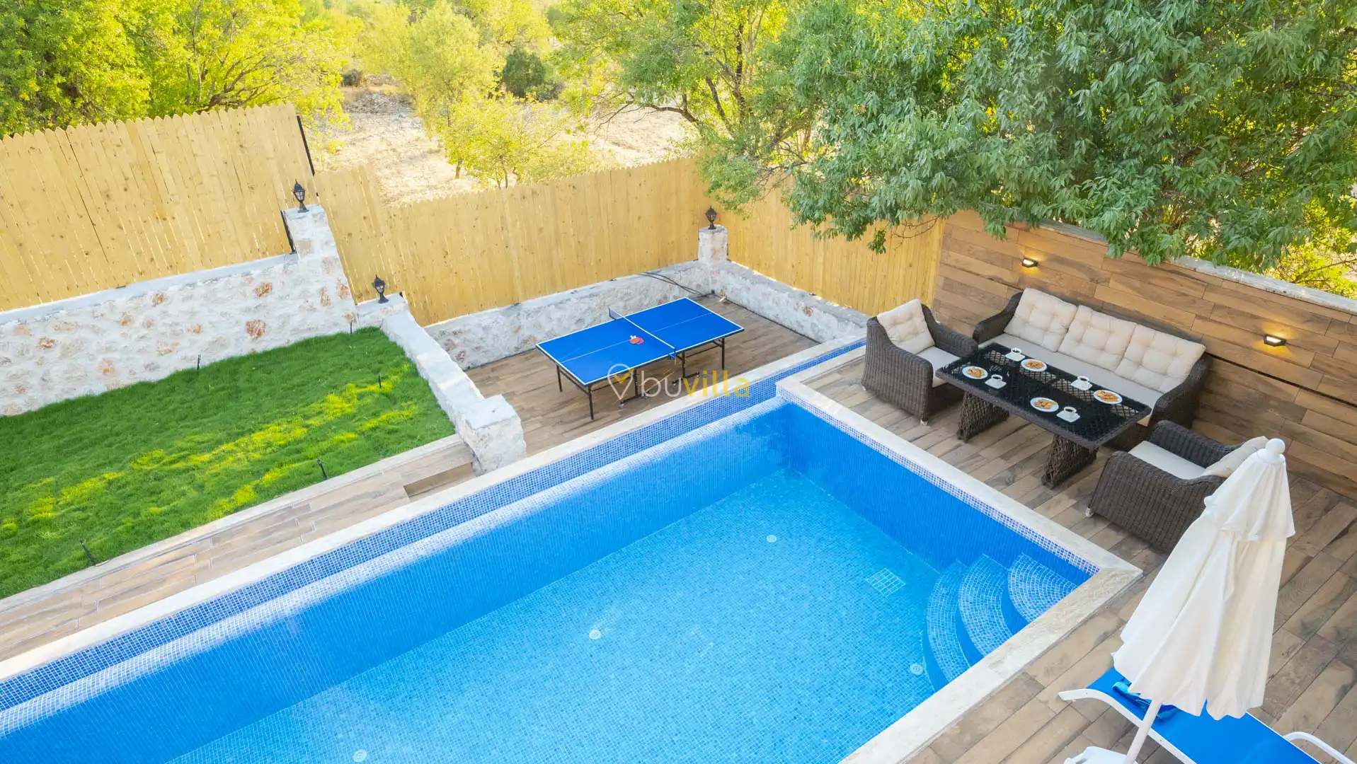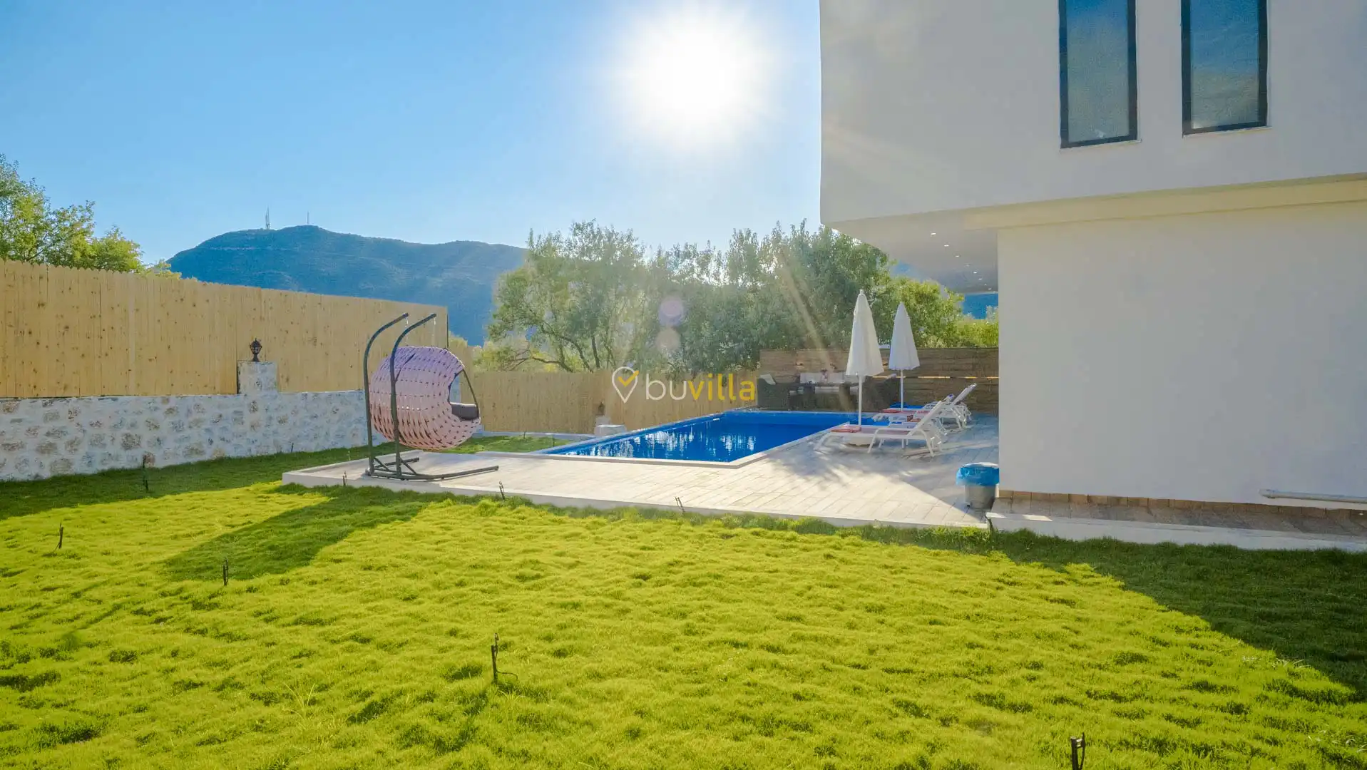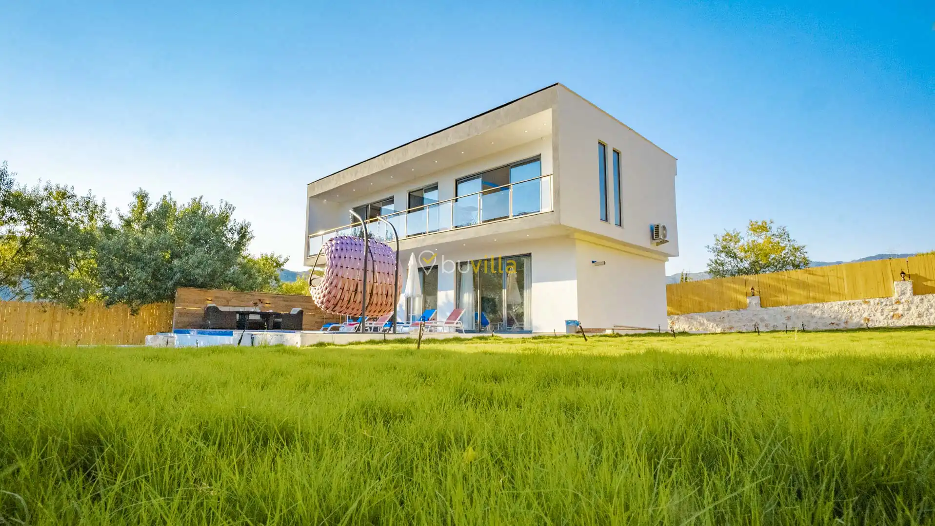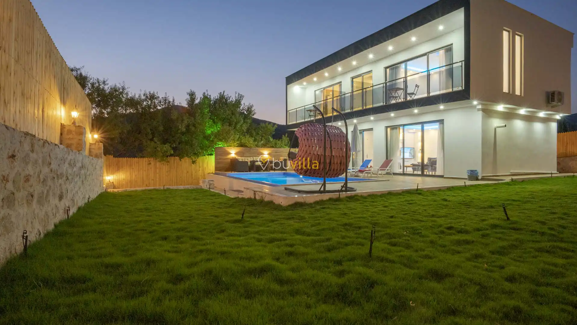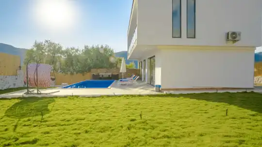 Korunaklı ve geniş bahçe alanında; özel yüzme havuzu, şezlonglar, güneş şemsiyeleri, salıncak, oturma köşesi, masa tenisi, yemek masası ve barbekü alanı bulunmaktadır. İç mekânda yer alan jakuzi ve kapalı ısıtmalı havuz, tatilinize ekstra konfor ve keyif katar.